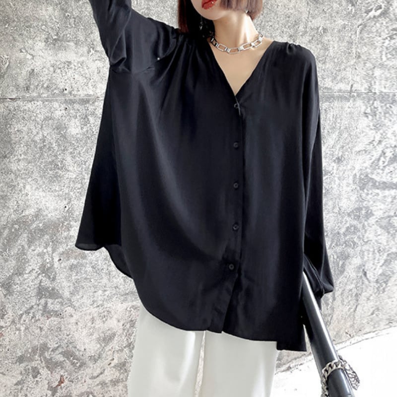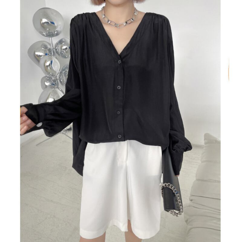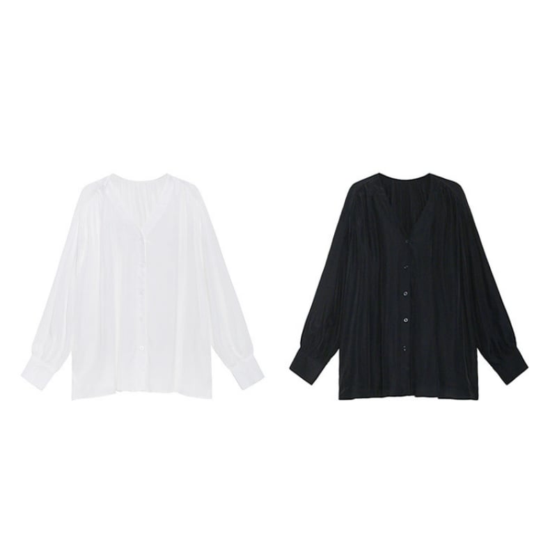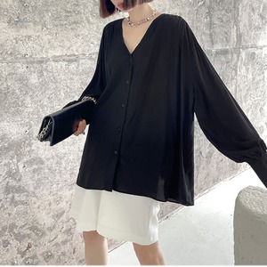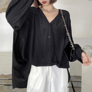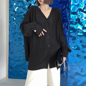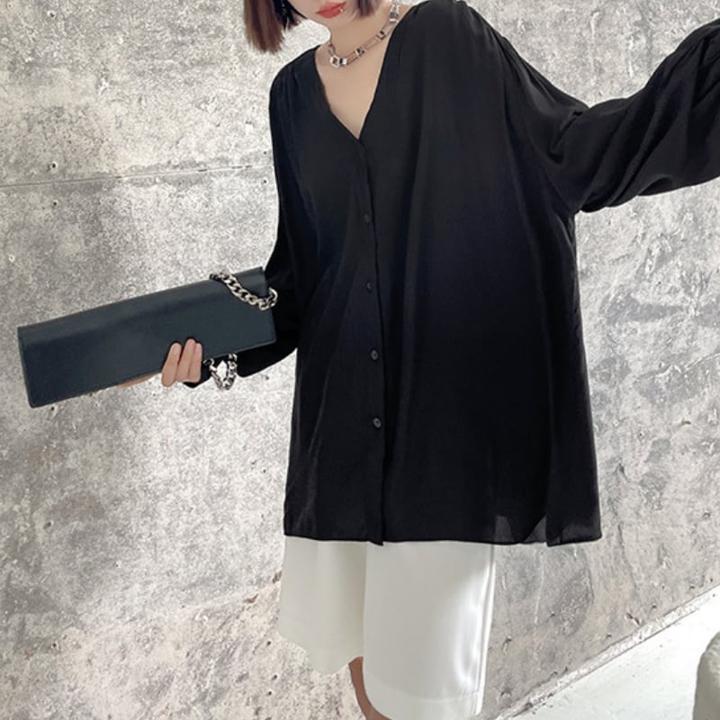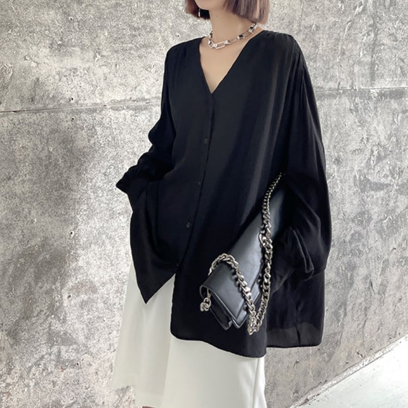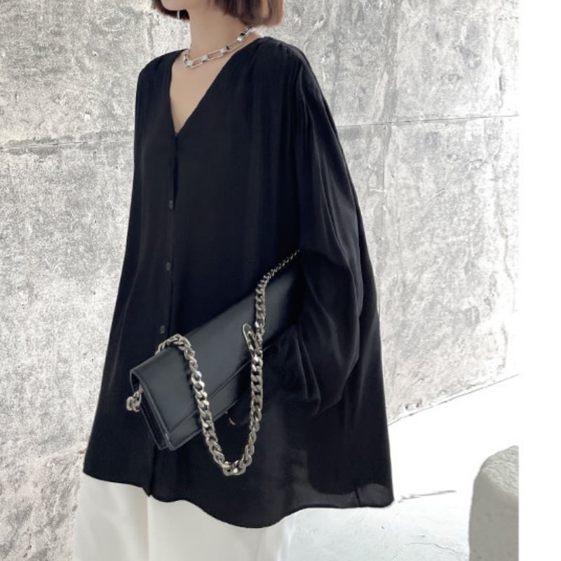 深く開いたVネックが、顔周りをすっきりと見せ、抜け感のある女性らしいデコルテを演出します。