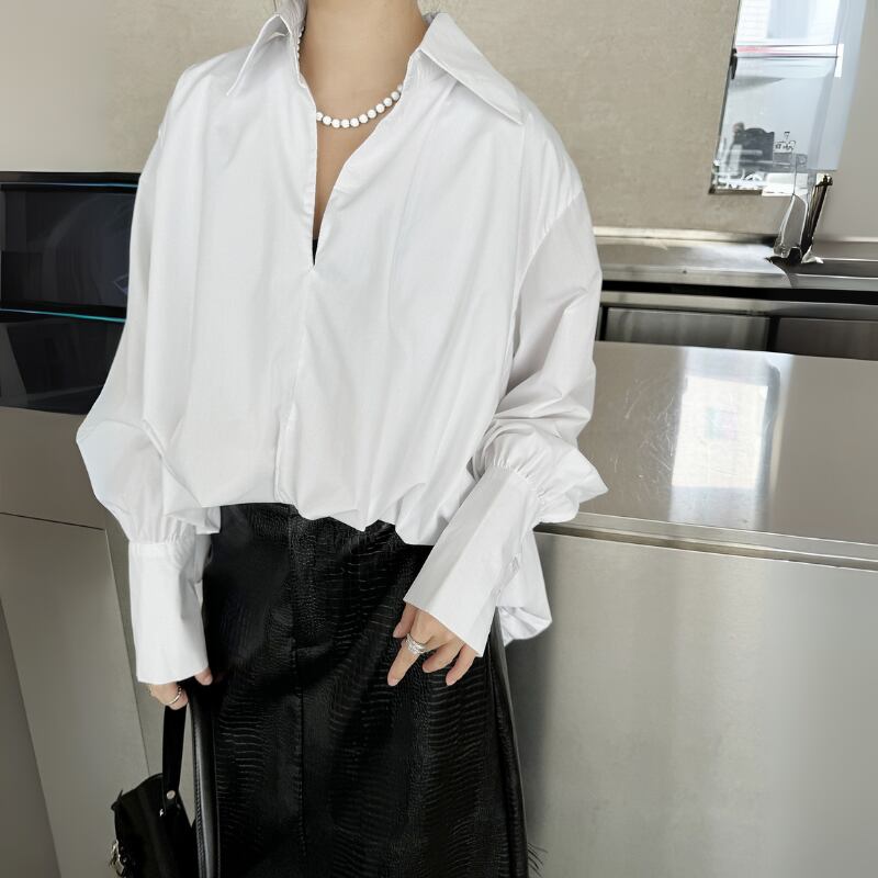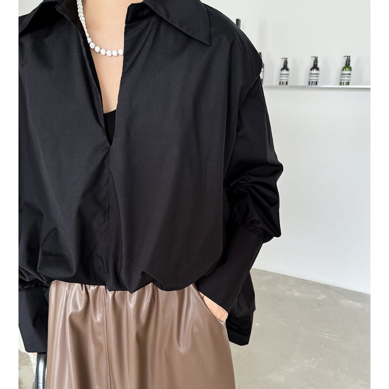 襟元のスキッパーデザインが、デコルテラインをすっきりと見せ、抜け感を演出。