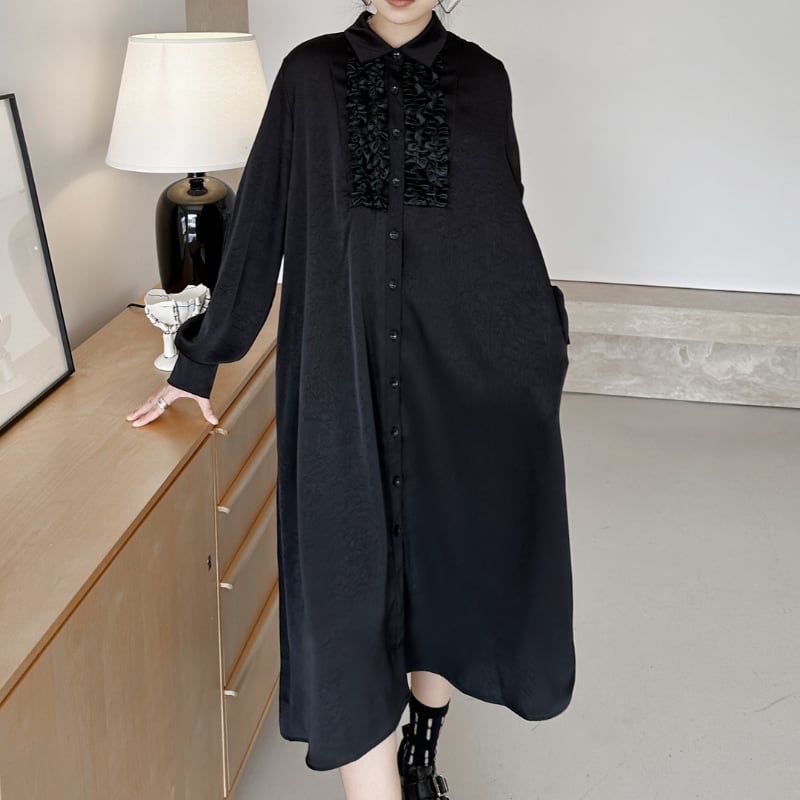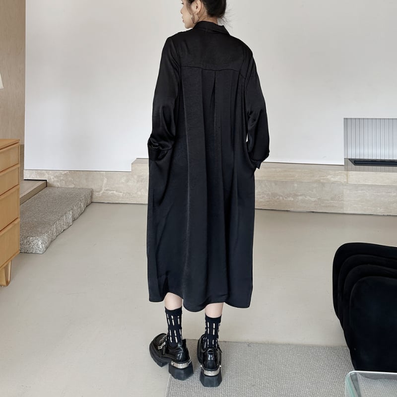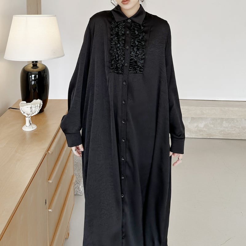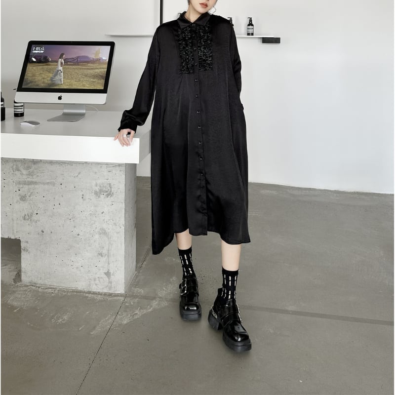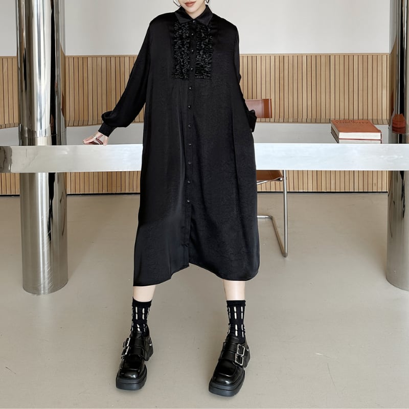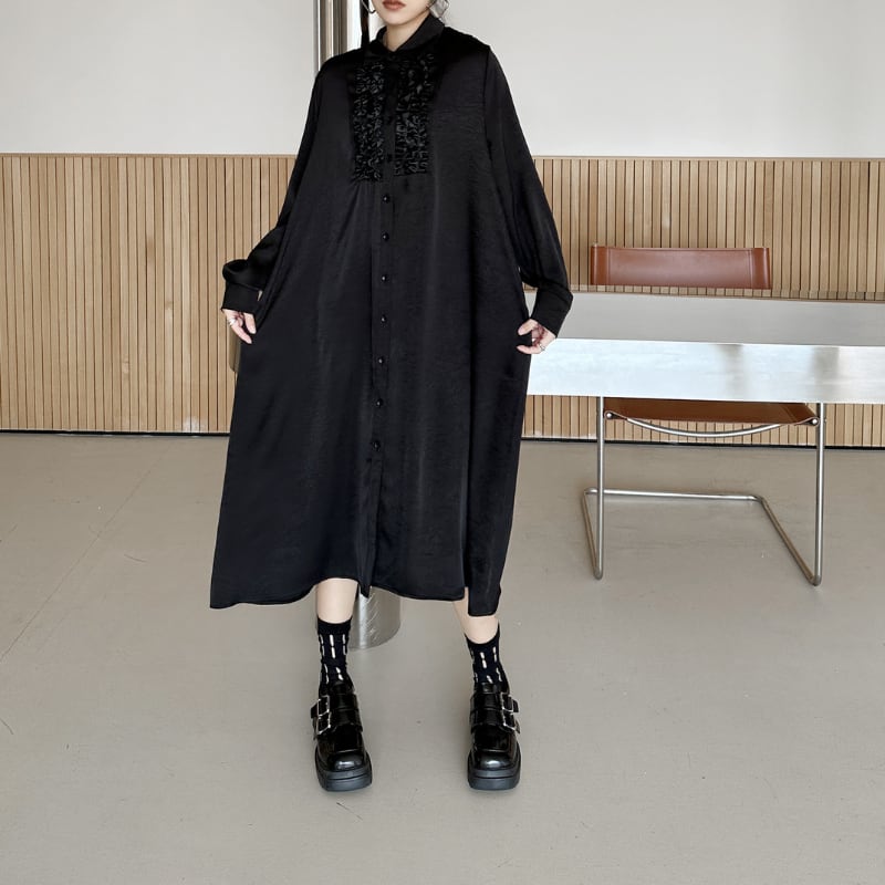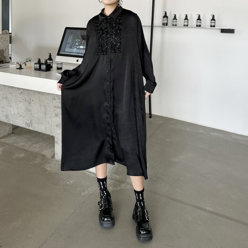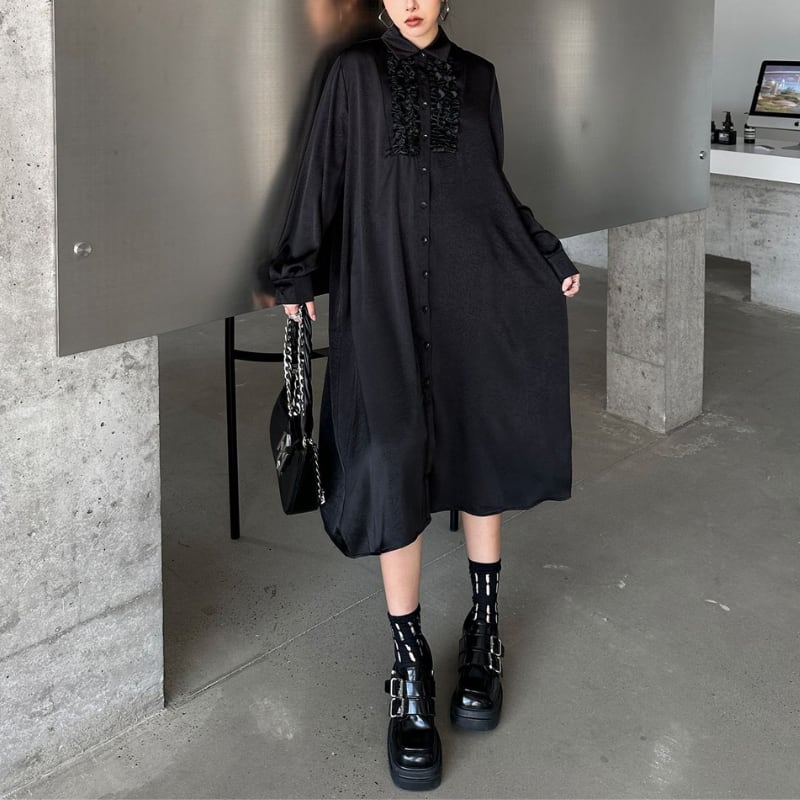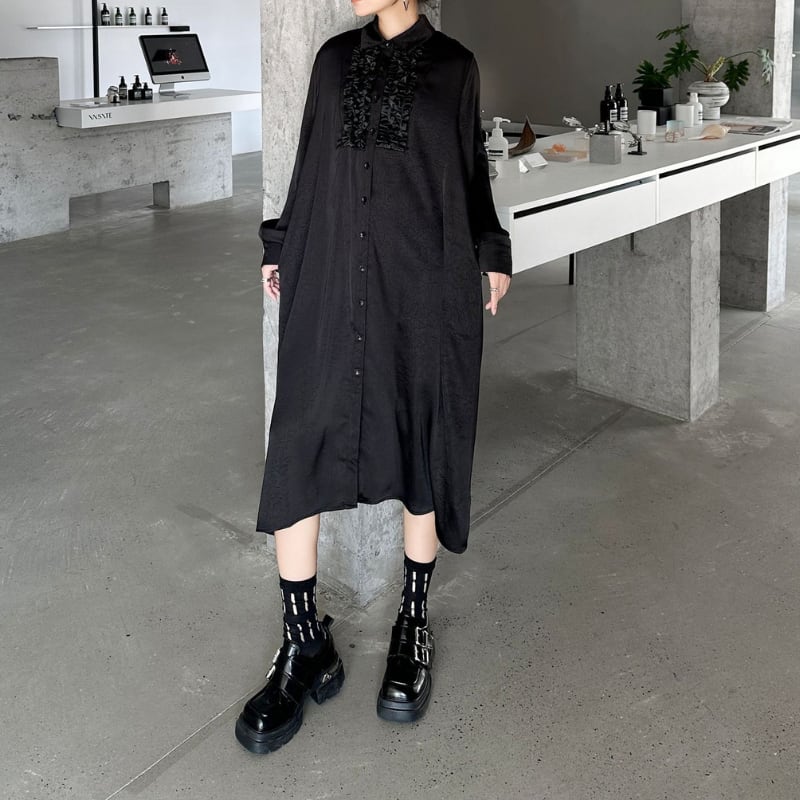 首元をすっきりと見せるバンドカラーと、胸元にあしらわれた繊細なフリル、後ろ身頃のタックによって立体感が生まれ、どこから見ても抜かりないデザインです。