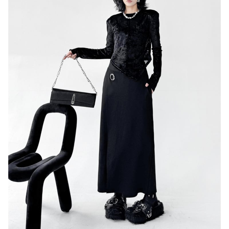 光沢感のあるベロア調の生地が、コーディネートに上品な華やかさをプラス。