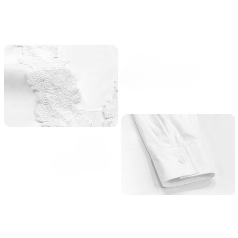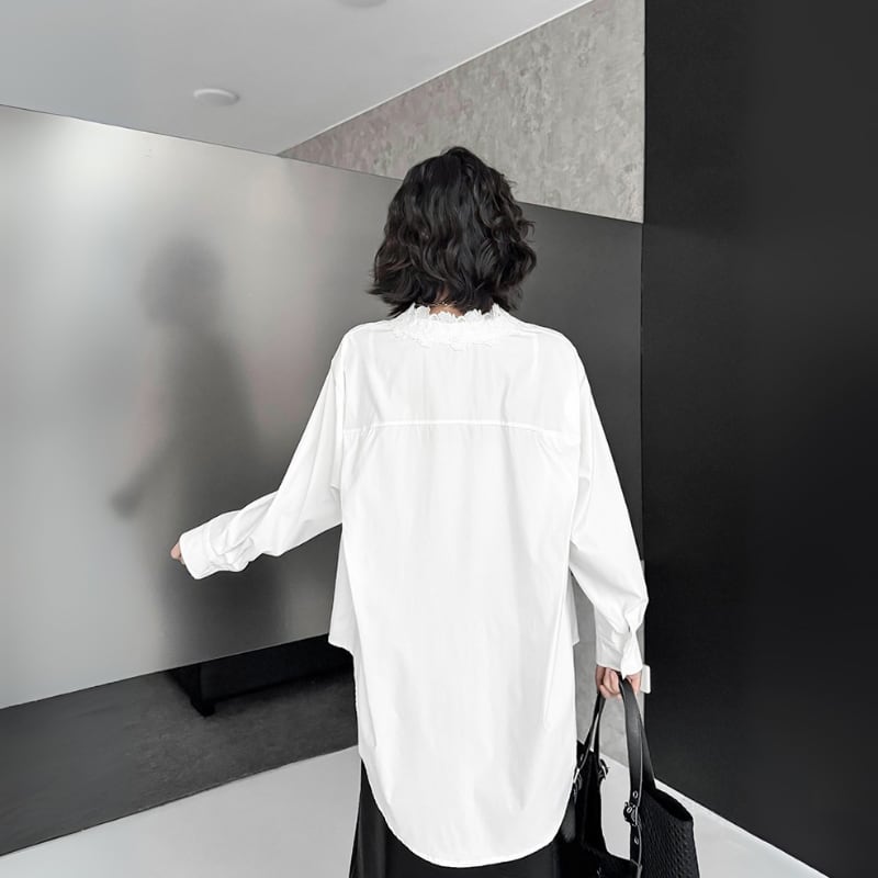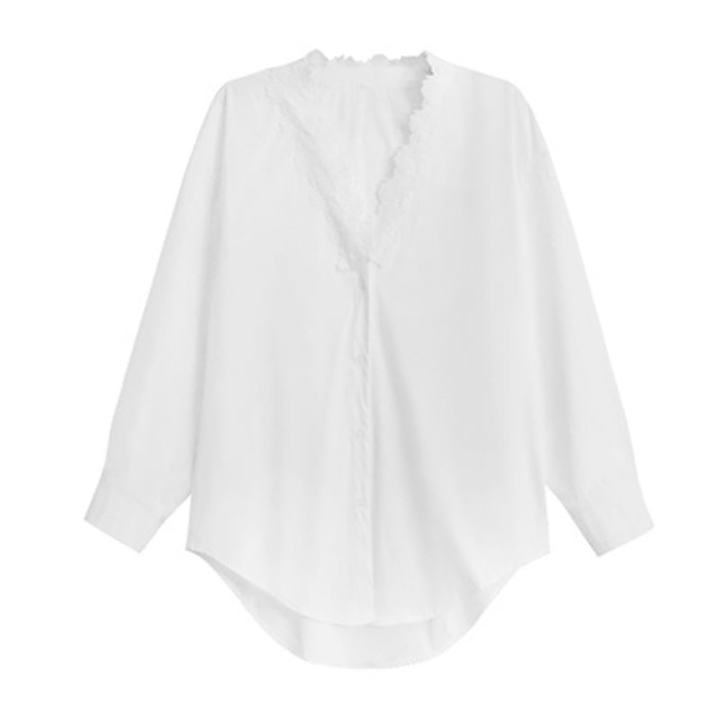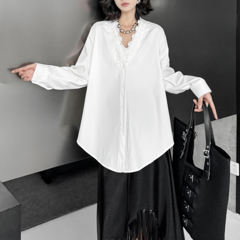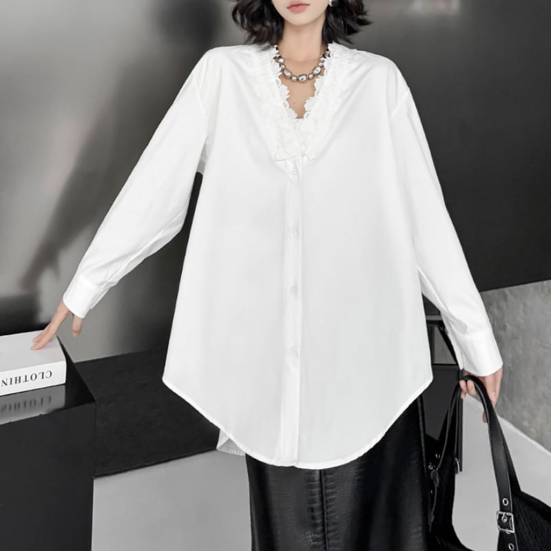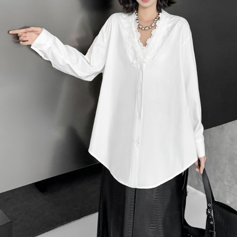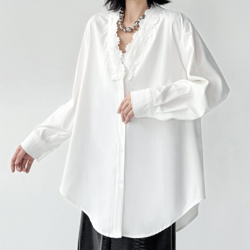大胆なVネックとそこにあしらわれた繊細なレースの装飾が、顔まわりをすっきりと見せ、女性らしい華やかさをプラス。