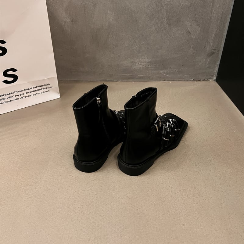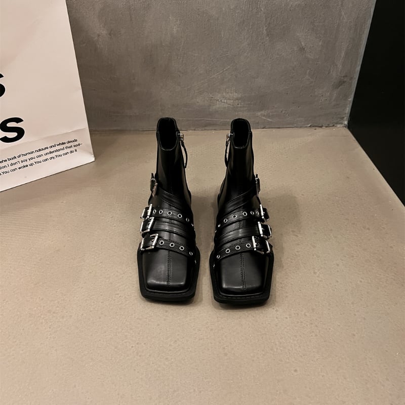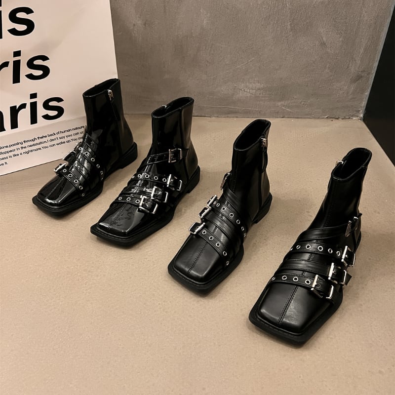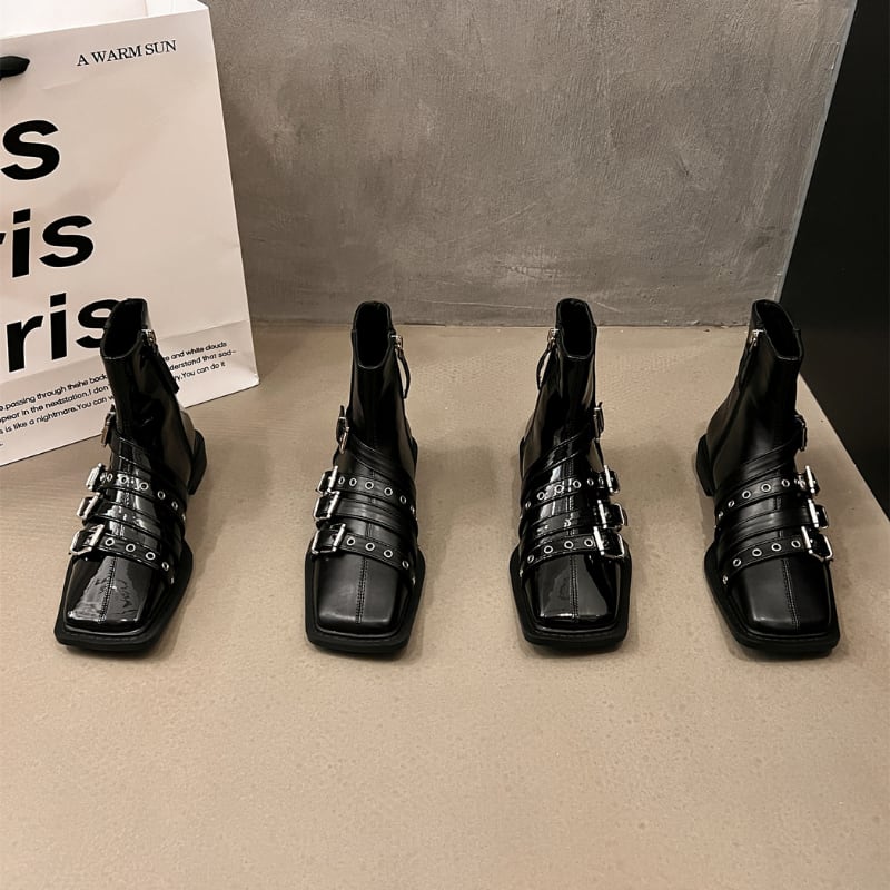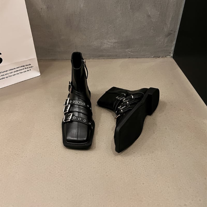 スクエアトゥのシャープなフォルムに、複数のベルトとシルバーバックルがアクセントを加えた、モード感溢れるショートブーツです。