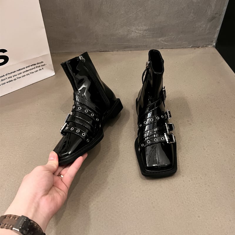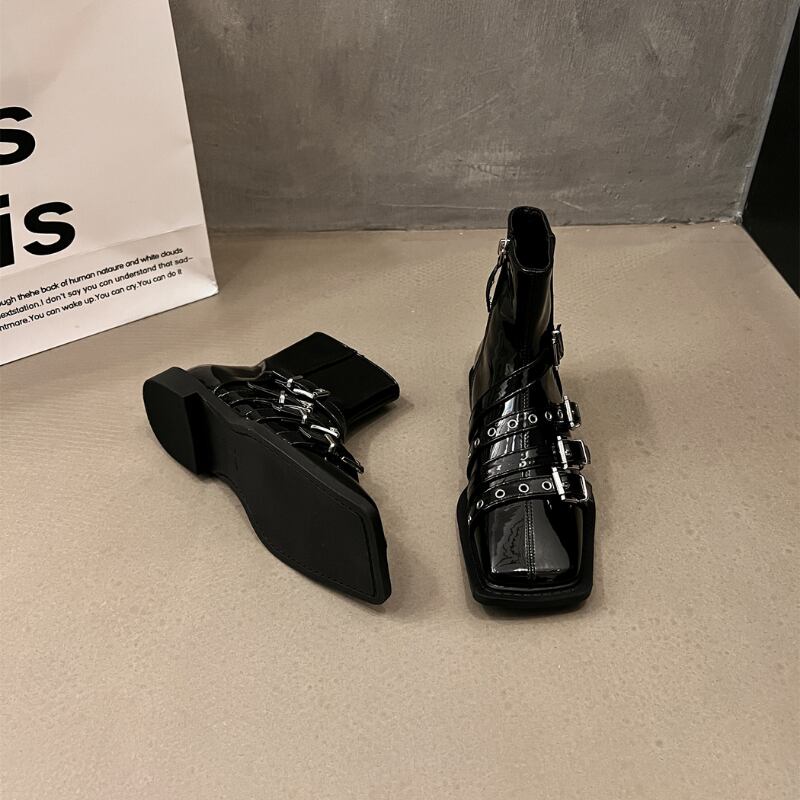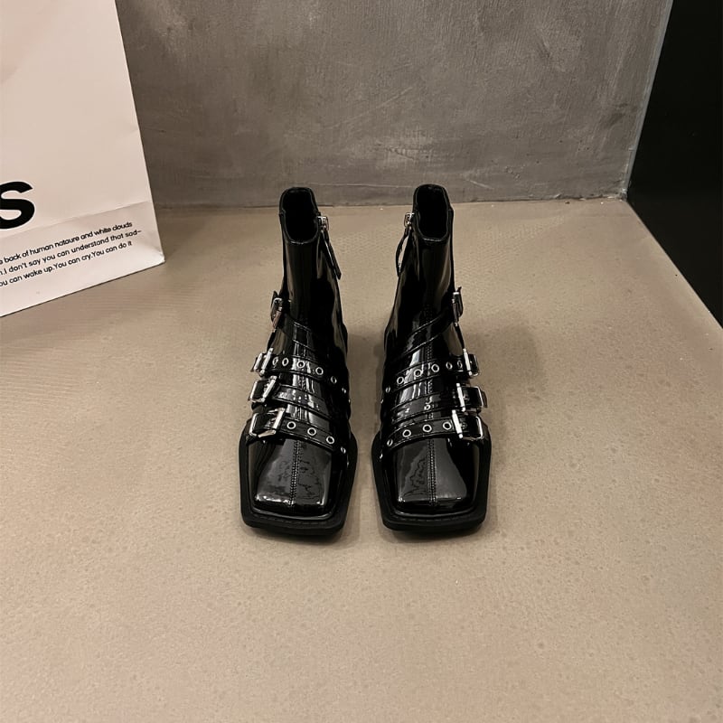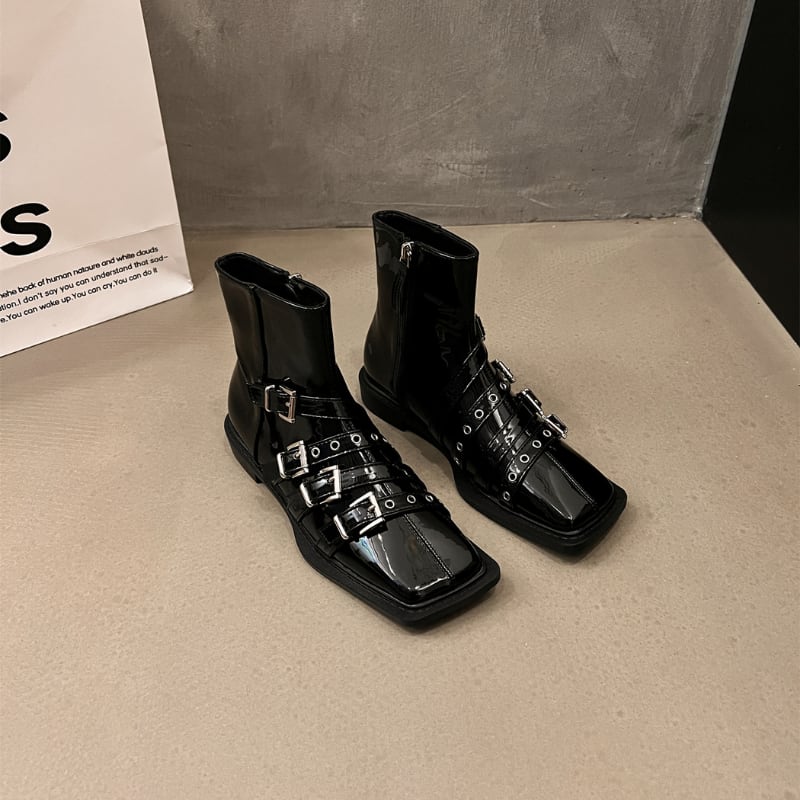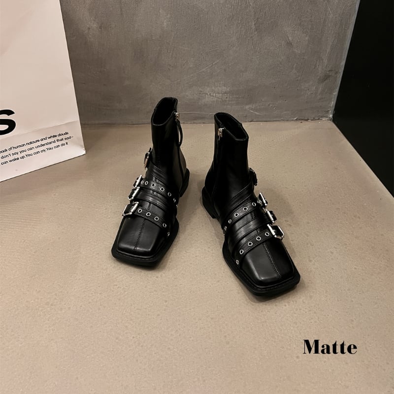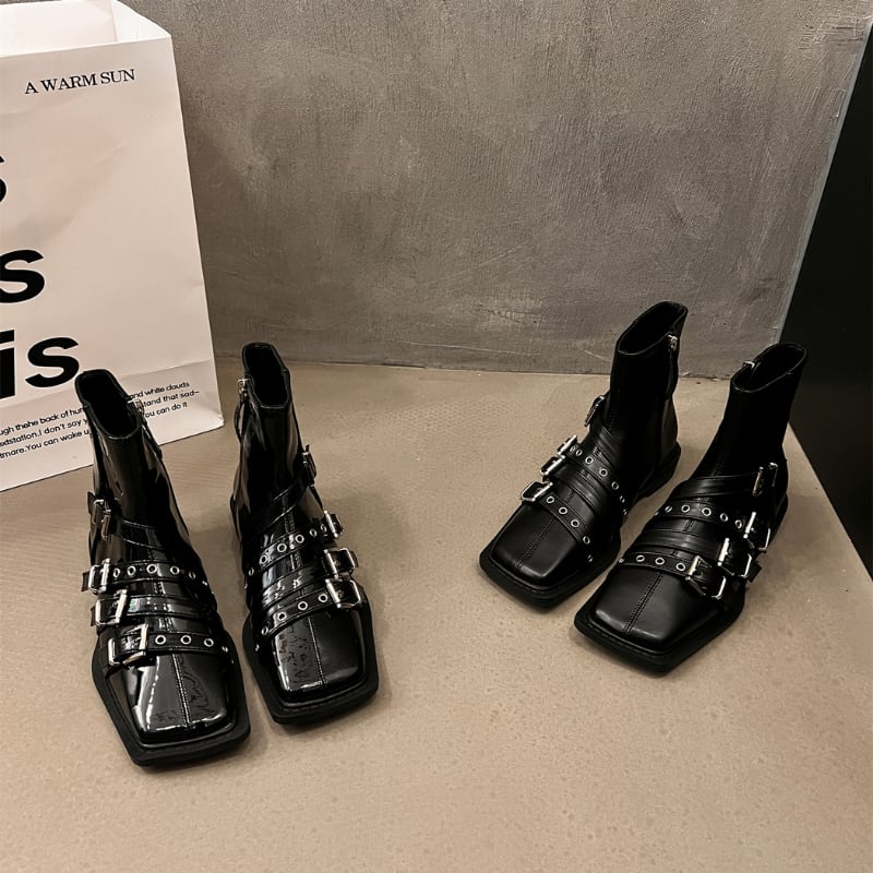 スクエアトゥのシャープなフォルムに、複数のベルトとシルバーバックルがアクセントを加えた、モード感溢れるショートブーツです。