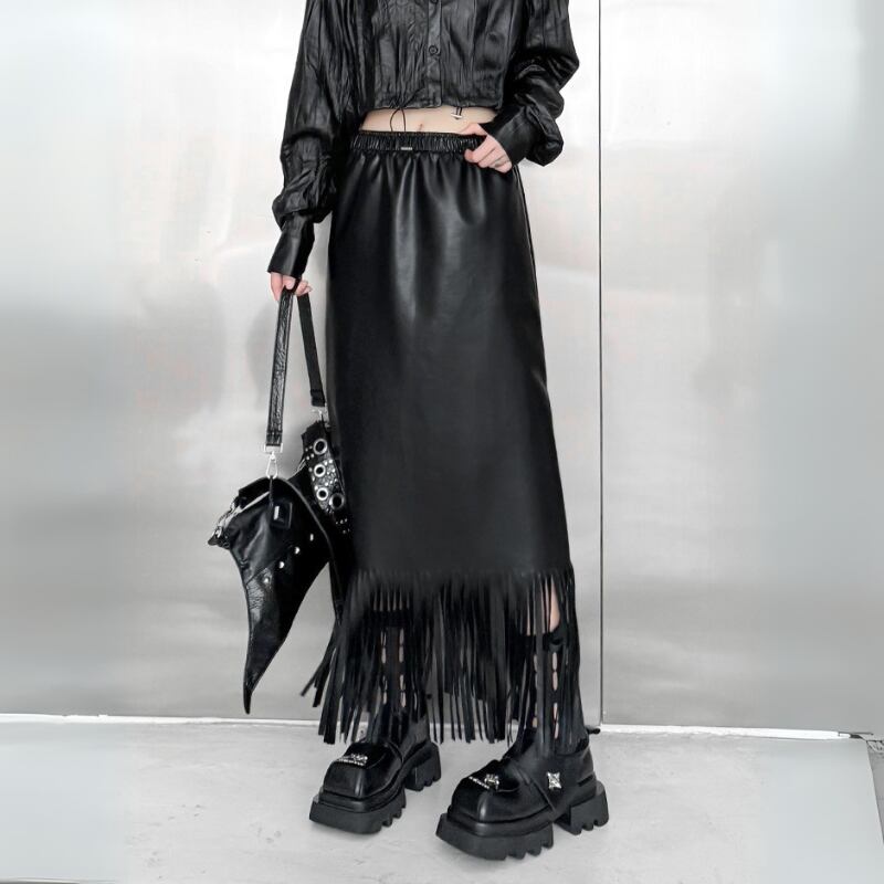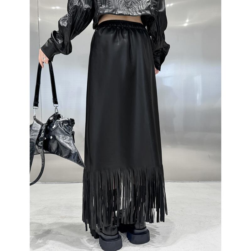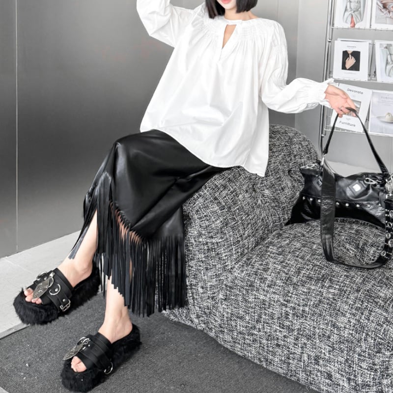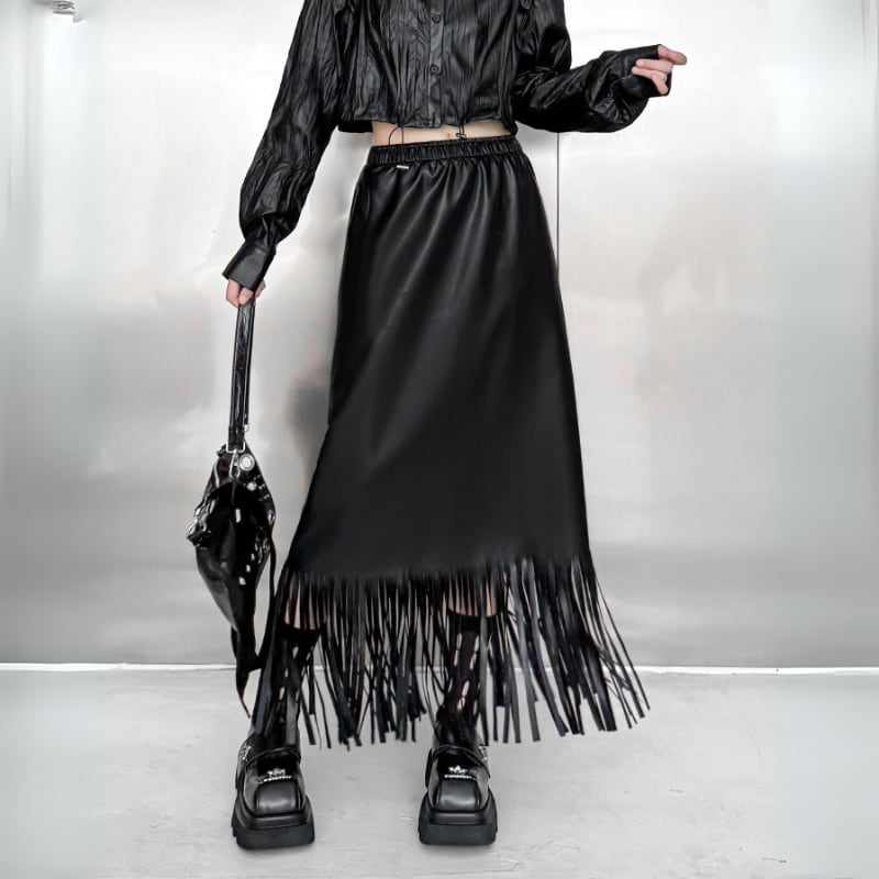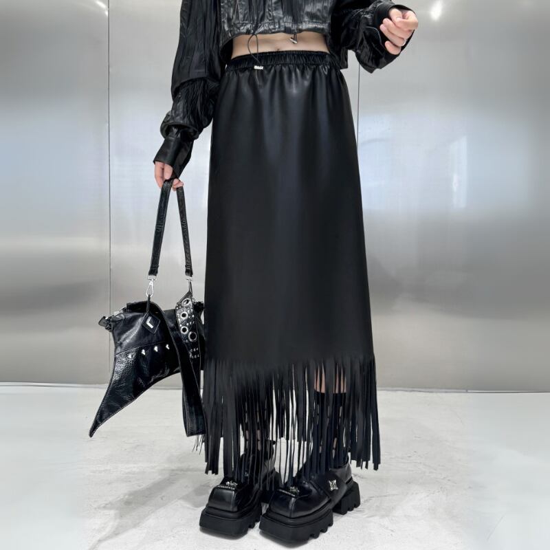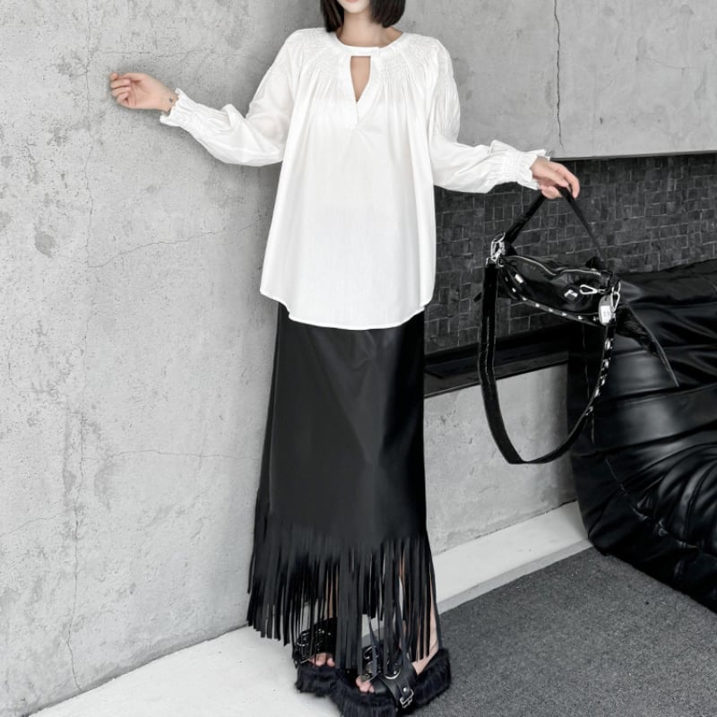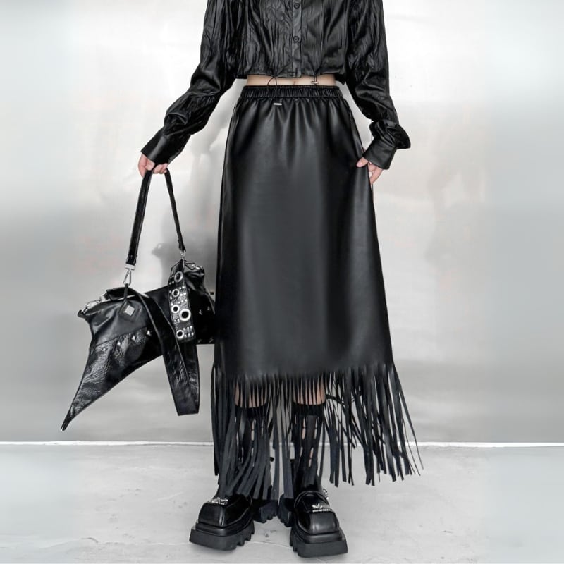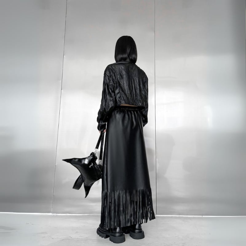上質なエコレザーの生地は、クールな印象を与えつつ、フリンジの軽やかな動きで女性らしい柔らかさをプラスします。
