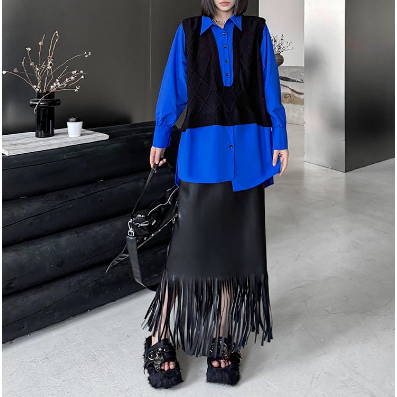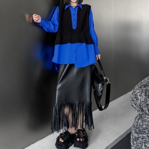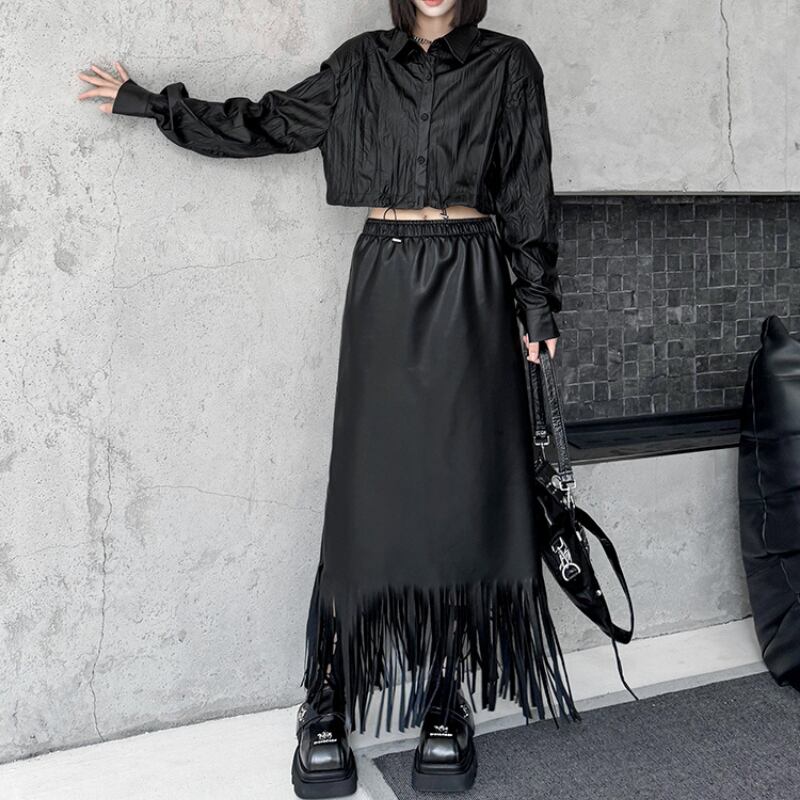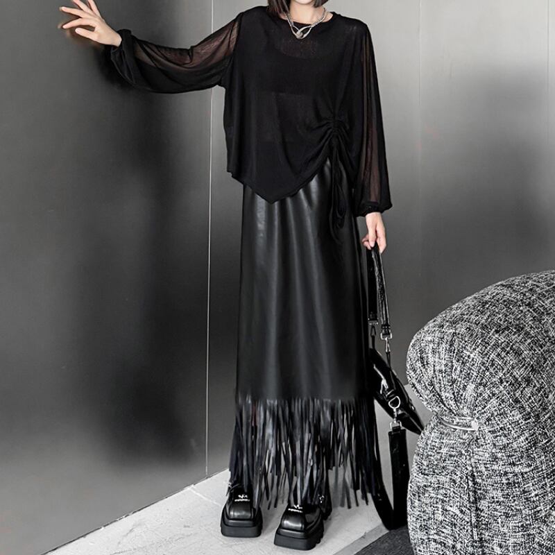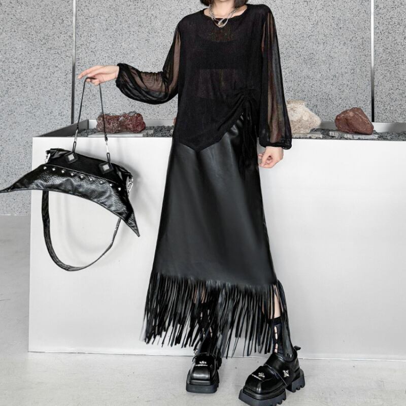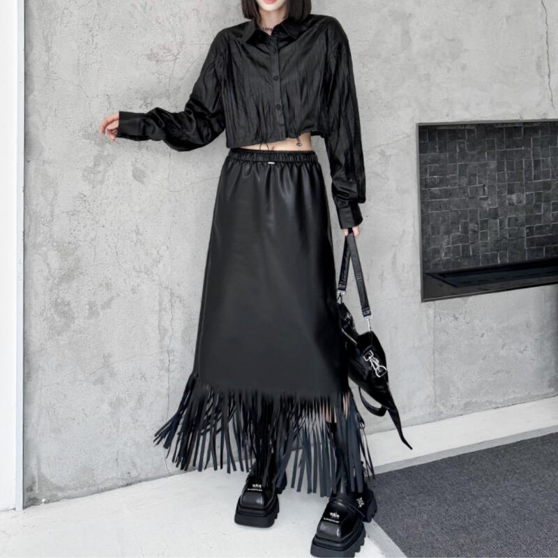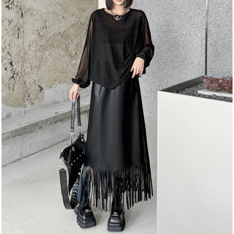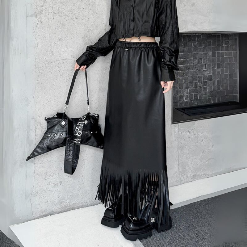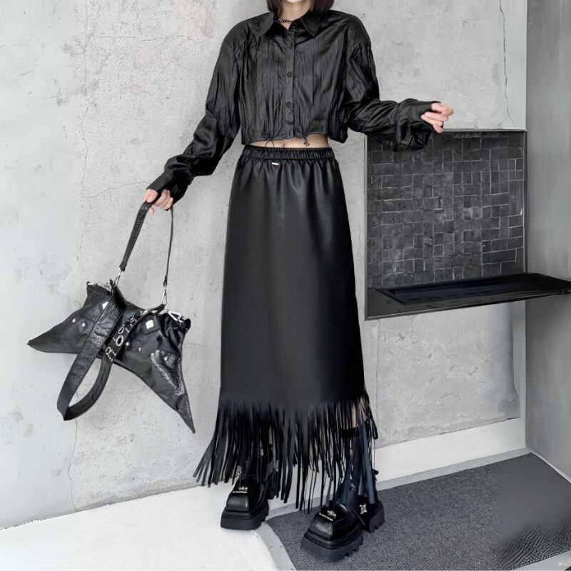 上質なエコレザーの生地は、クールな印象を与えつつ、フリンジの軽やかな動きで女性らしい柔らかさをプラスします。