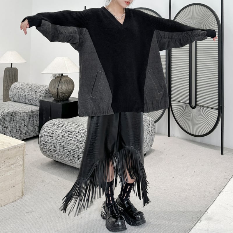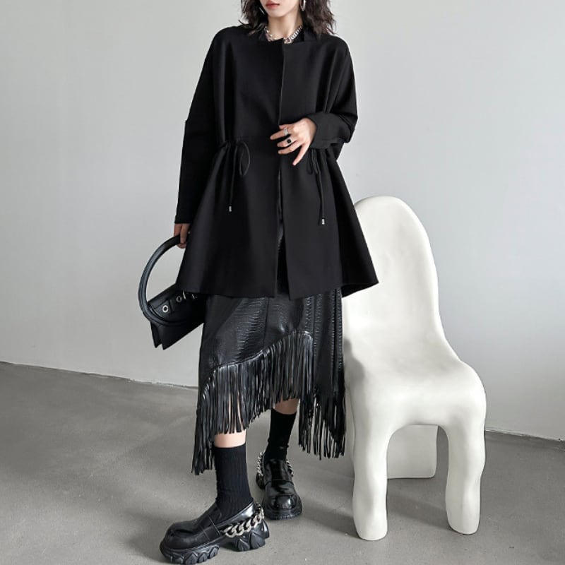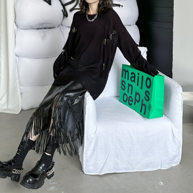 クールな印象を与えつつ、大胆なフリンジが着こなしに華やかさと個性を添え、周囲の視線を引きつけます。