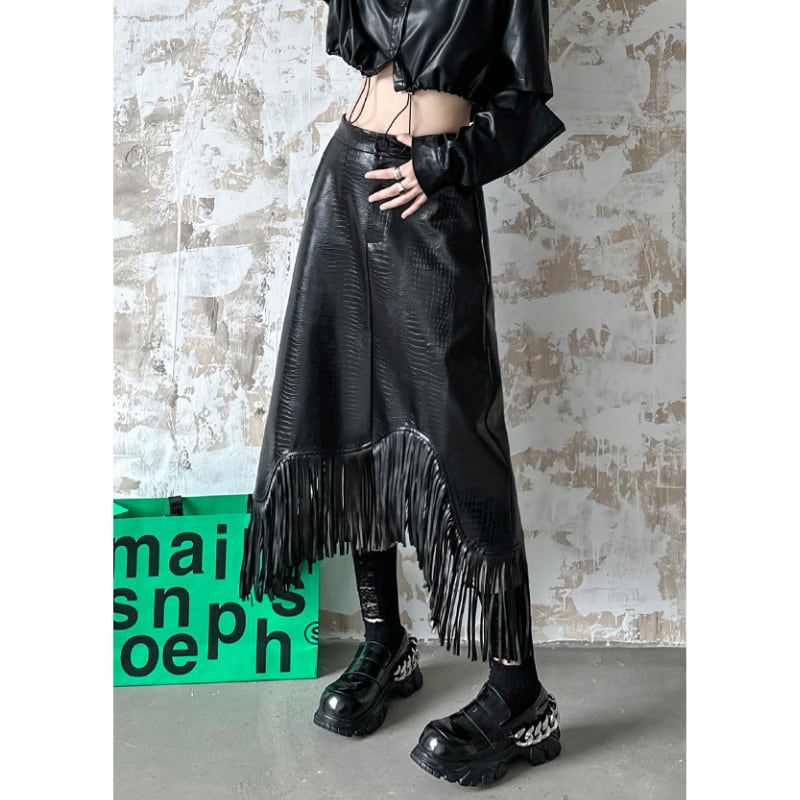 Asymmetrical Eco-Leather Fringe Skirt H0194