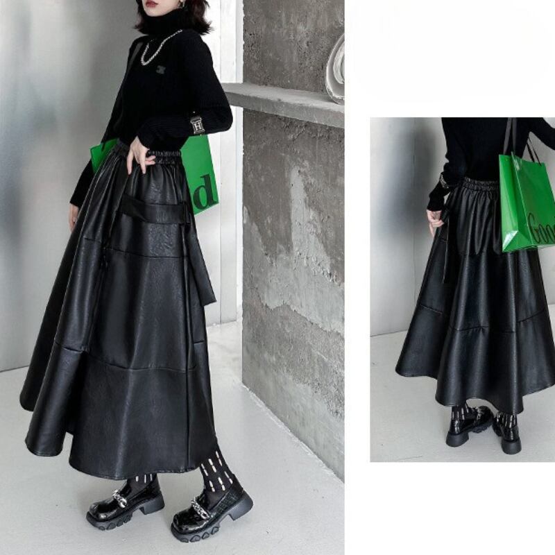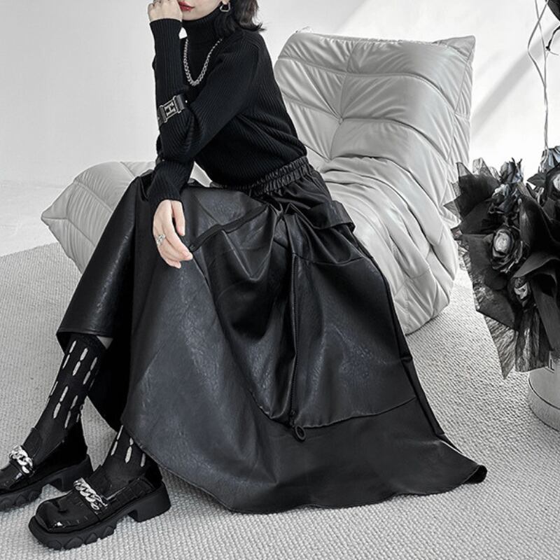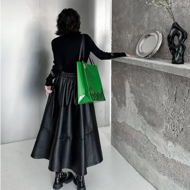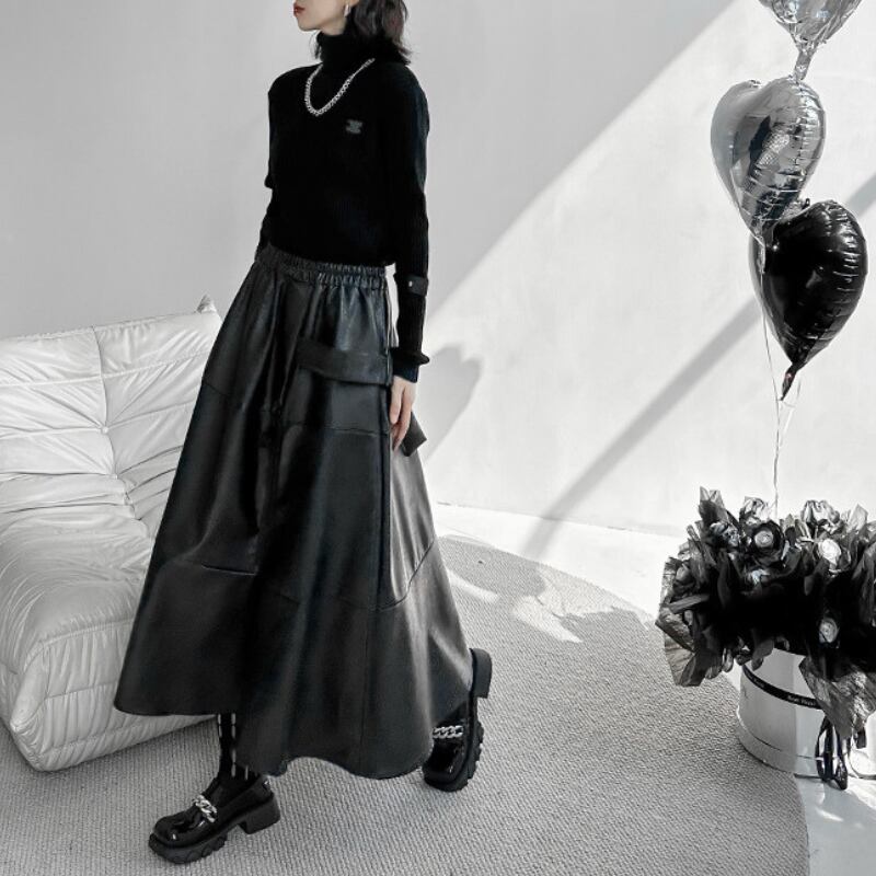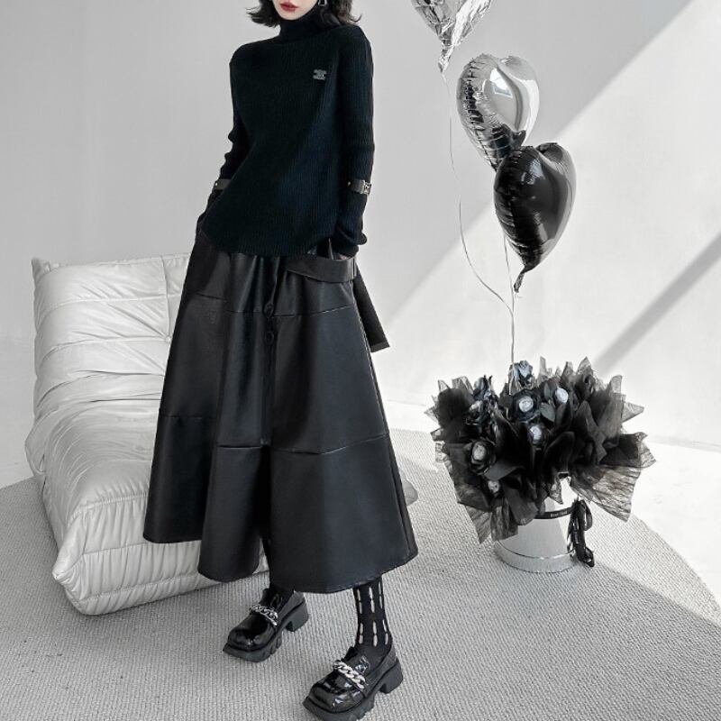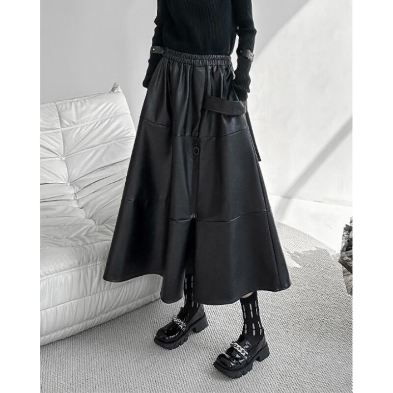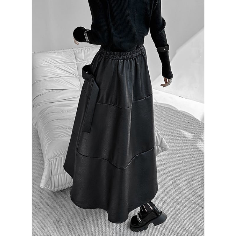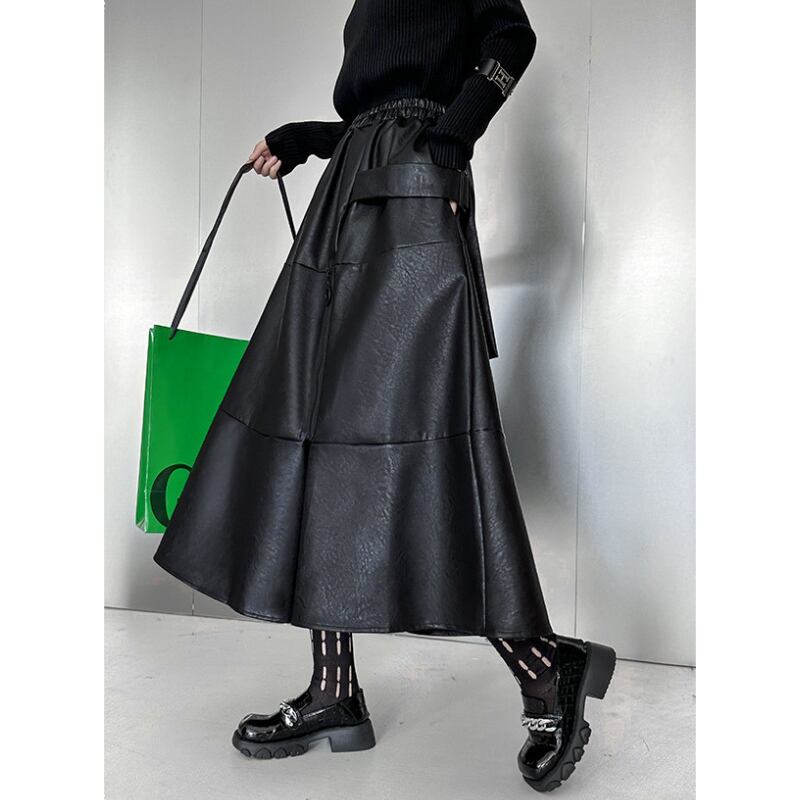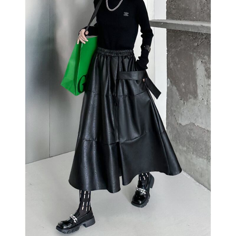 クールなエコレザー素材と、歩くたびに揺れるフレアシルエットが、洗練された大人のスタイルを演出します。