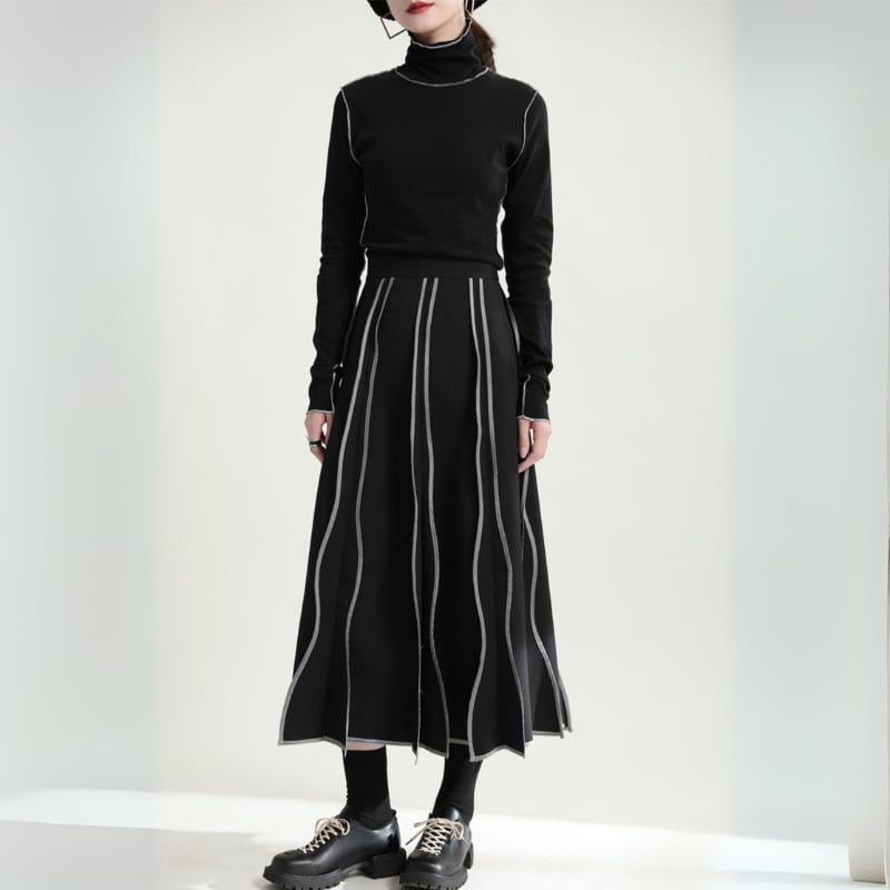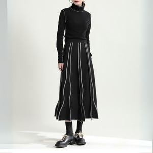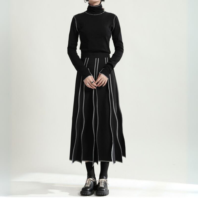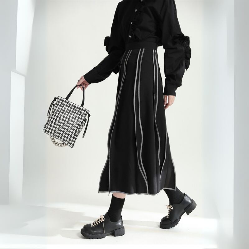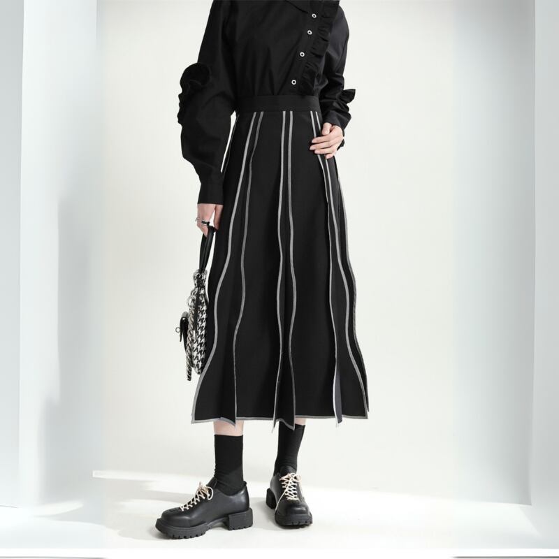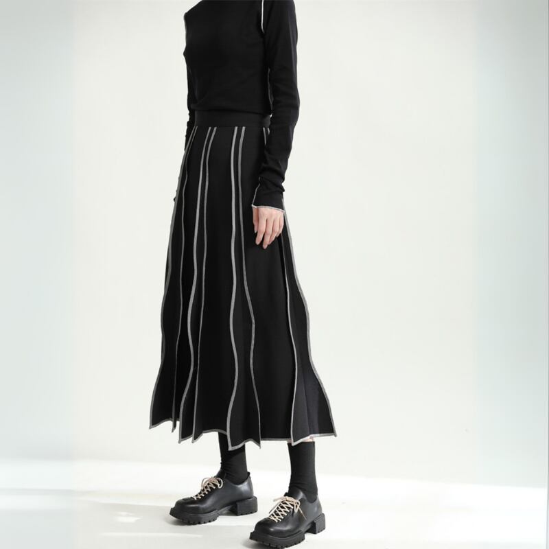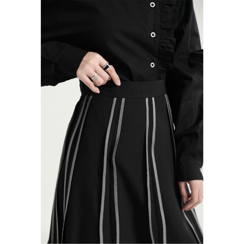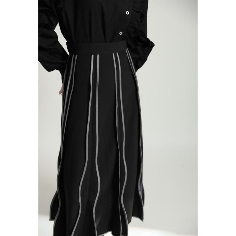 クールなブラックの生地に、波打つようなホワイトのラインが施された、モードなロングスカート。