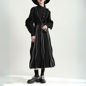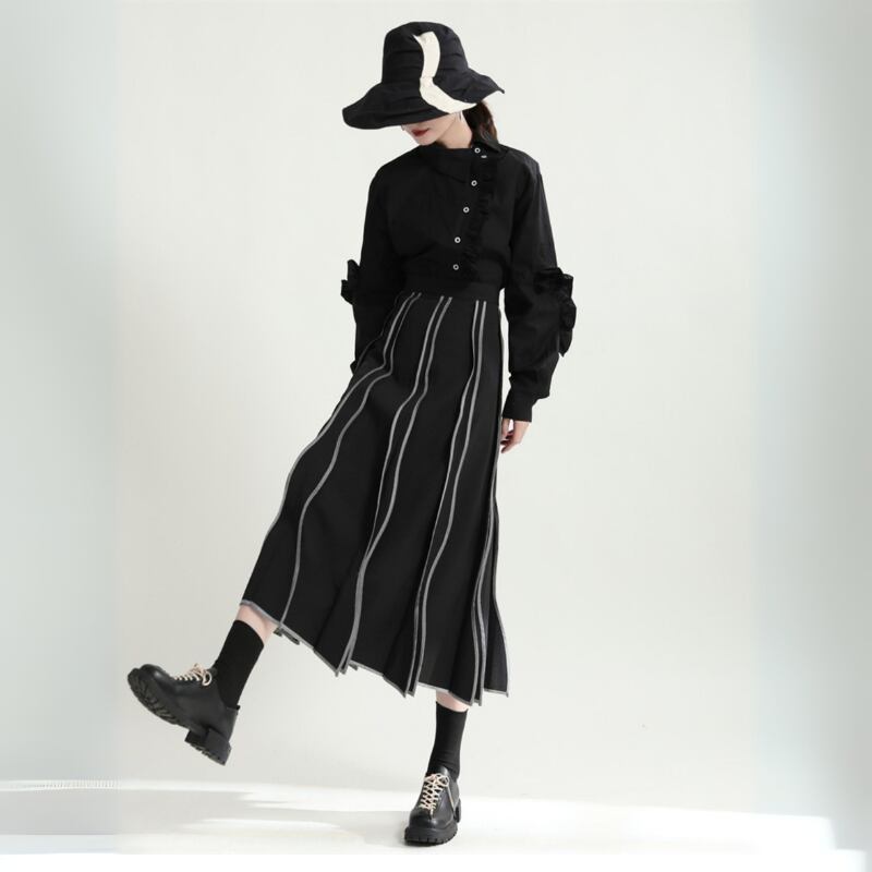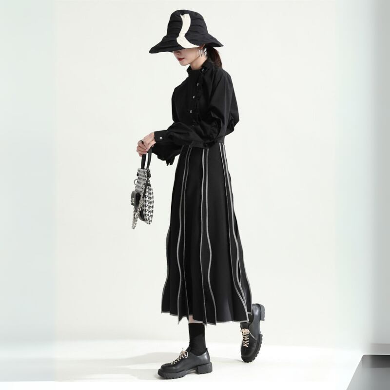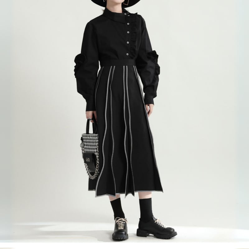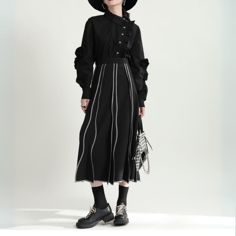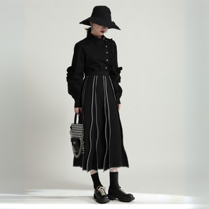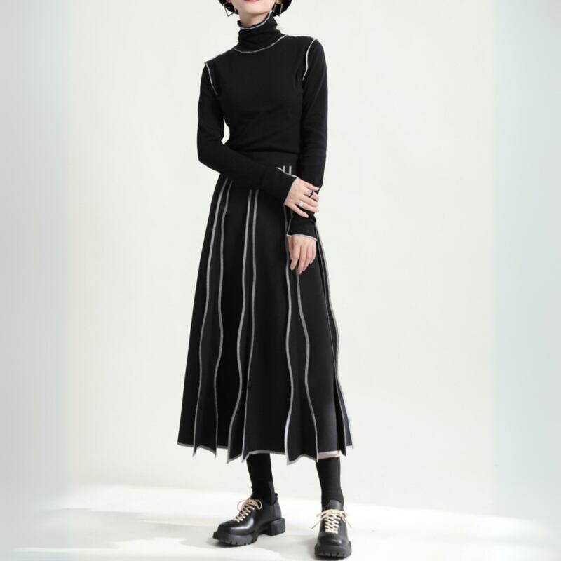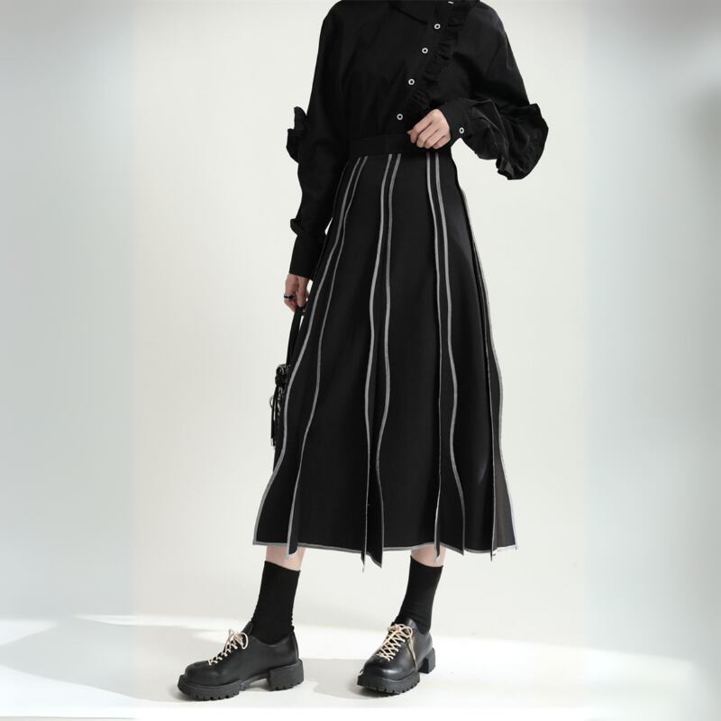 クールなブラックの生地に、波打つようなホワイトのラインが施された、モードなロングスカート。