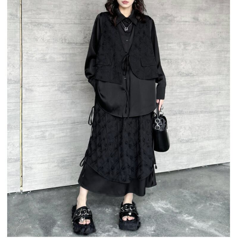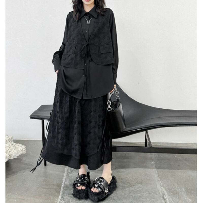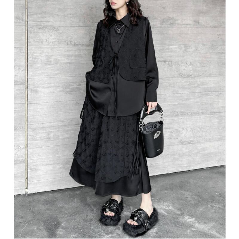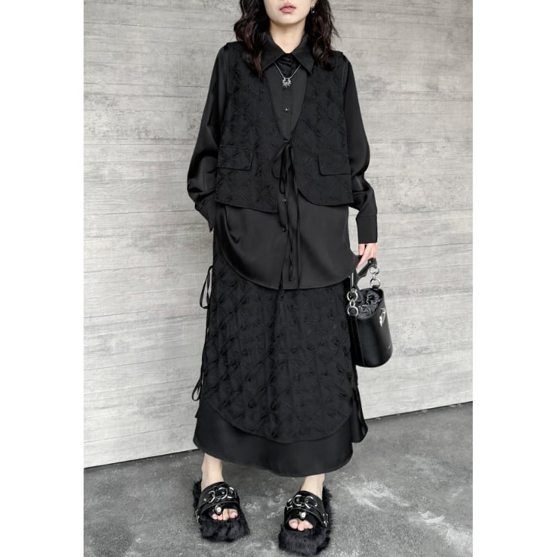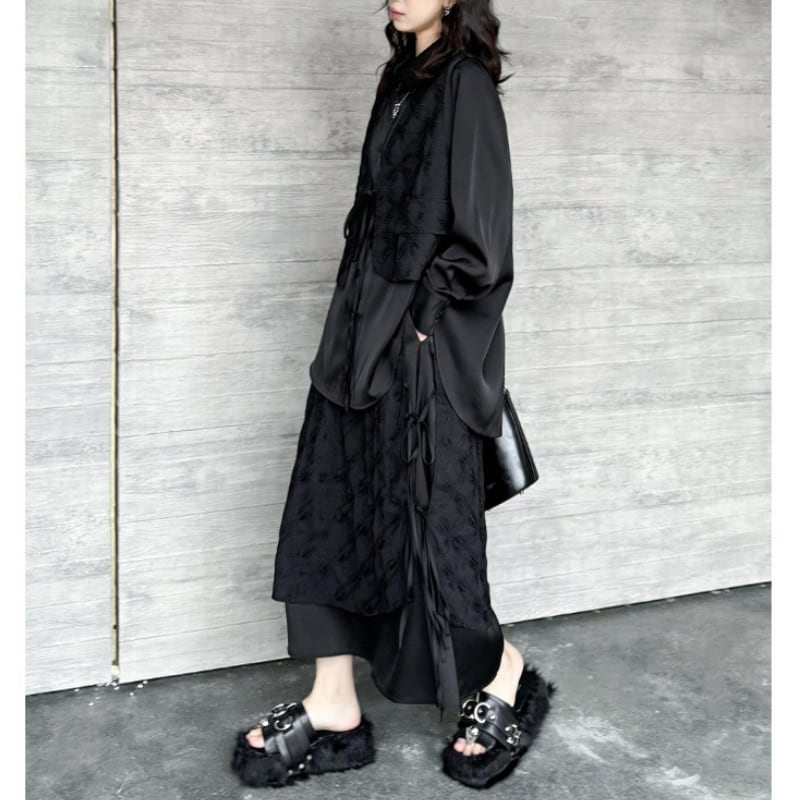 ジャガード柄のベストを重ね着したようなデザインが、シンプルながらもモードな個性を放ちます。