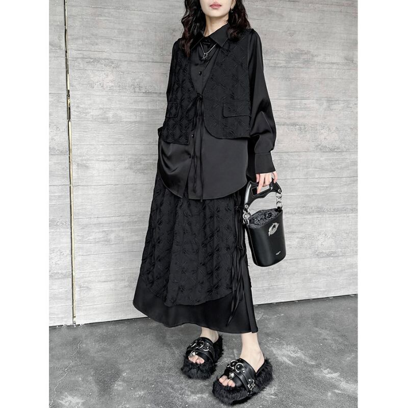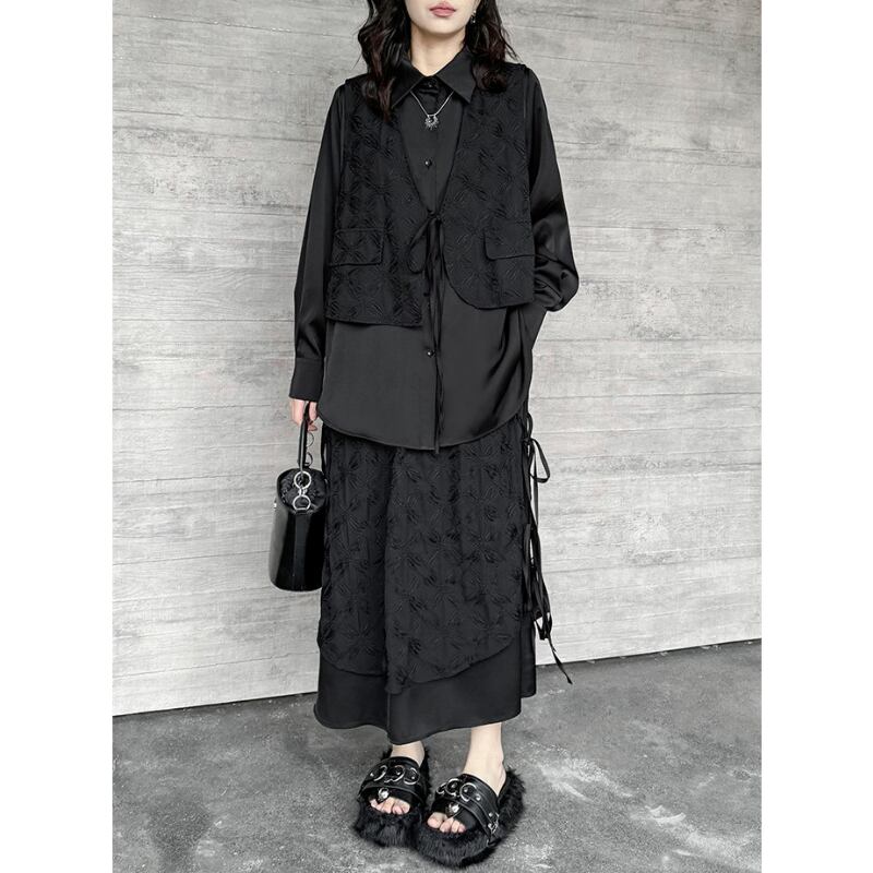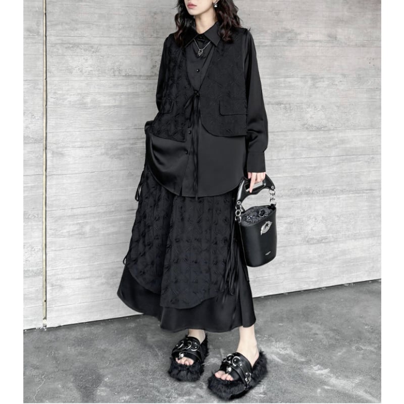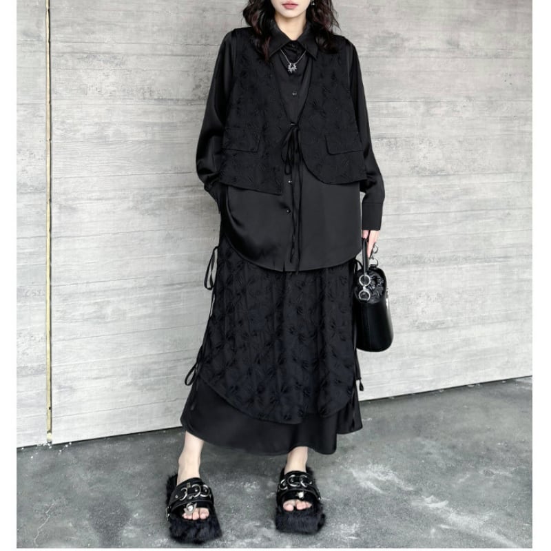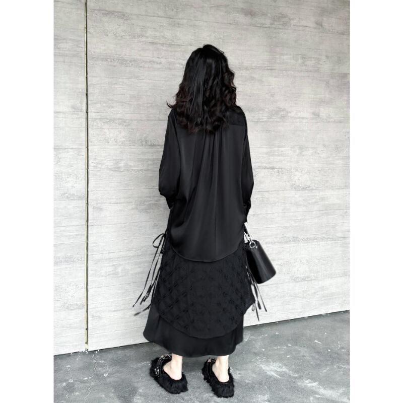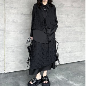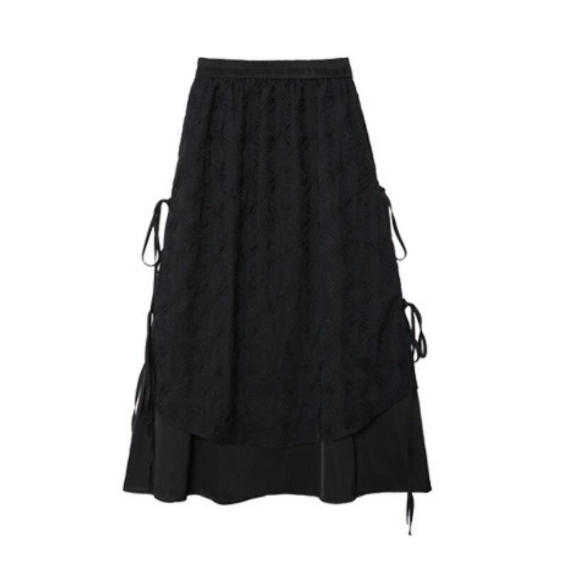 立体的なジャガード柄が施された生地と、裾のドローストリングデザインが、洗練された個性を放つスカートです。
