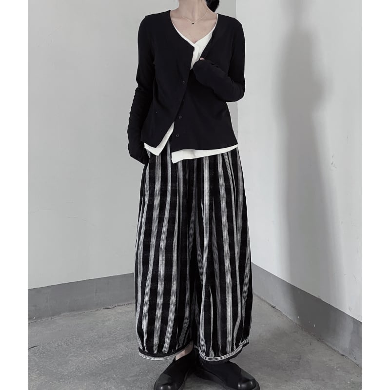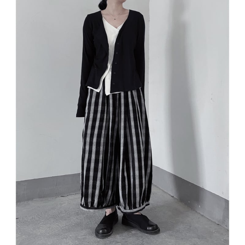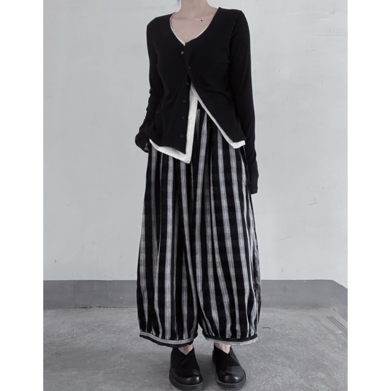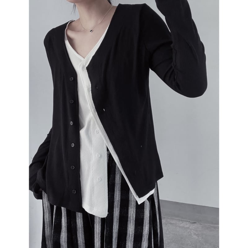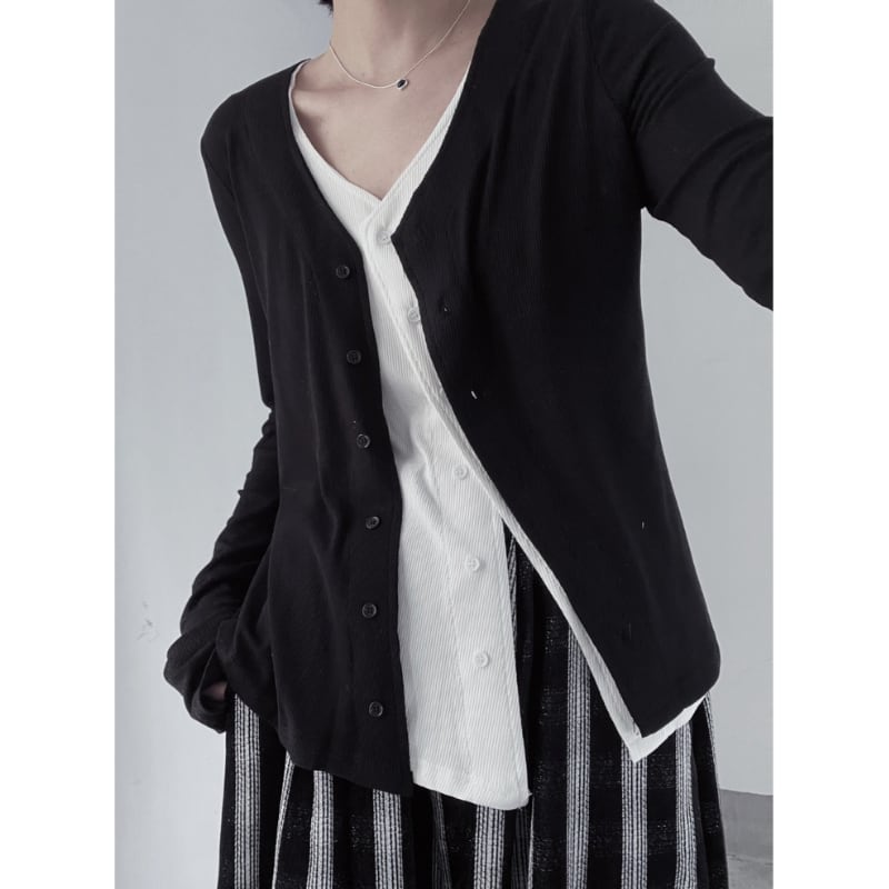 リブ素材のカーディガンに、内側から覗く白いインナーがドッキングされており、計算されたアシンメトリーな裾のラインがモードな雰囲気を演出します。