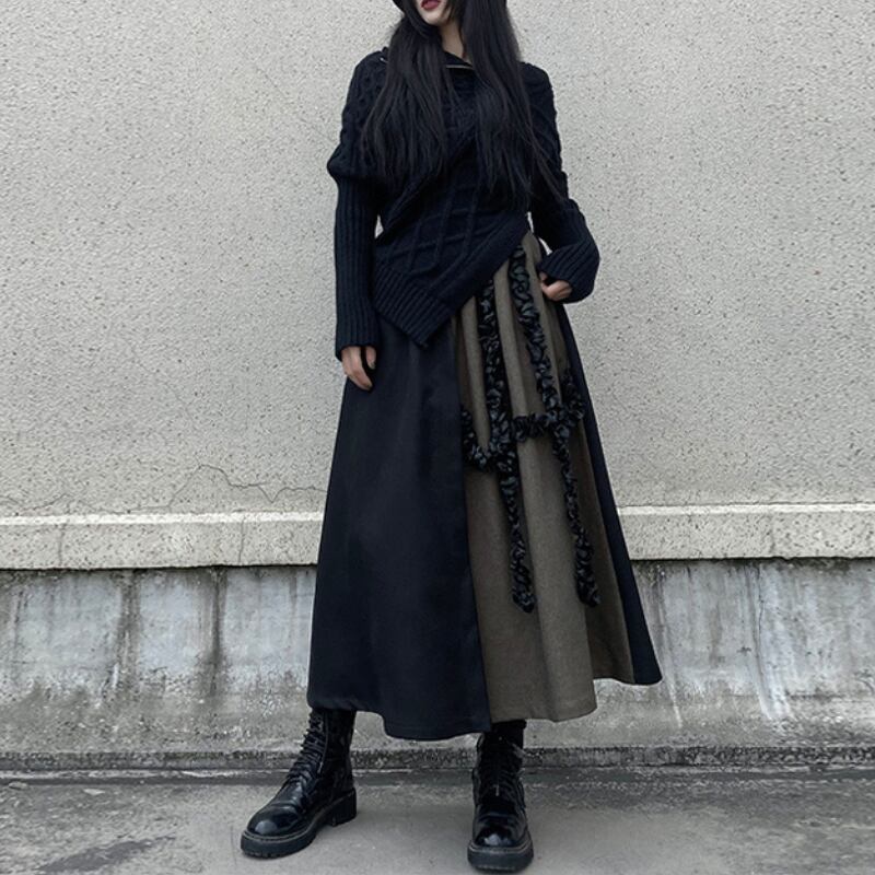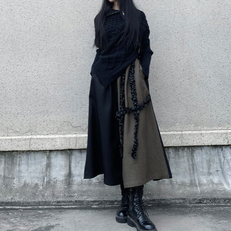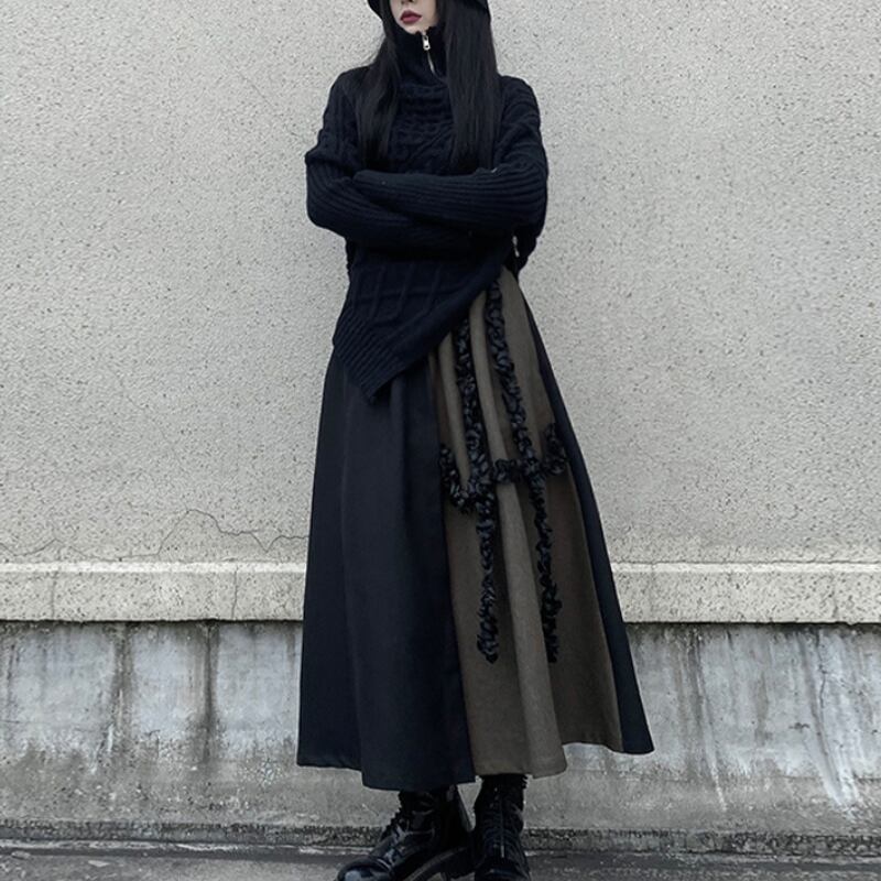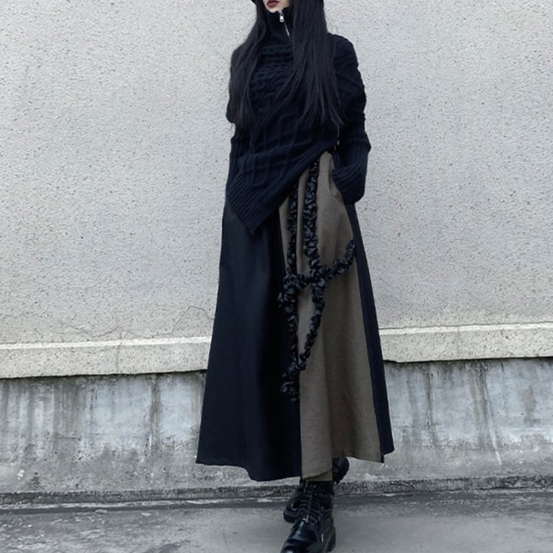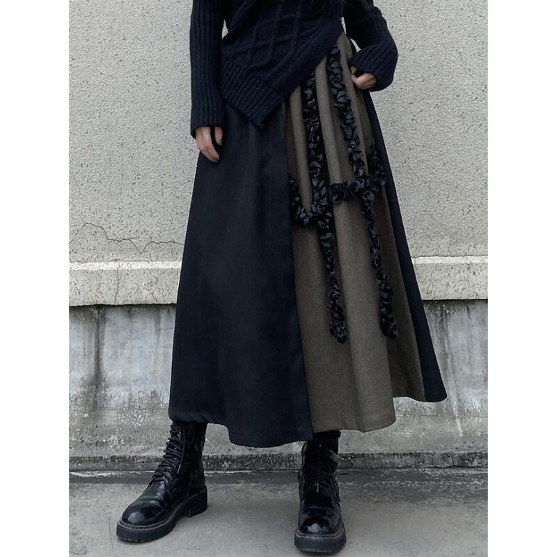 ブラックとブラウンのバイカラーデザインが、クールな個性を放つフレアスカート。