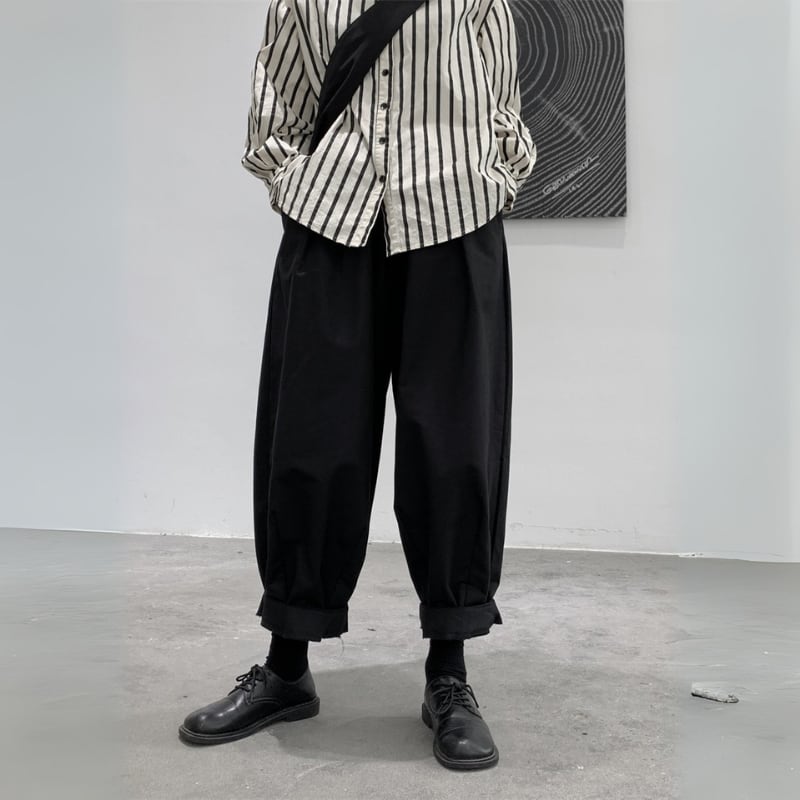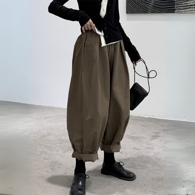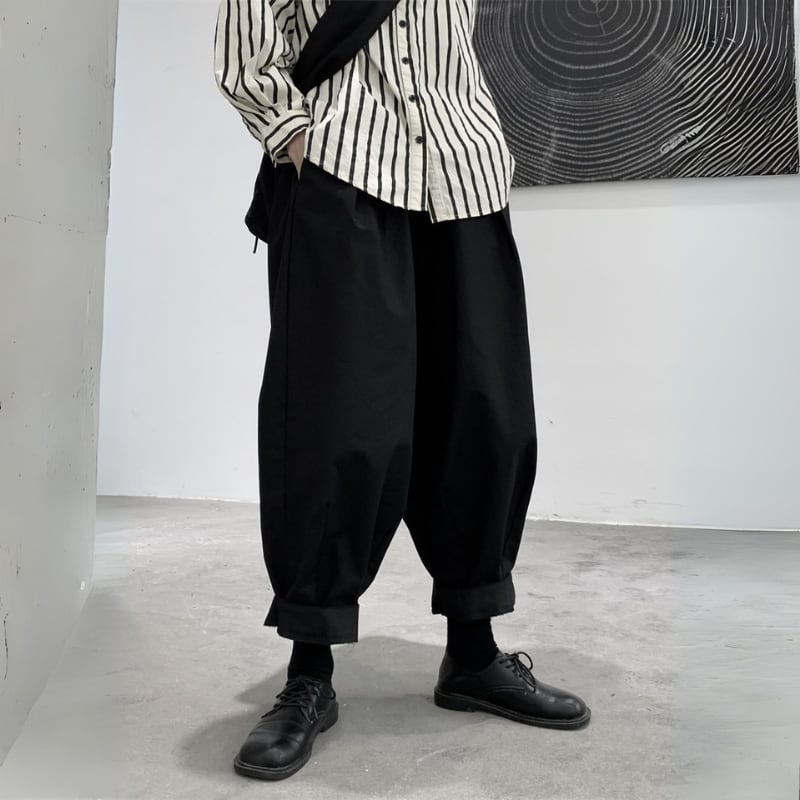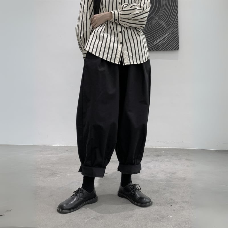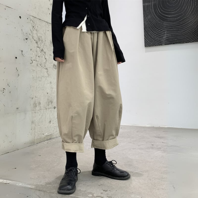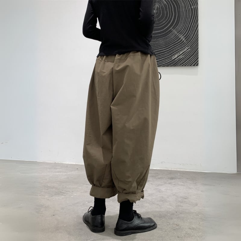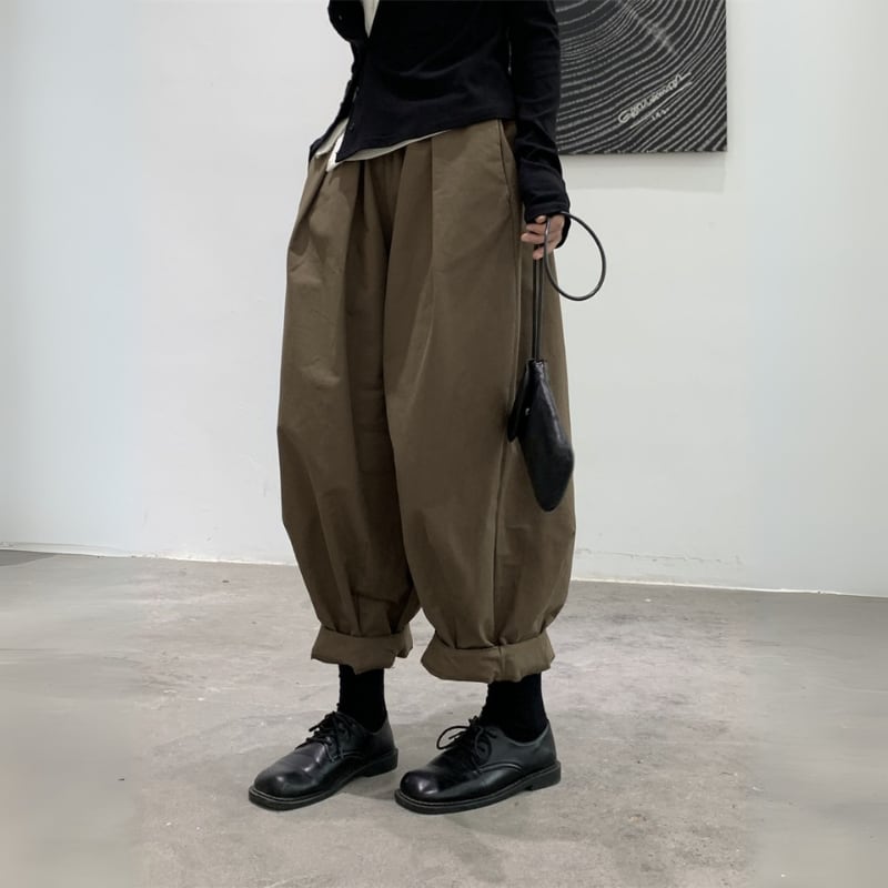 ゆったりとしたワイドなシルエットと、裾に向かって丸みを帯びたバルーンシルエットが、モードな個性を放つパンツ。