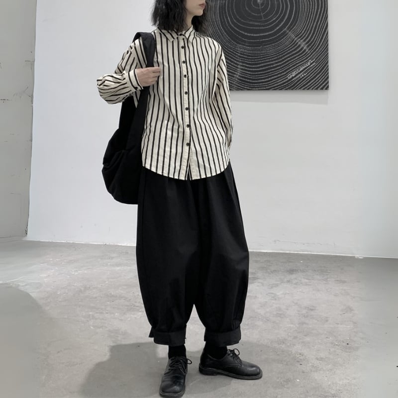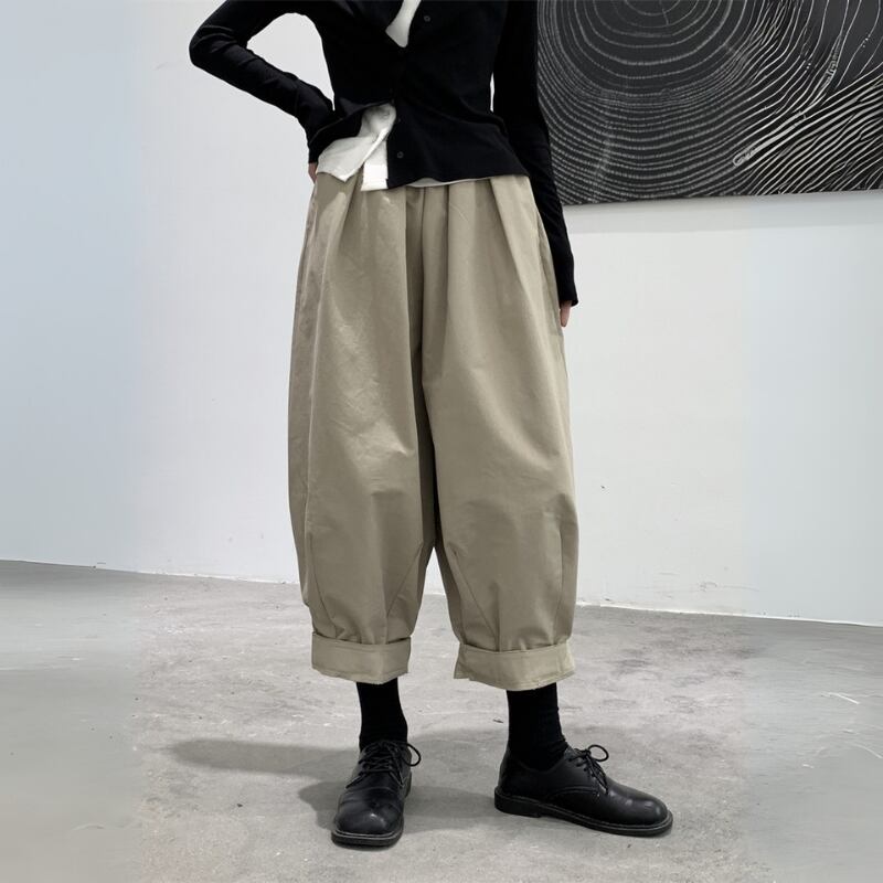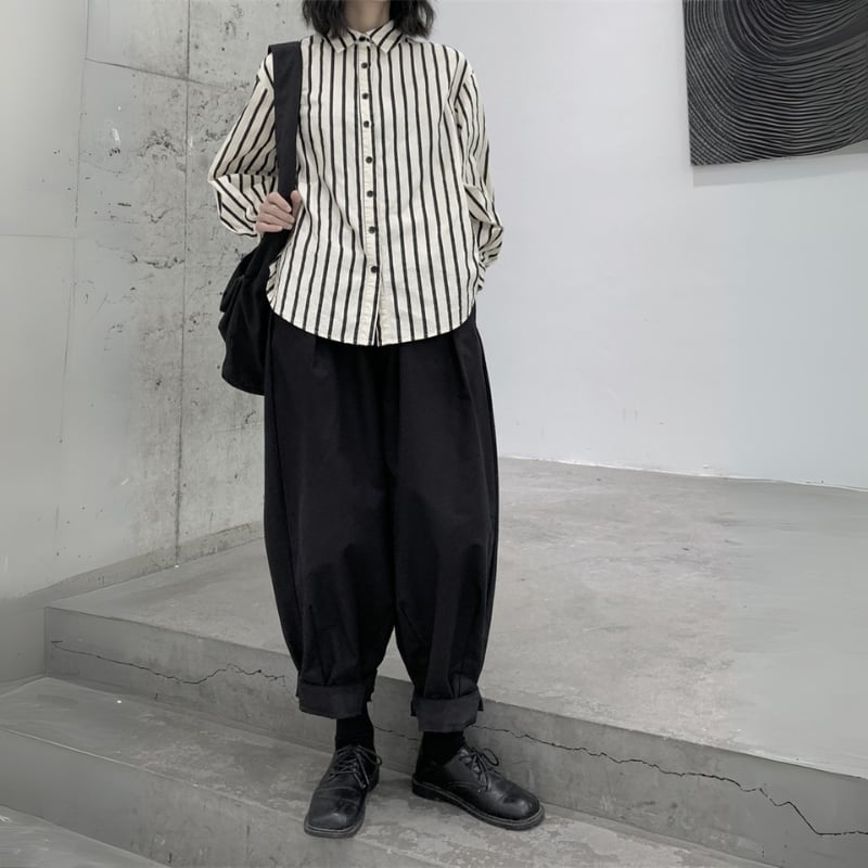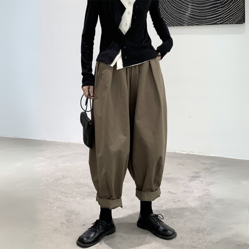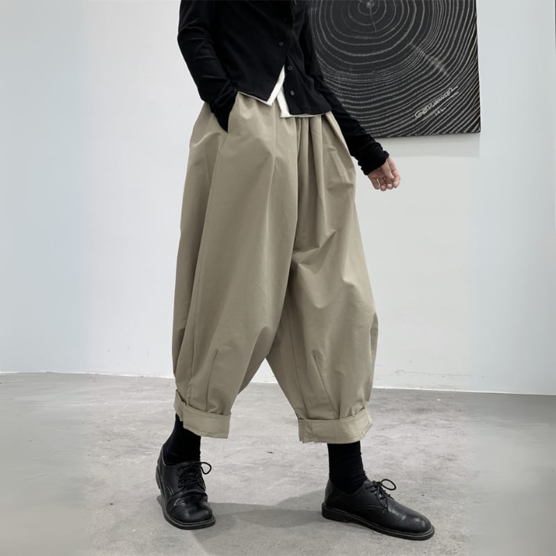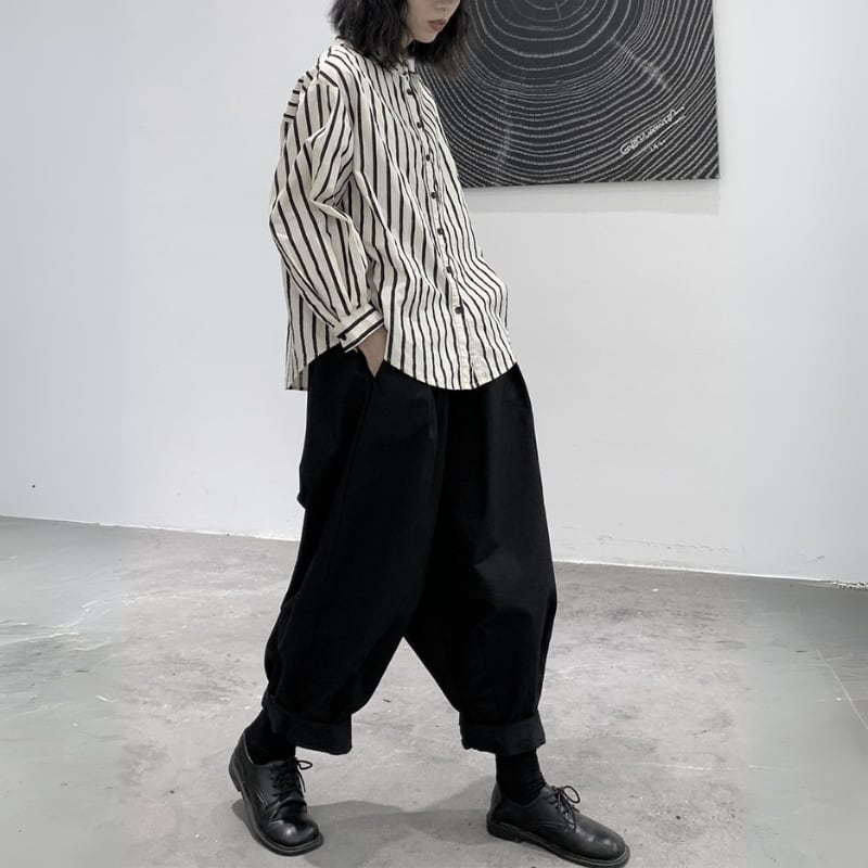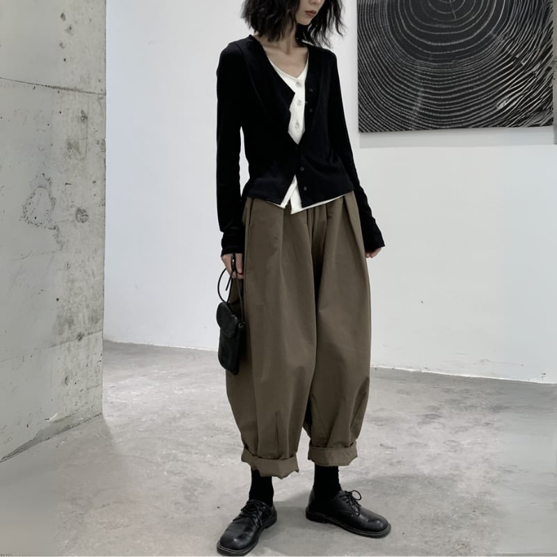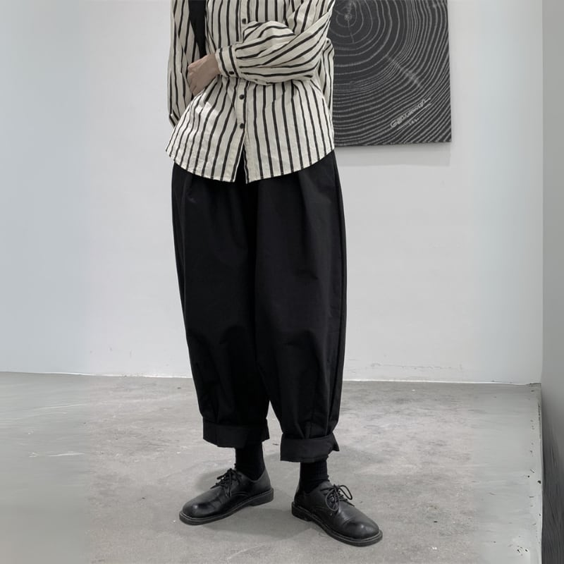 ゆったりとしたワイドなシルエットと、裾に向かって丸みを帯びたバルーンシルエットが、モードな個性を放つパンツ。