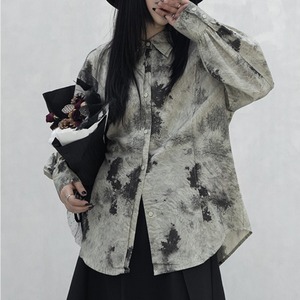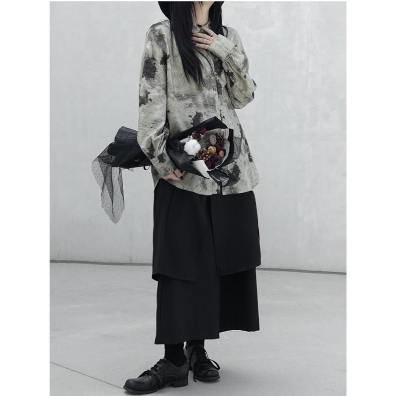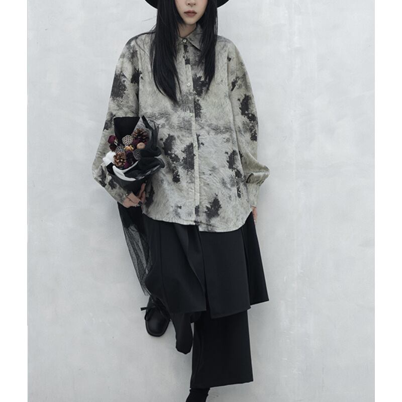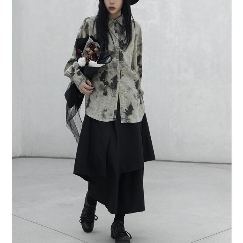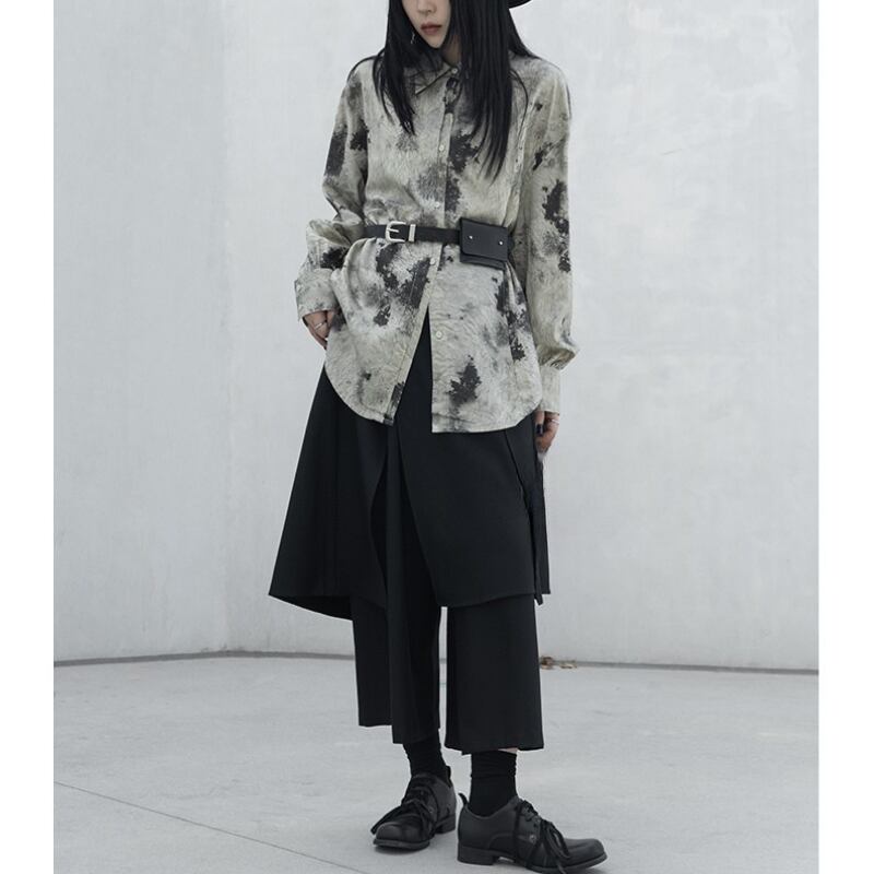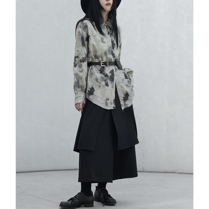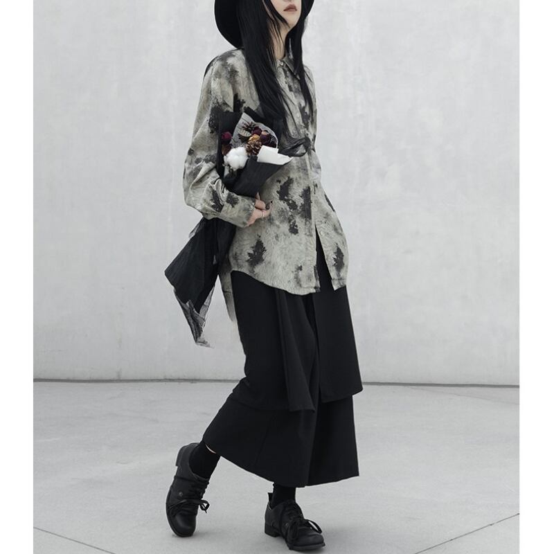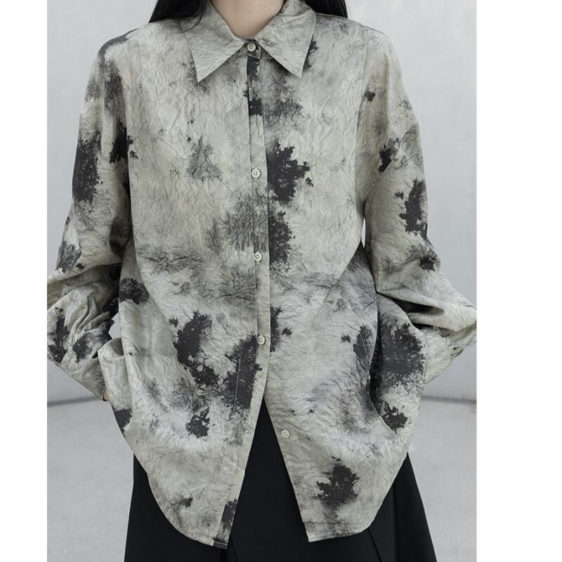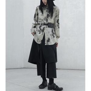 生地全体に施されたシワ加工が、プリントに奥深いニュアンスと立体感を加え、こなれた表情を演出します。