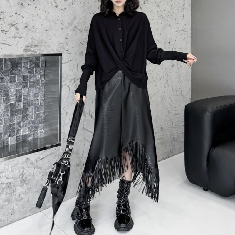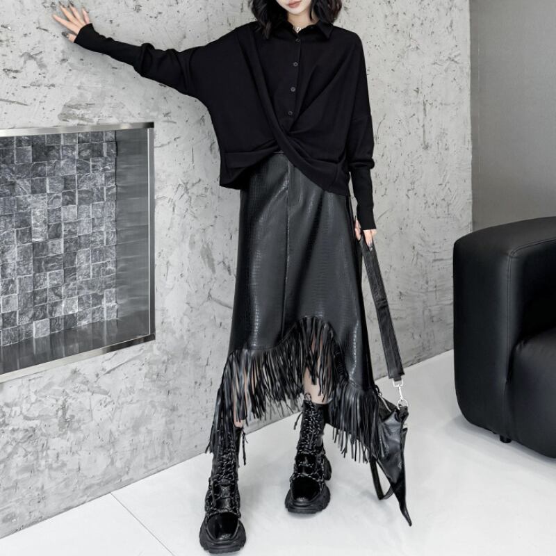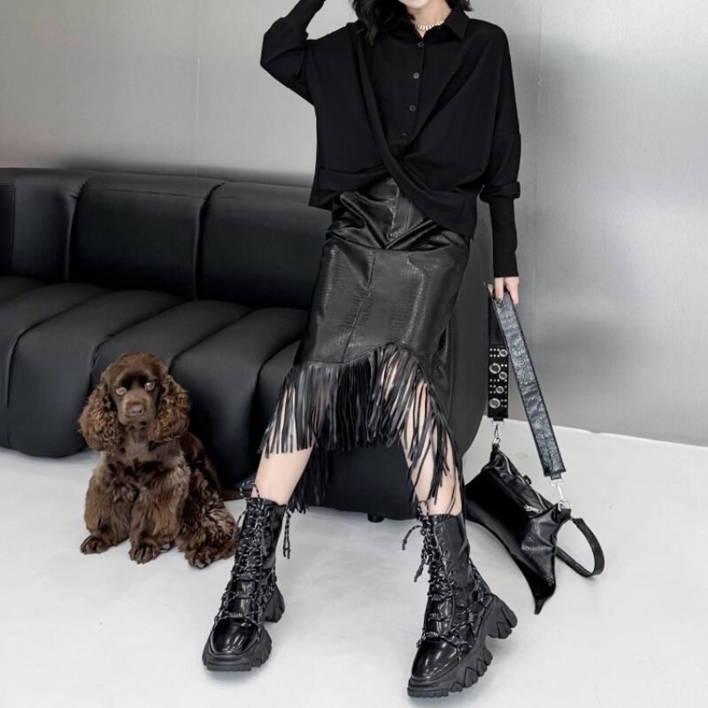 Asymmetrical Eco-Leather Fringe Skirt H0194