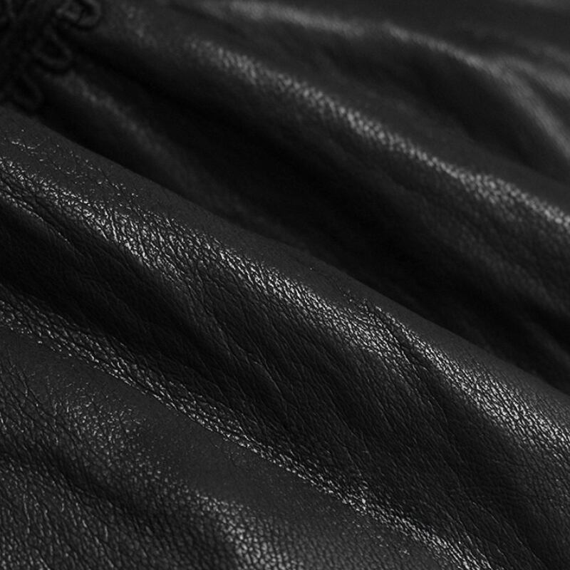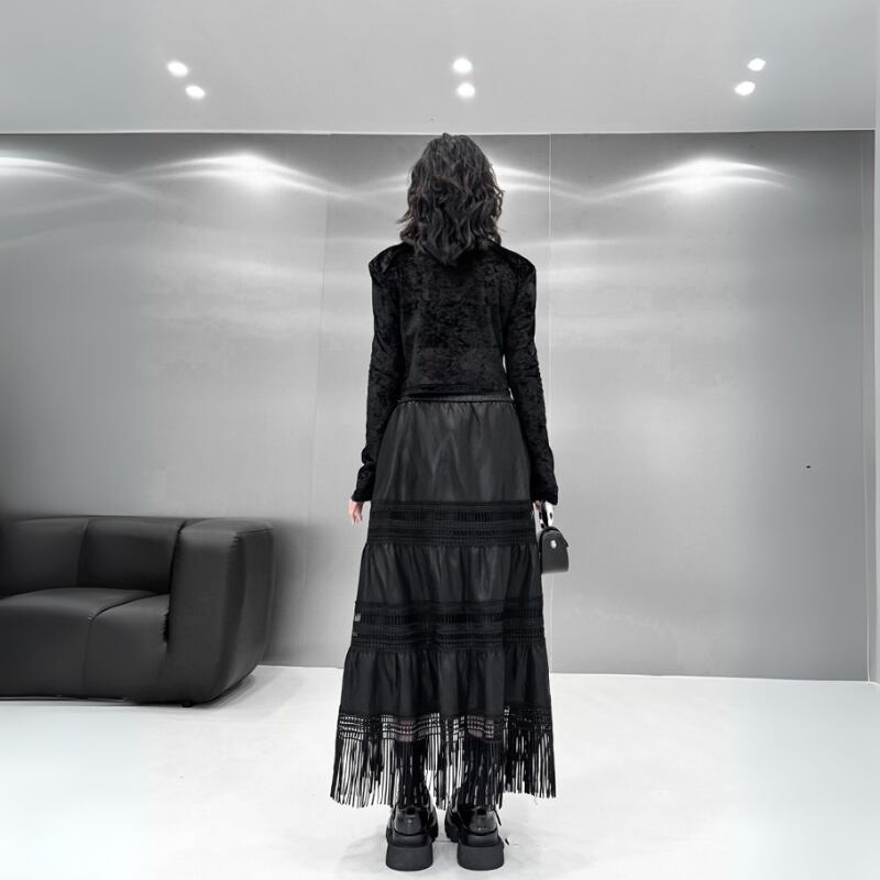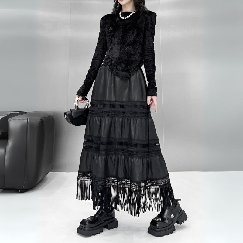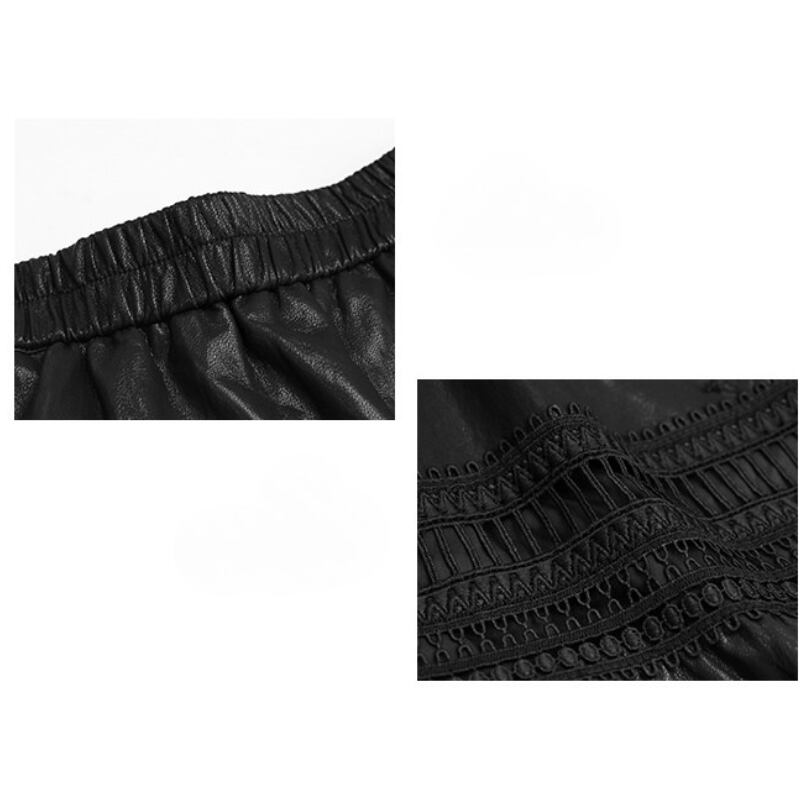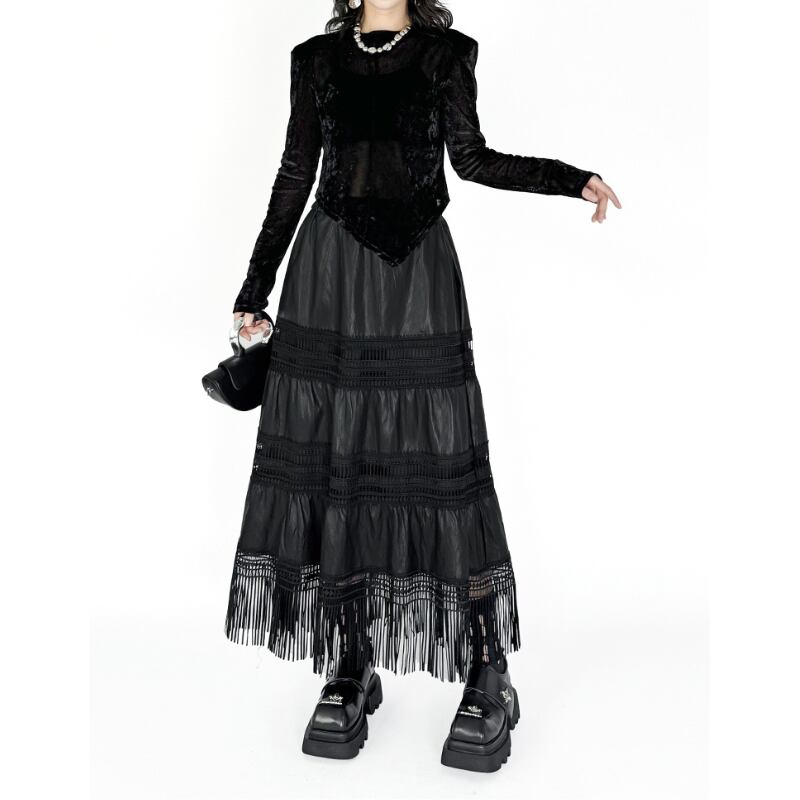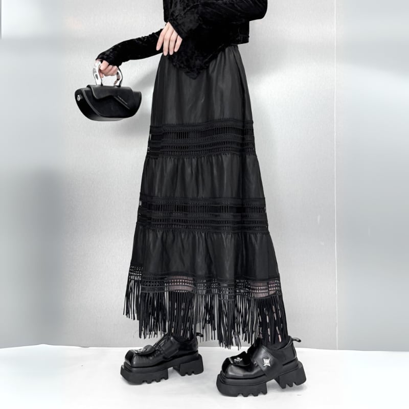 ハードな印象のフェイクレザーと、フェミニンなレースやフリンジを組み合わせることで、甘辛ミックスなスタイルが完成します。