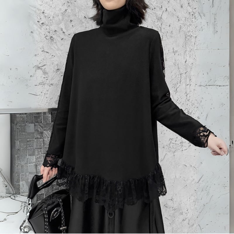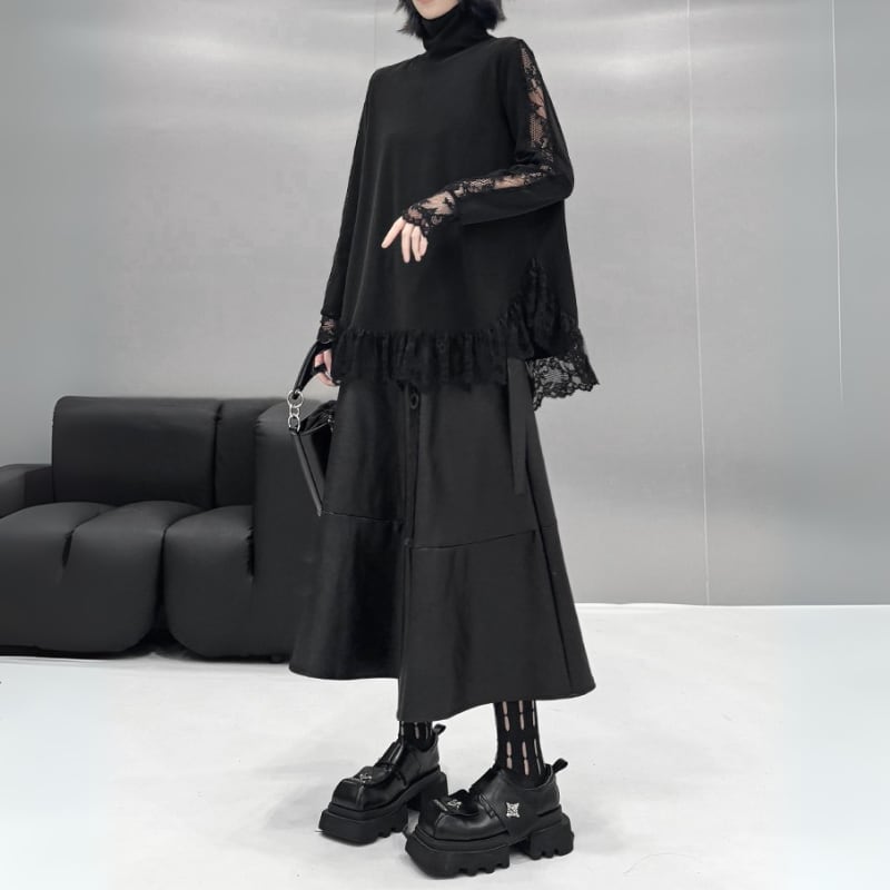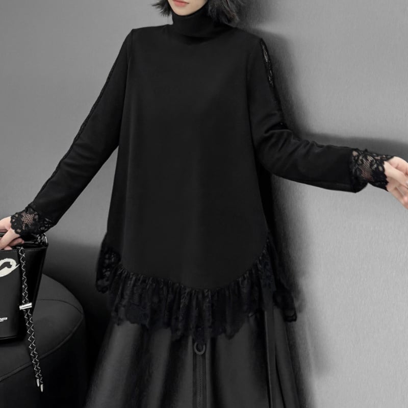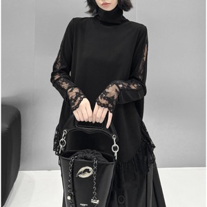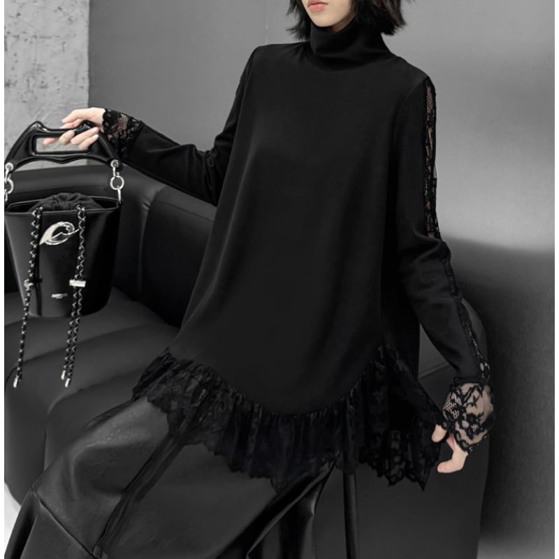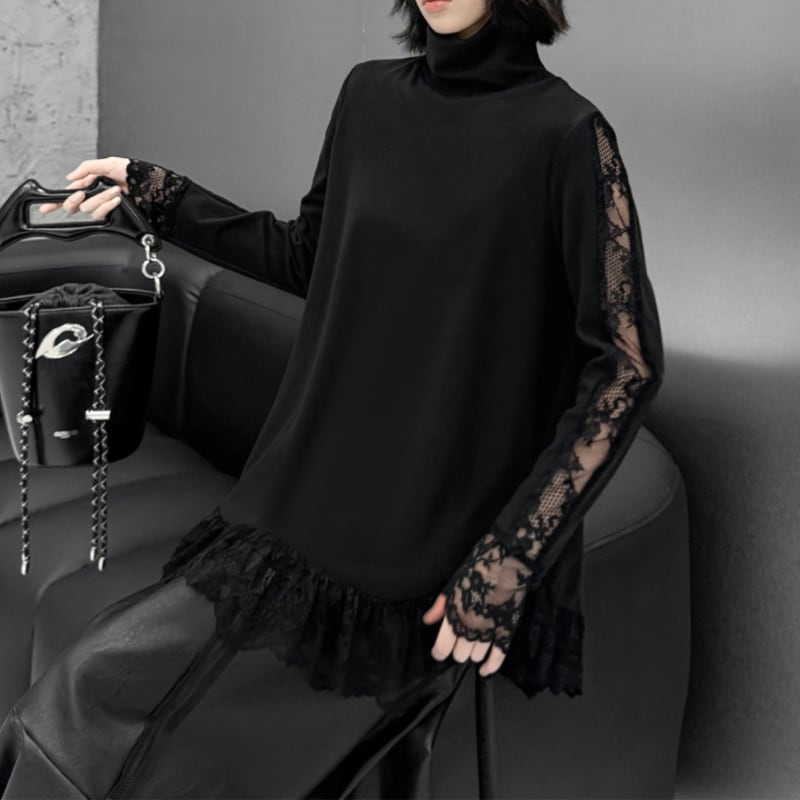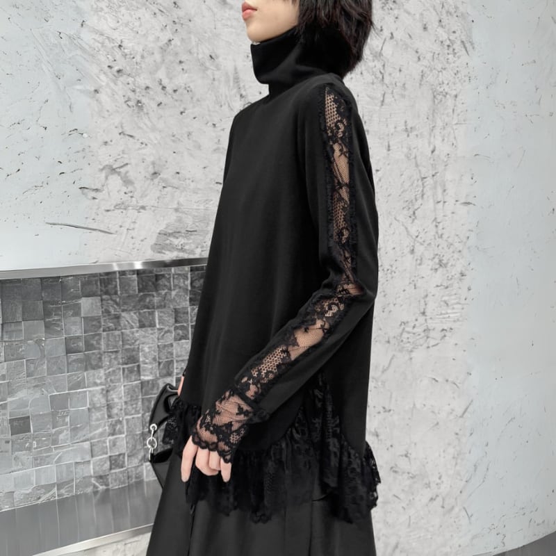 クールなタートルネックと、袖口や裾に施された繊細なレースの切り替えが、甘さと辛さの絶妙なバランスを演出するニット。