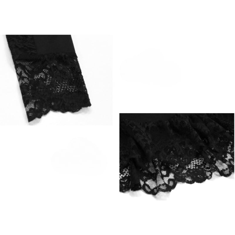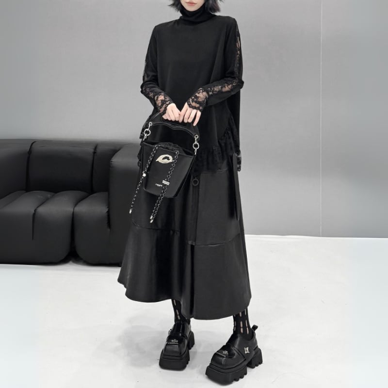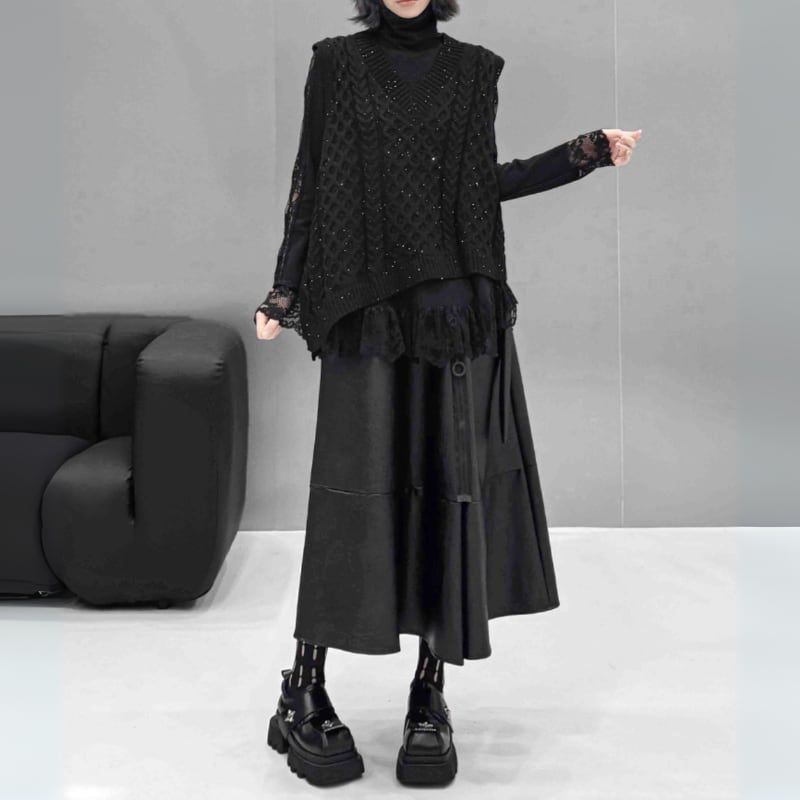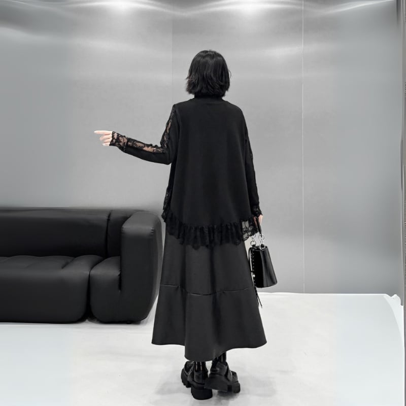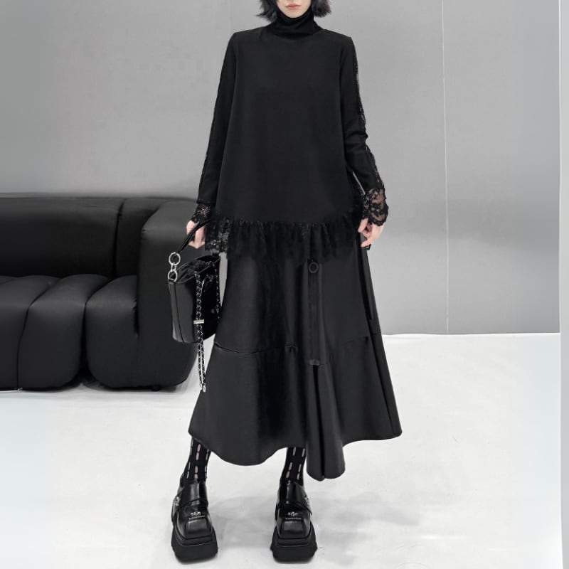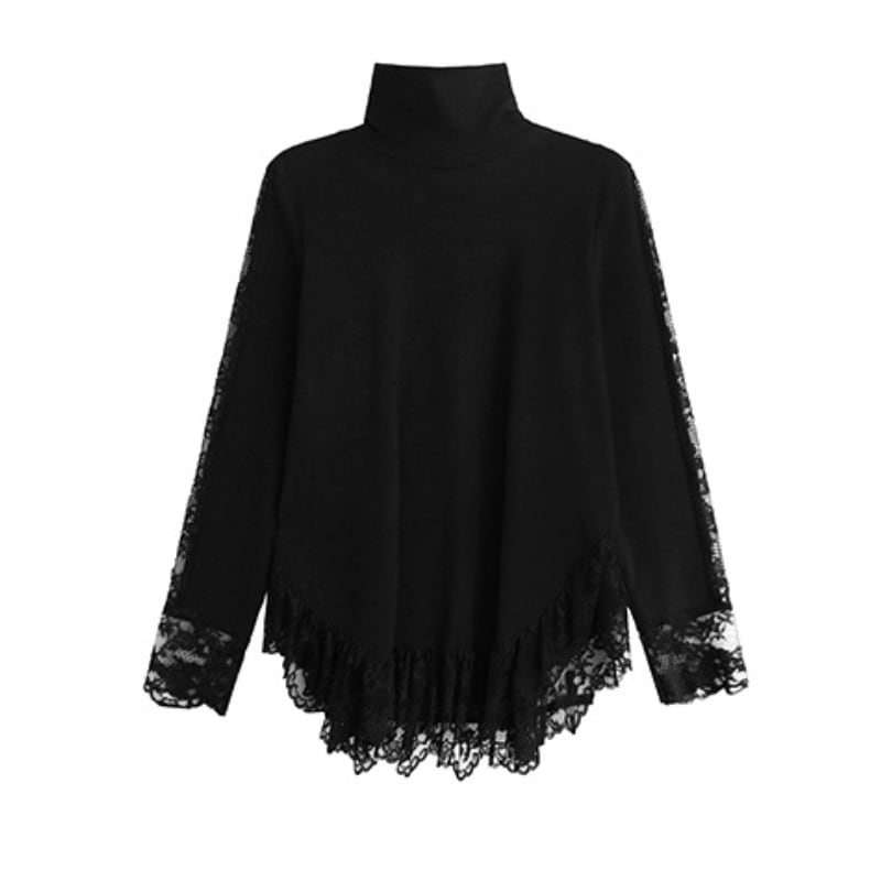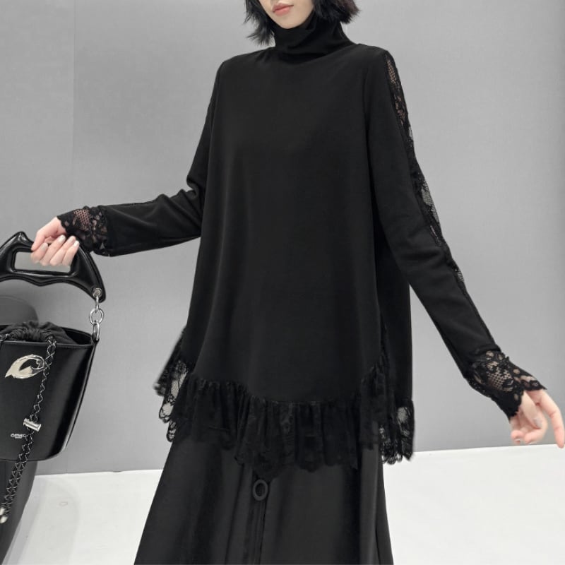 クールなタートルネックと、袖口や裾に施された繊細なレースの切り替えが、甘さと辛さの絶妙なバランスを演出するニット。
