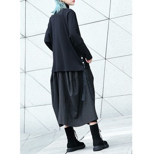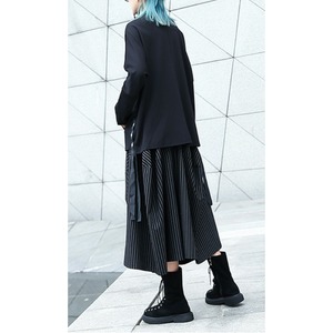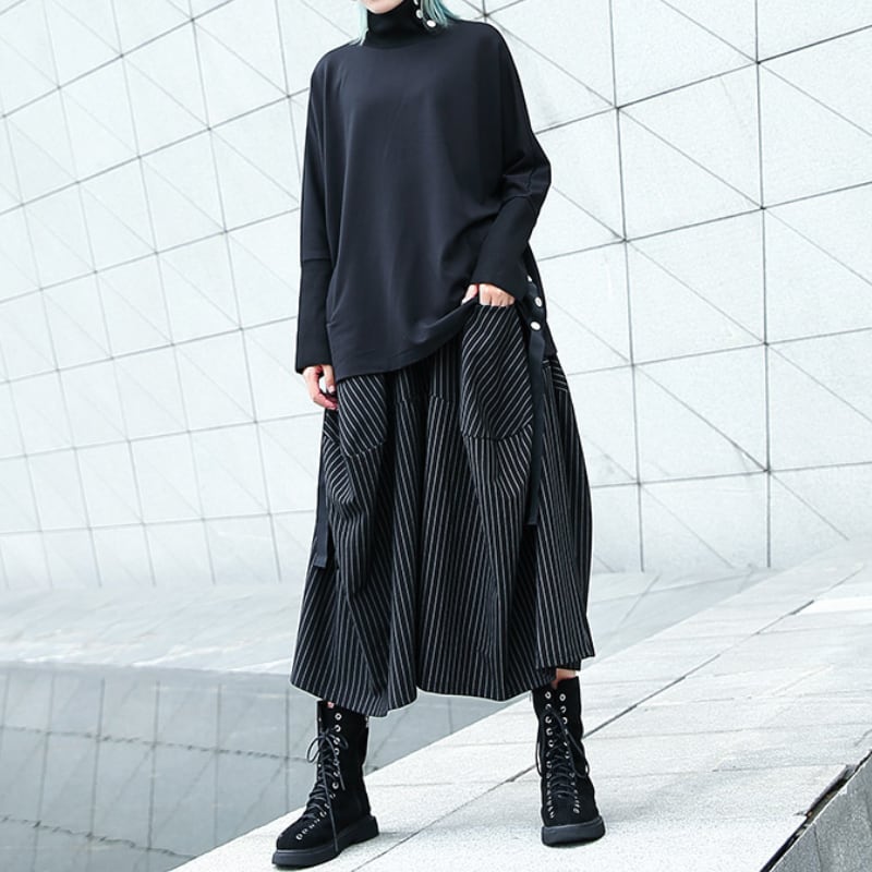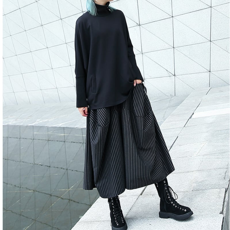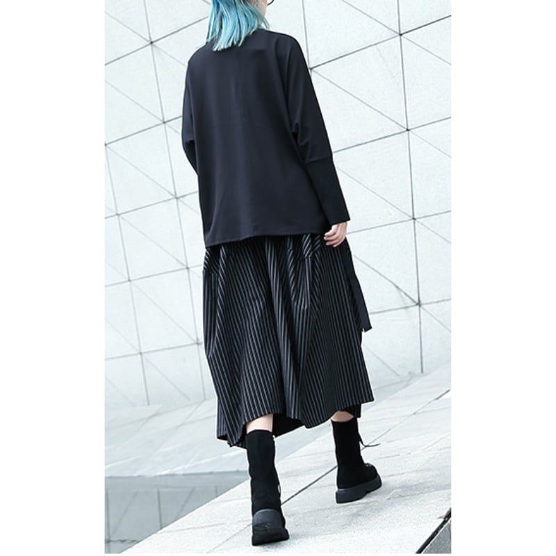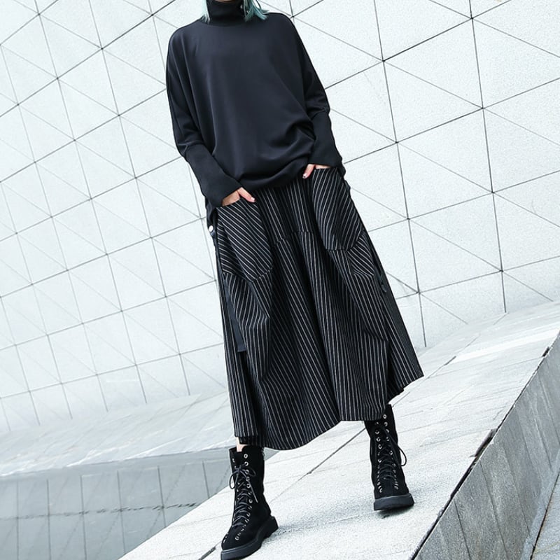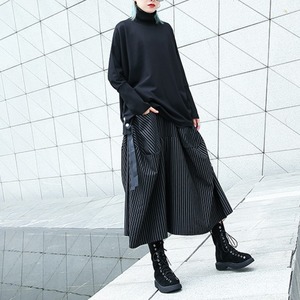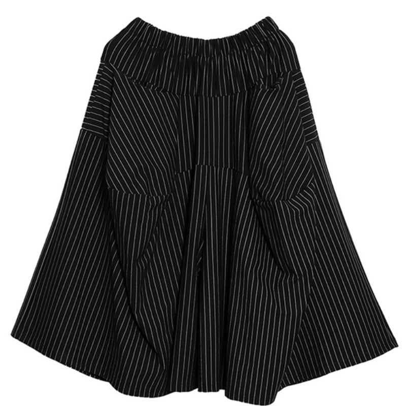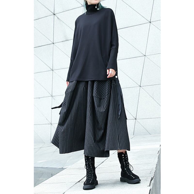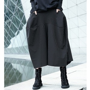 シャープなストライプ柄と、ゆったりとしたワイドシルエットが、モードな存在感を放つパンツ。