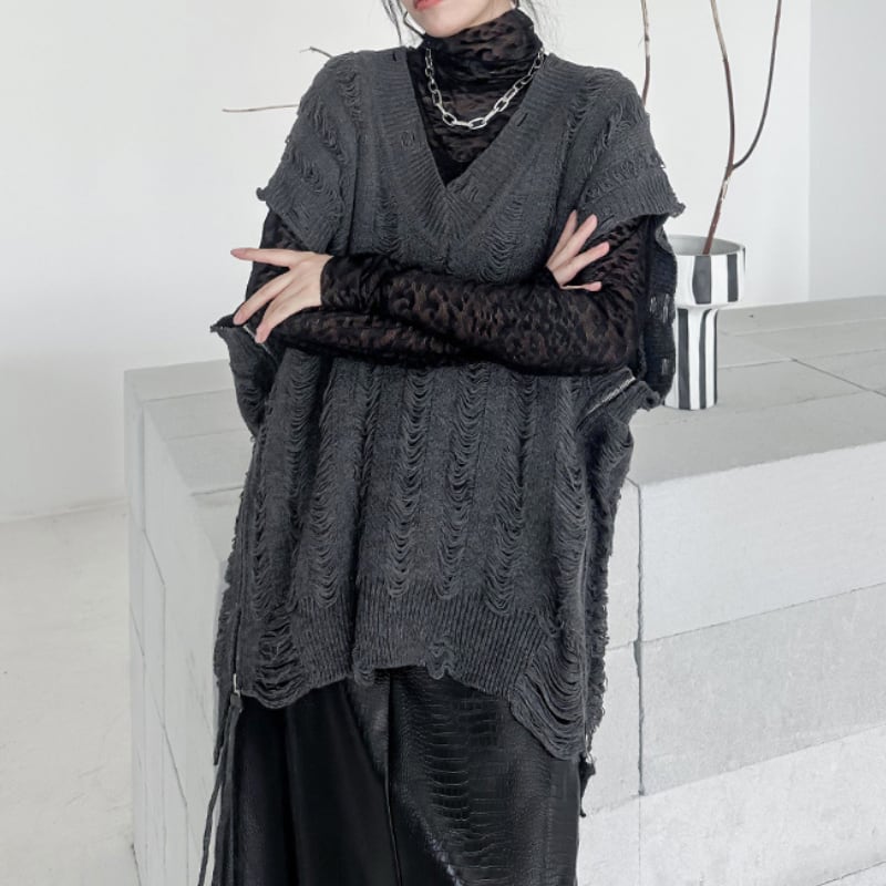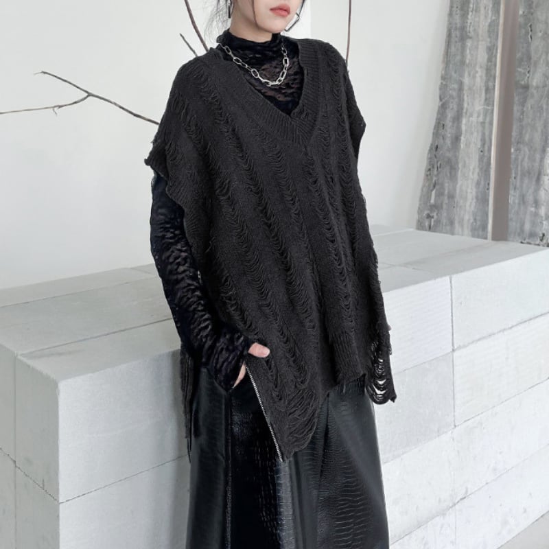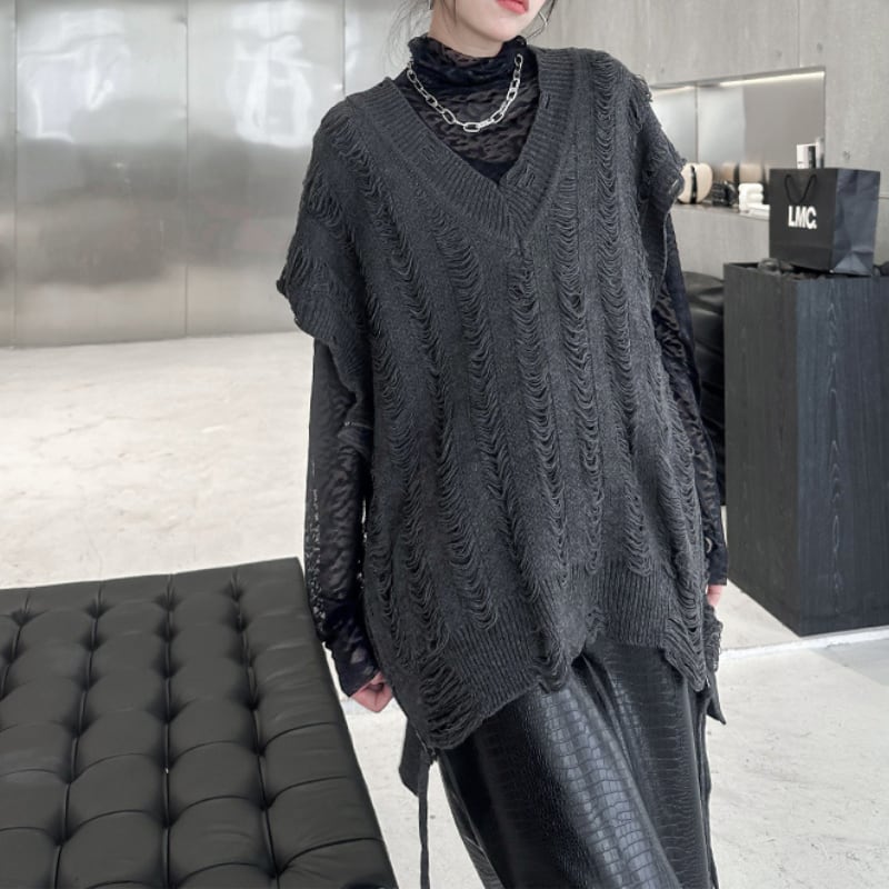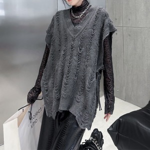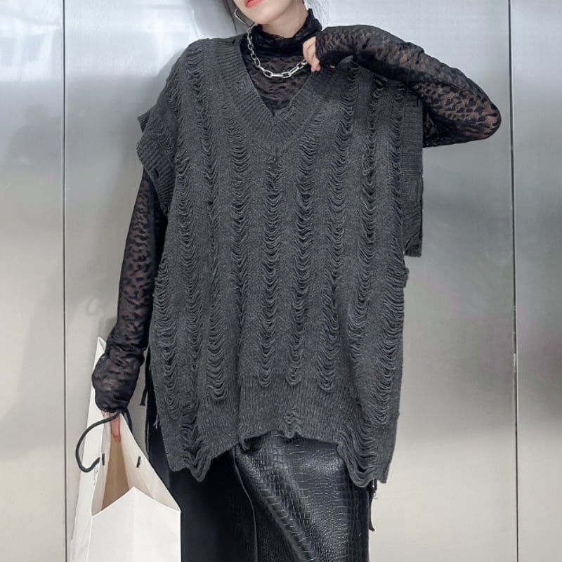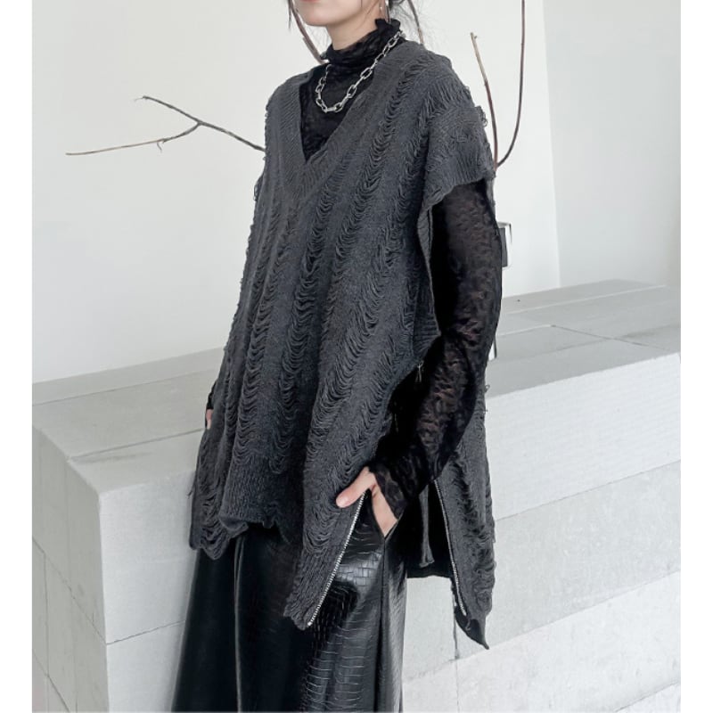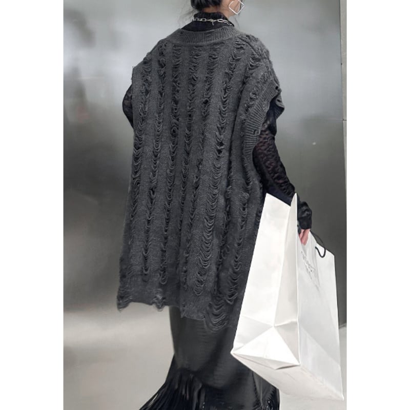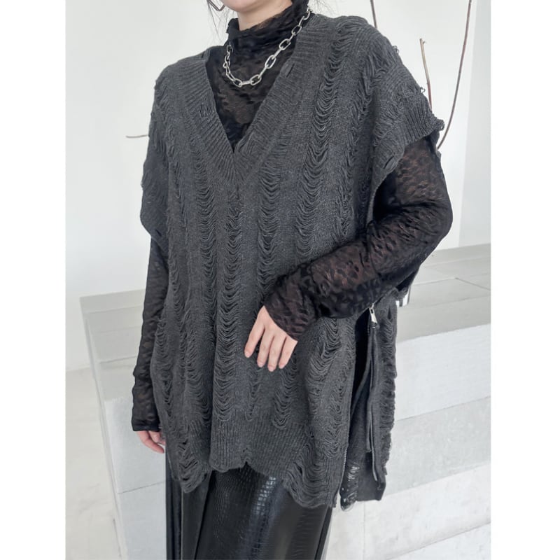 大胆なダメージ加工とVネックのデザインが、モードな雰囲気を演出します。