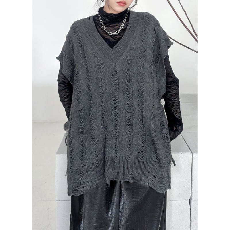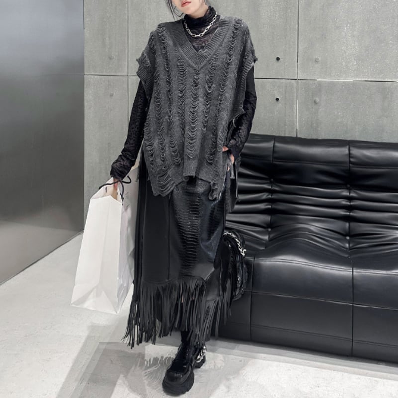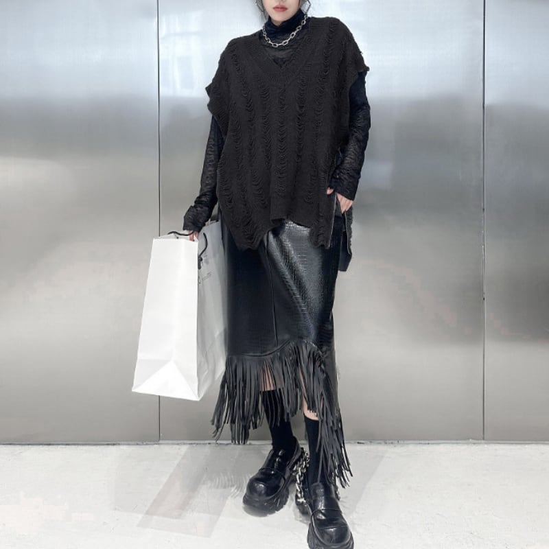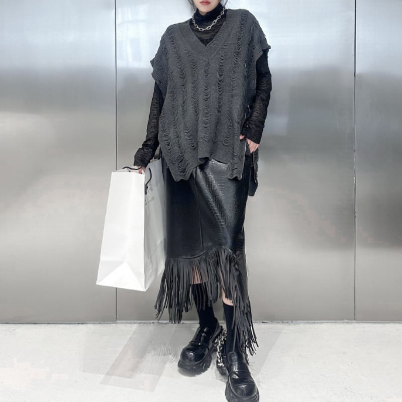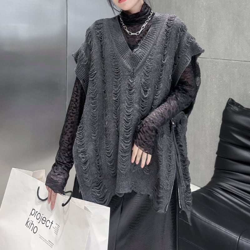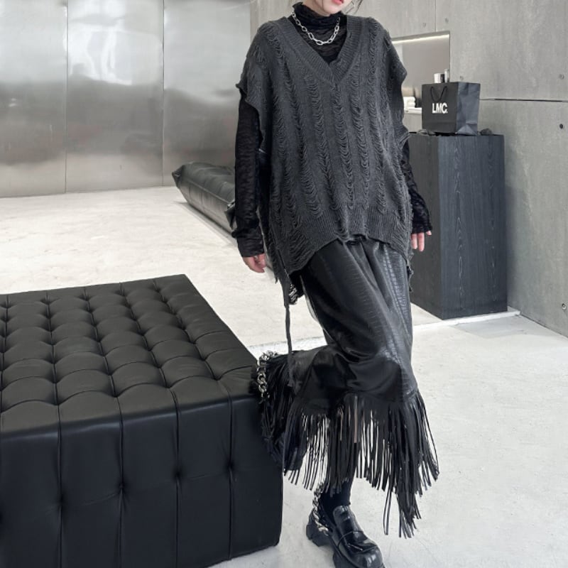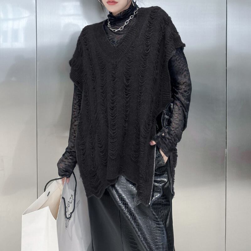 大胆なダメージ加工とVネックのデザインが、モードな雰囲気を演出します。