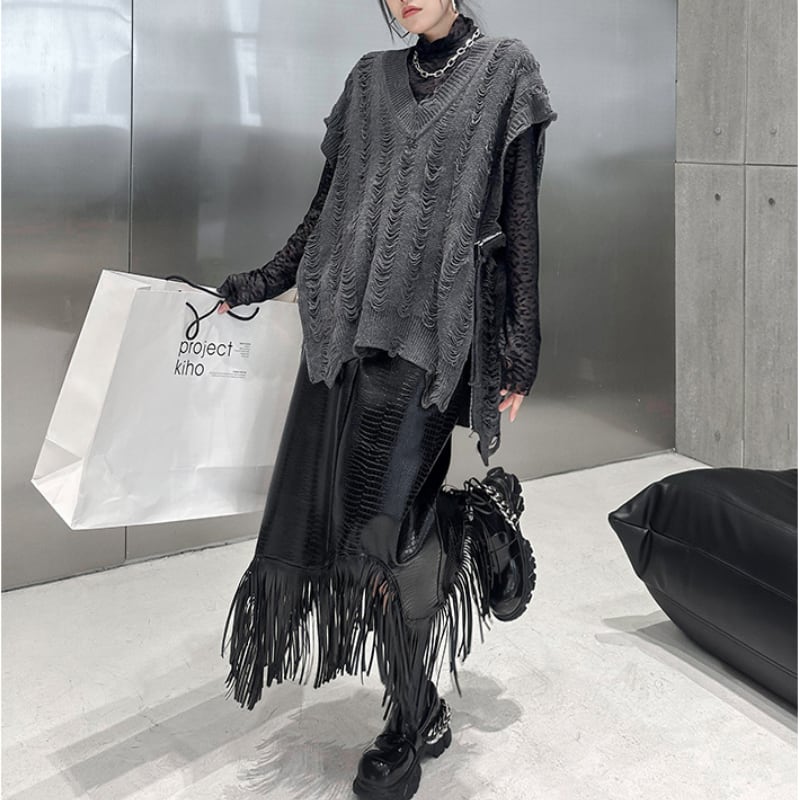 Asymmetrical Eco-Leather Fringe Skirt H0194