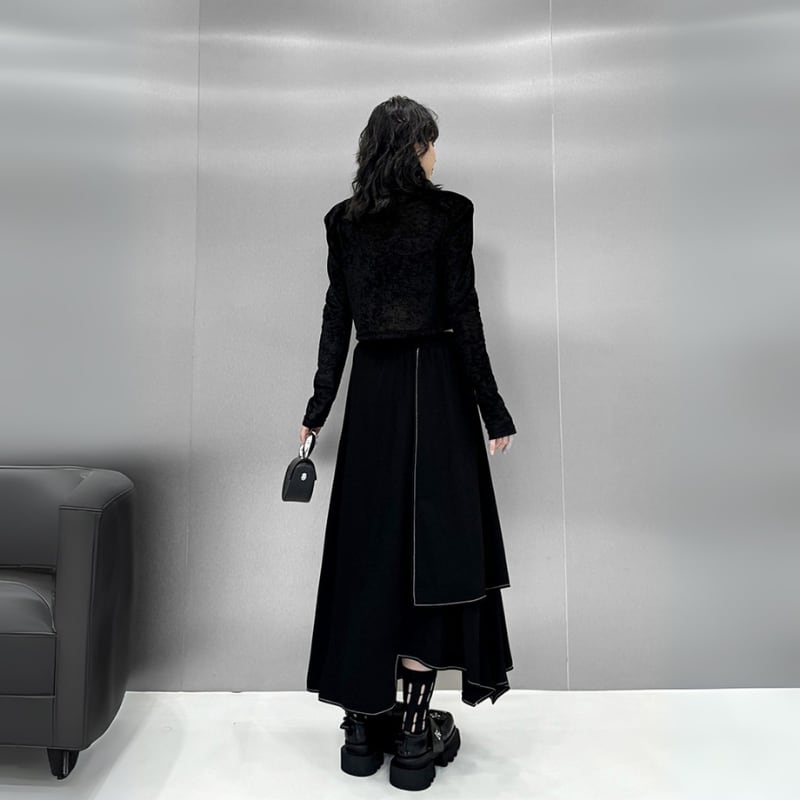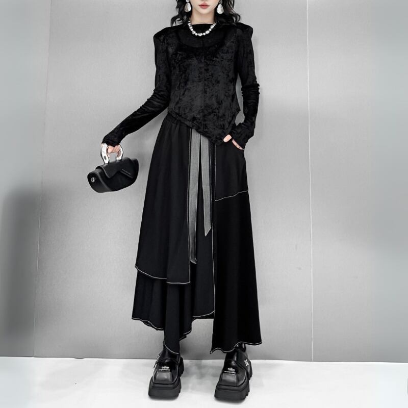歩くたびに揺れるアシンメトリーな裾のラインが、クールでモードな雰囲気を演出し、シンプルながらも個性的なスタイルが完成します。
