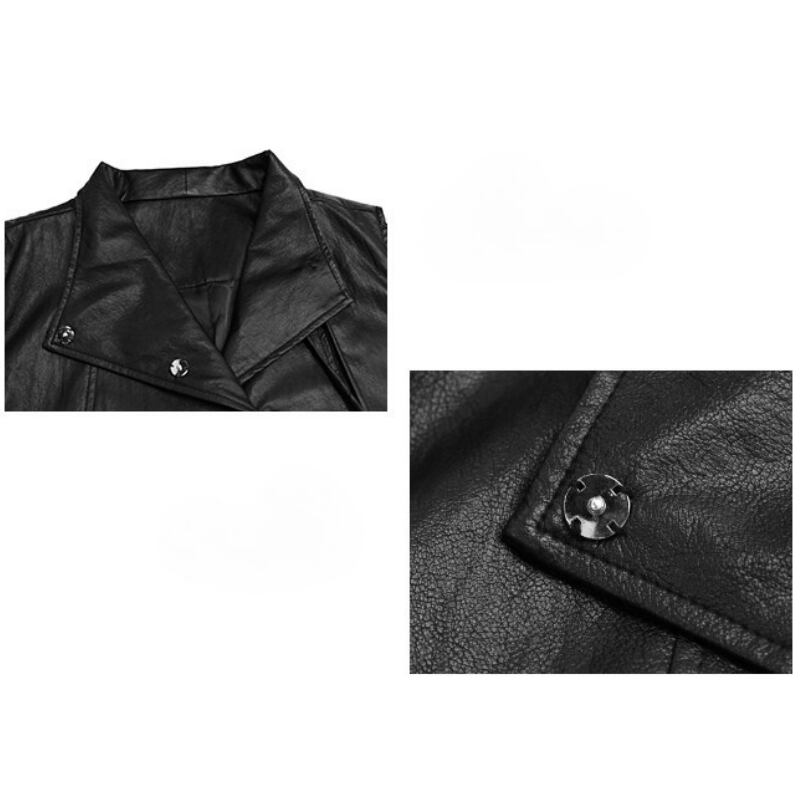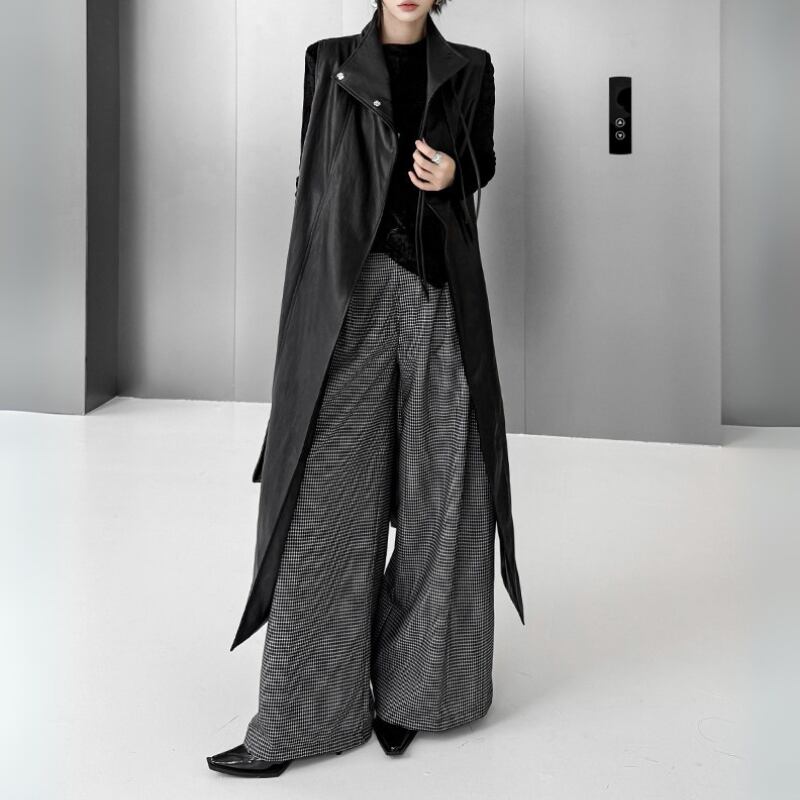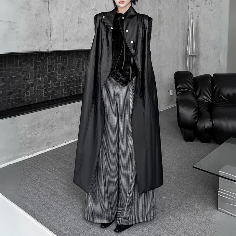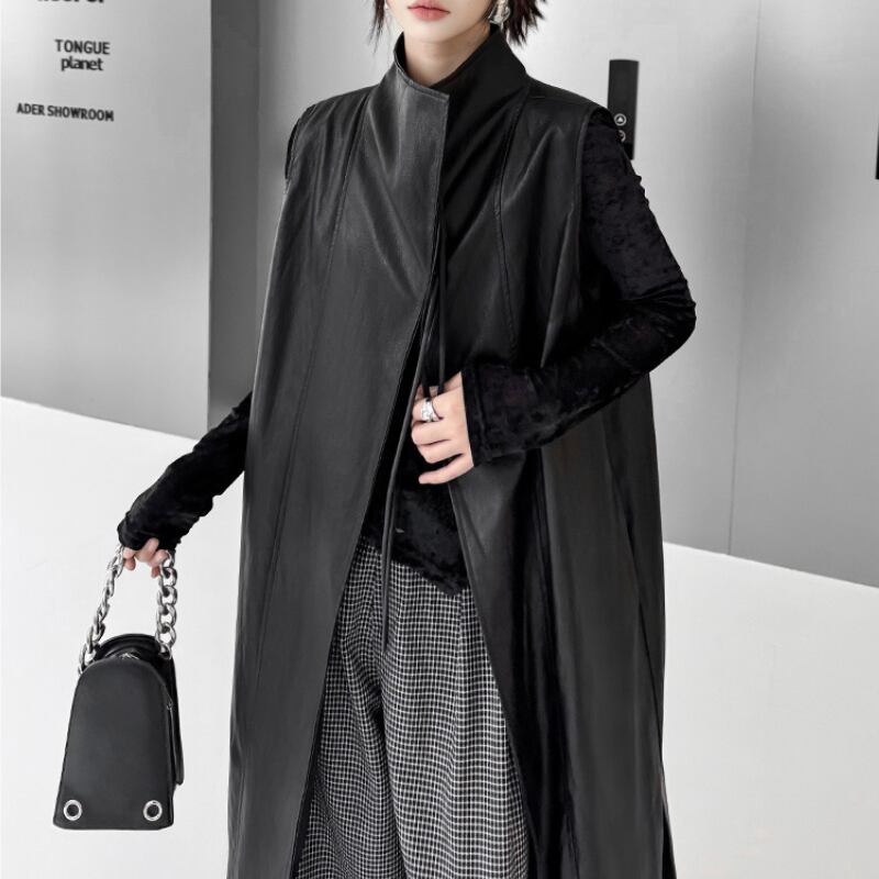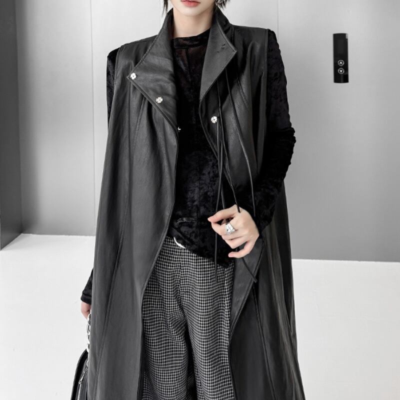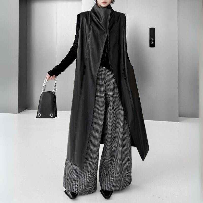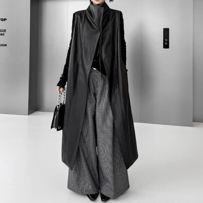 クールな印象のフェイクレザー素材と、首元をすっきりと見せるスタンドカラーが、洗練された大人のスタイルを演出します。