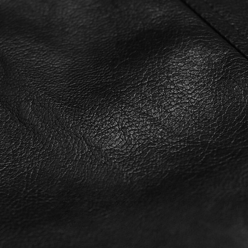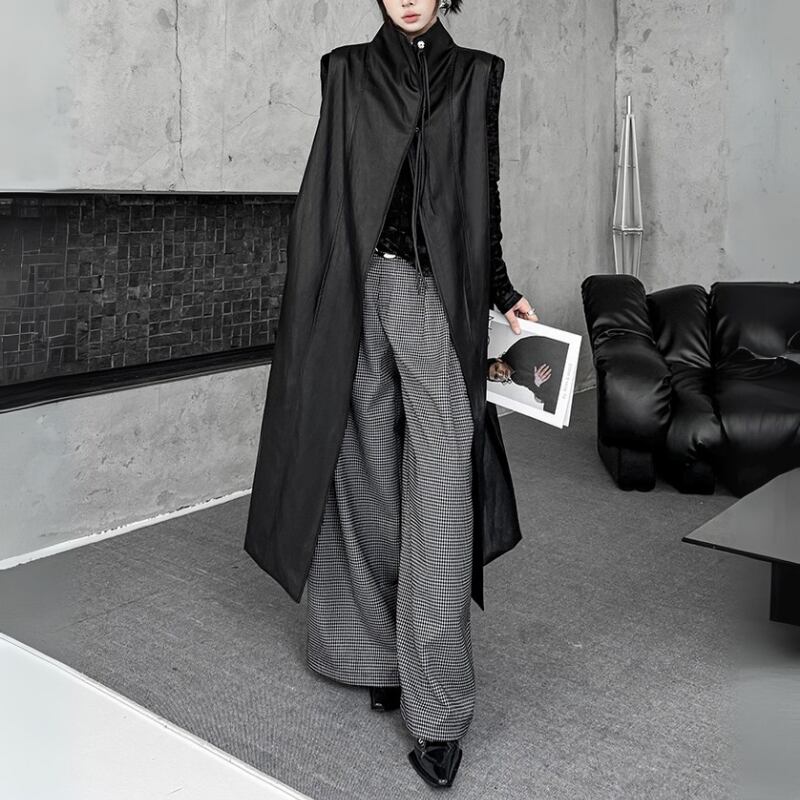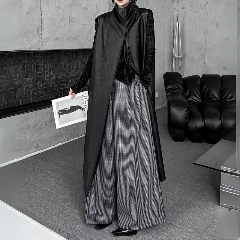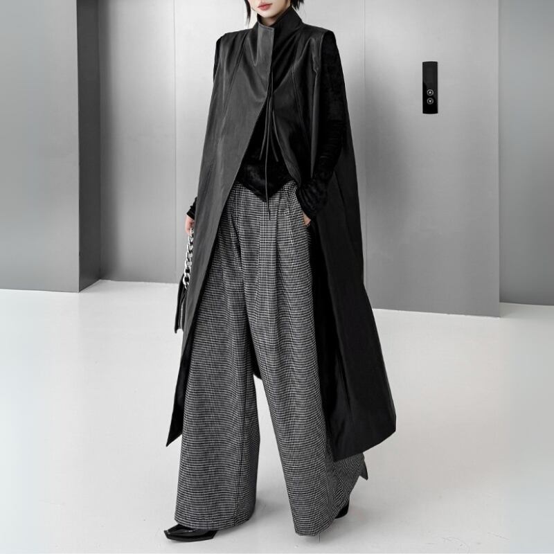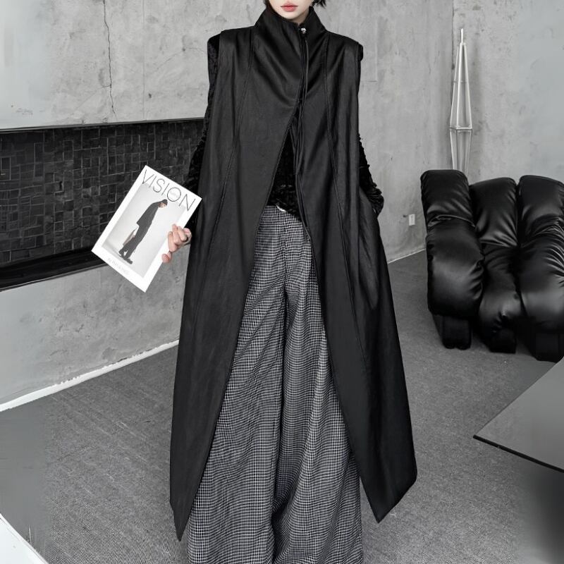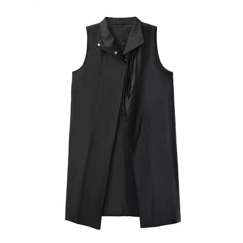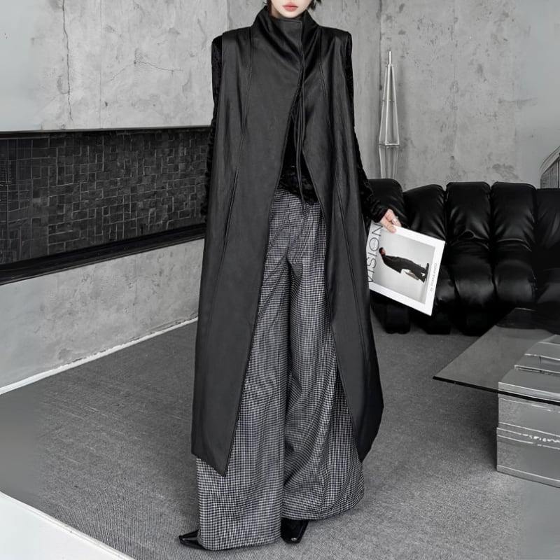 クールな印象のフェイクレザー素材と、首元をすっきりと見せるスタンドカラーが、洗練された大人のスタイルを演出します。