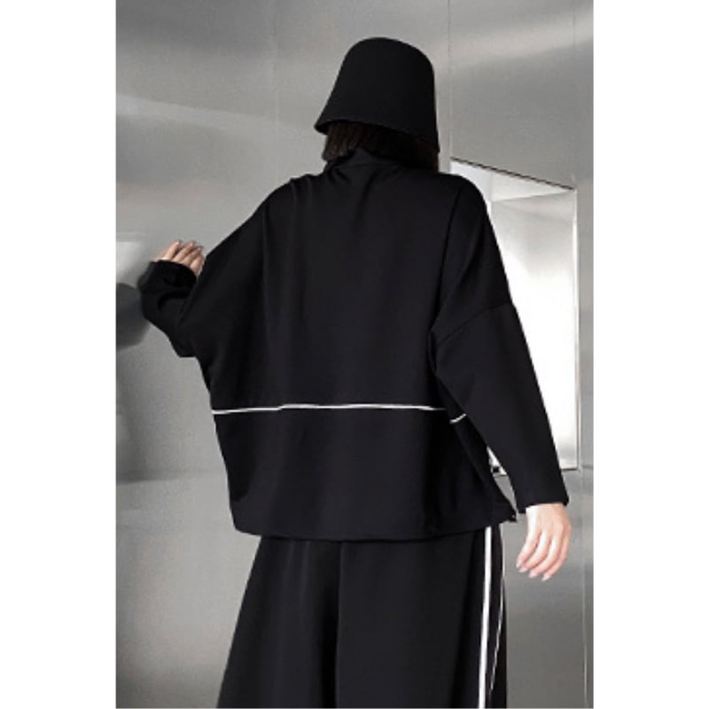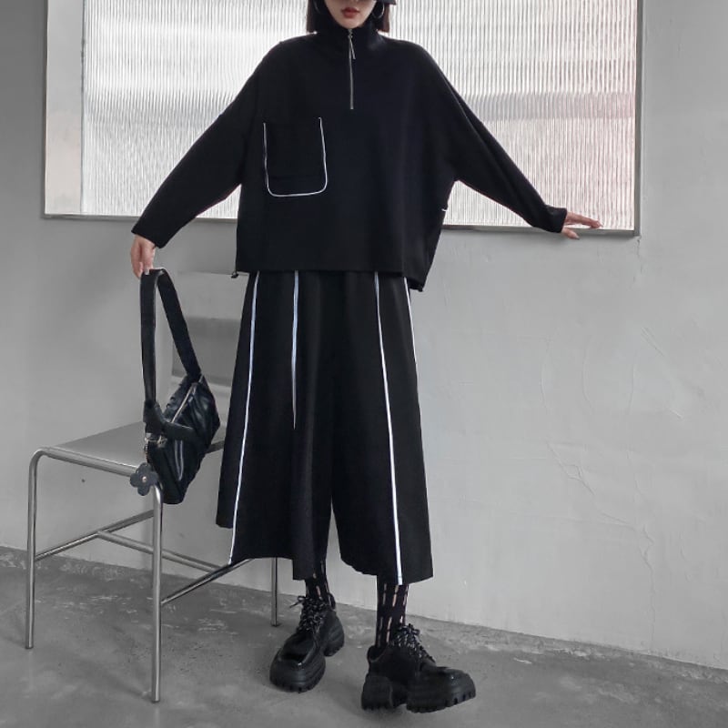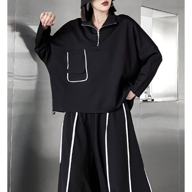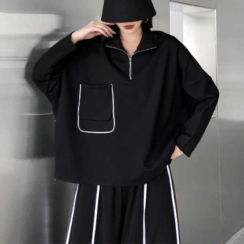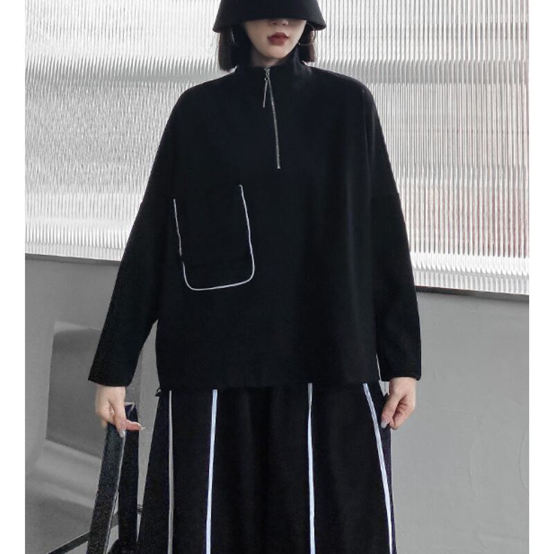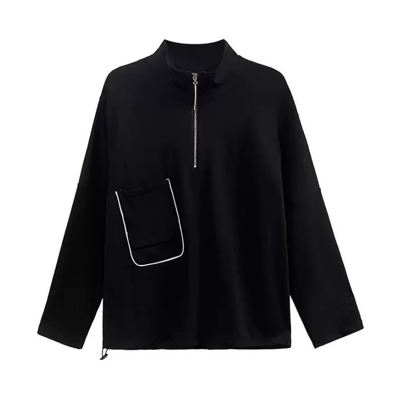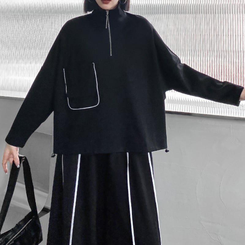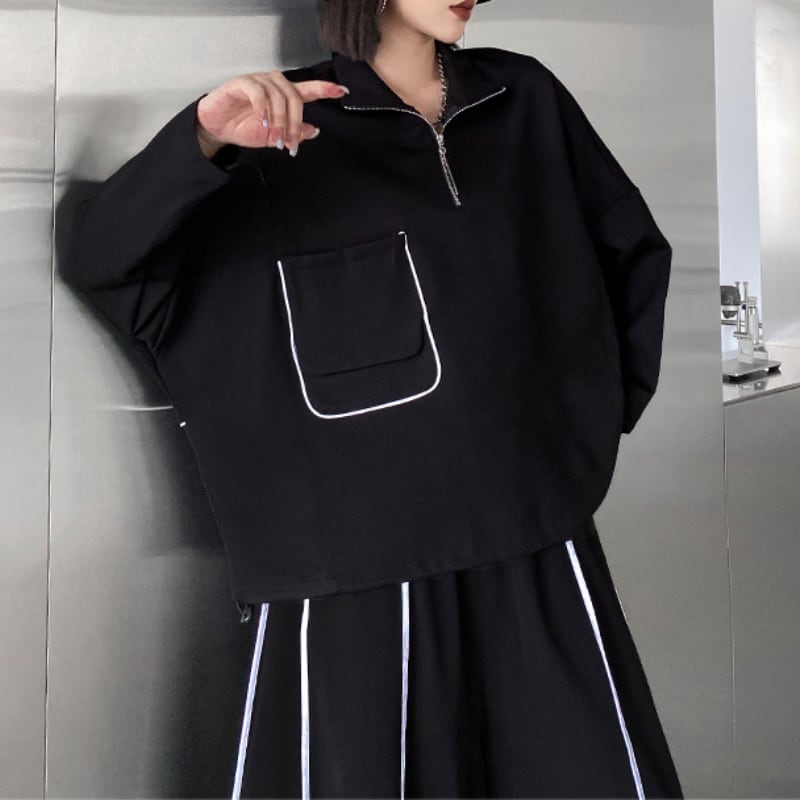 クールな印象のハーフジップと、コントラストの効いた白いパイピングデザインが、シンプルながらも洗練された雰囲気を演出します。