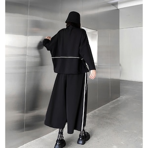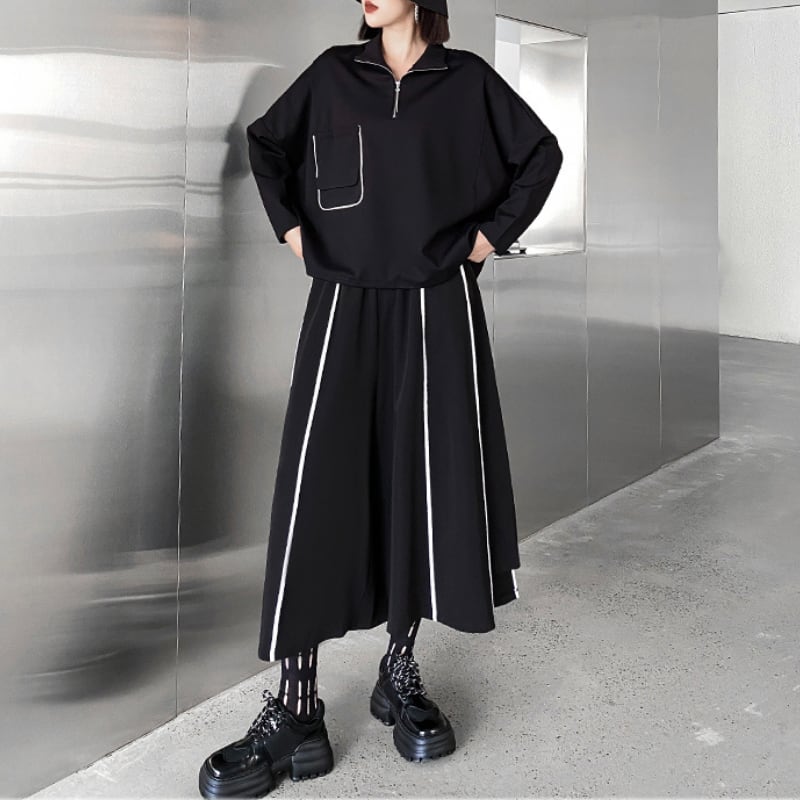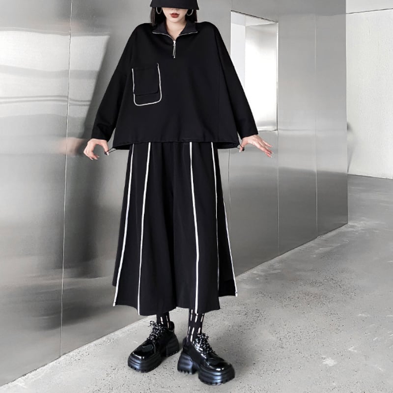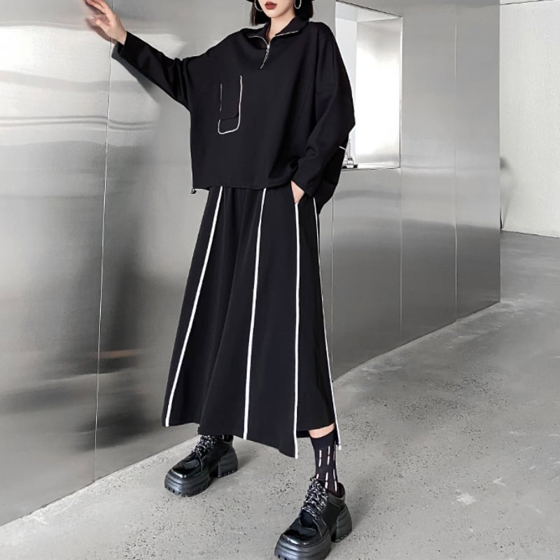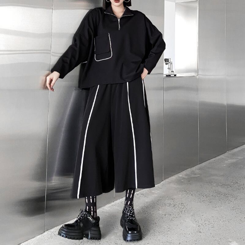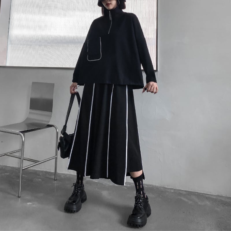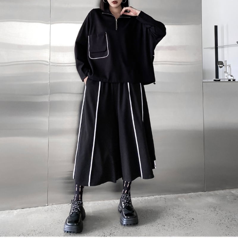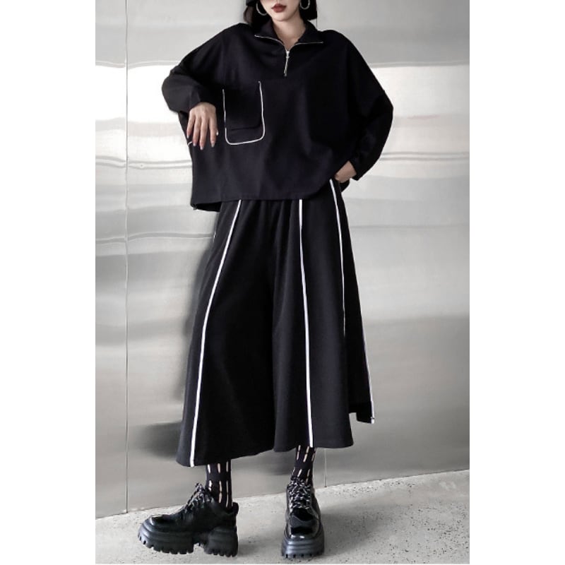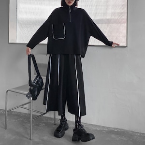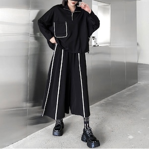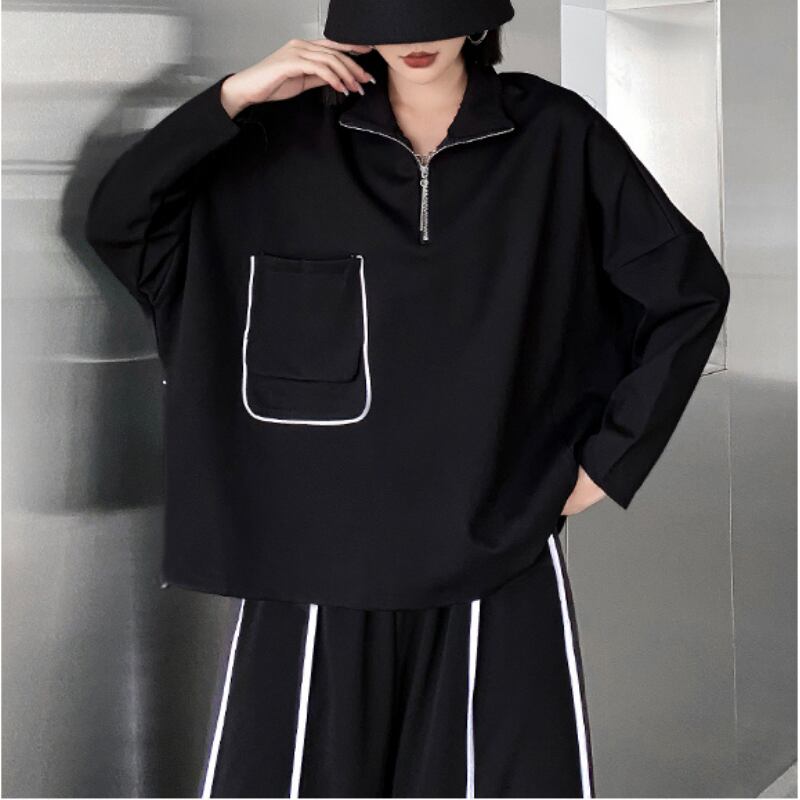 クールな印象のハーフジップと、コントラストの効いた白いパイピングデザインが、シンプルながらも洗練された雰囲気を演出します。