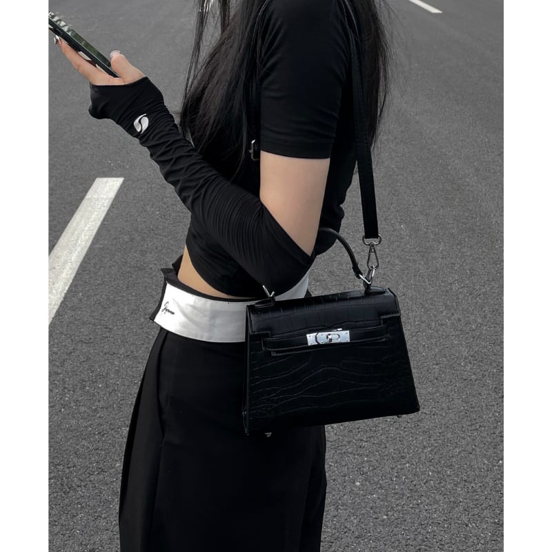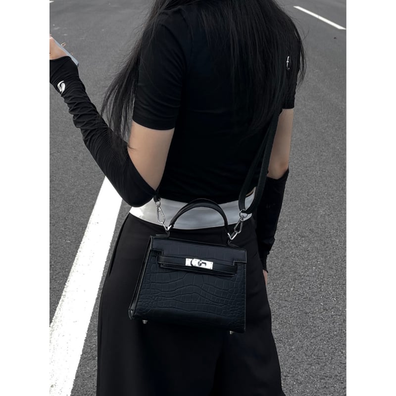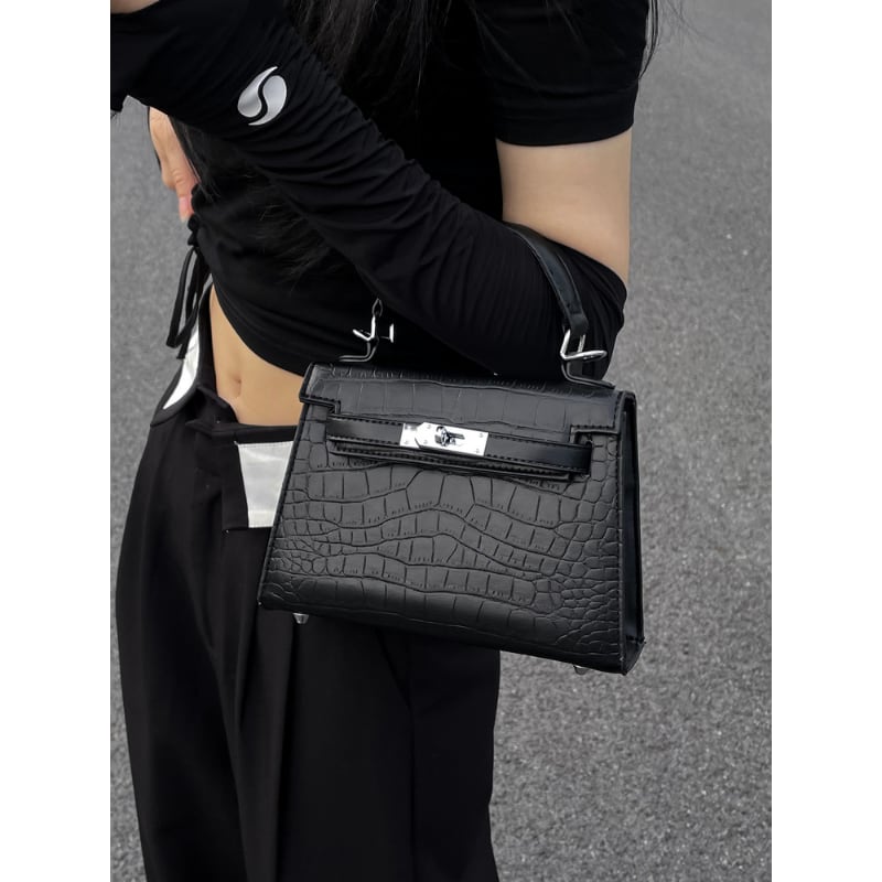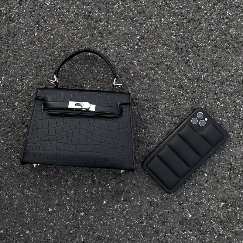 光沢のあるクロコダイル調のエンボス加工を施し、シンプルながらも主張のあるテクスチャーが、コーディネート全体をクールに引き締めます。