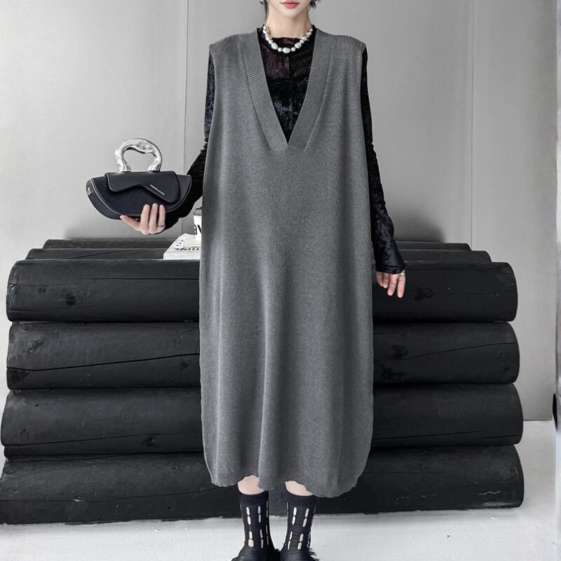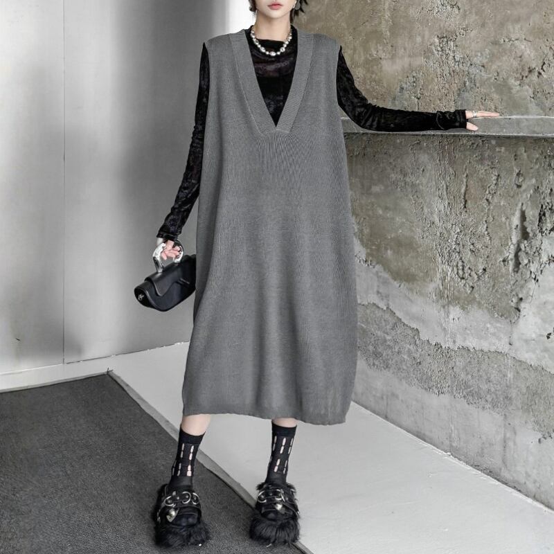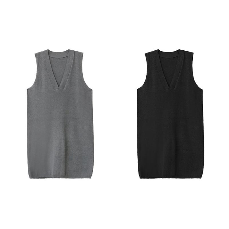 Loose Fit Deep V-Neck Knit Vest Dress H0272