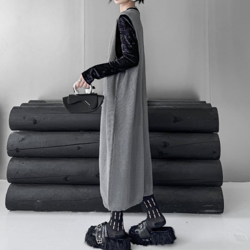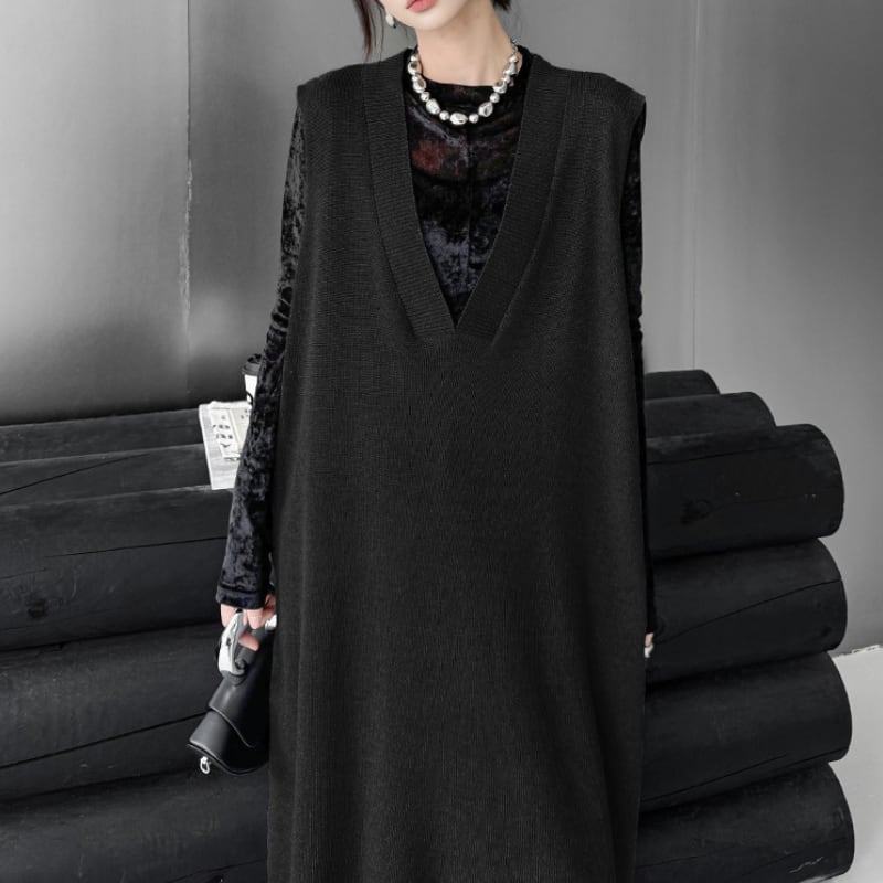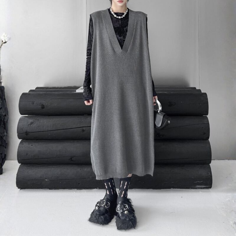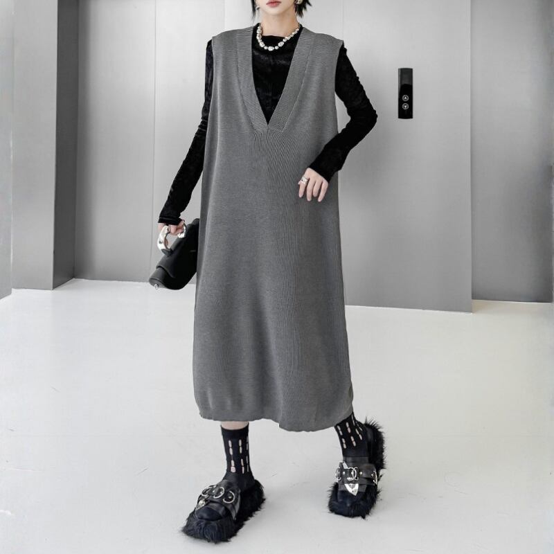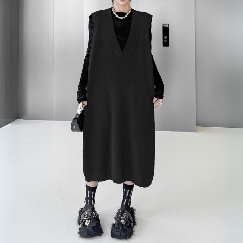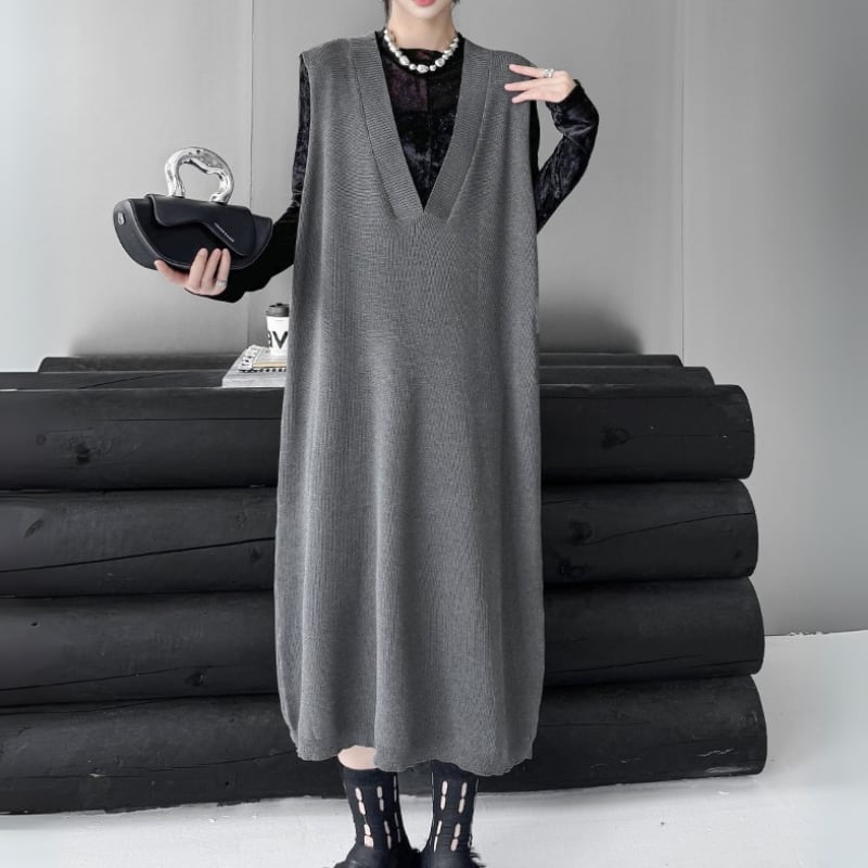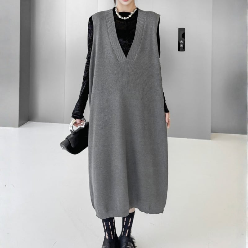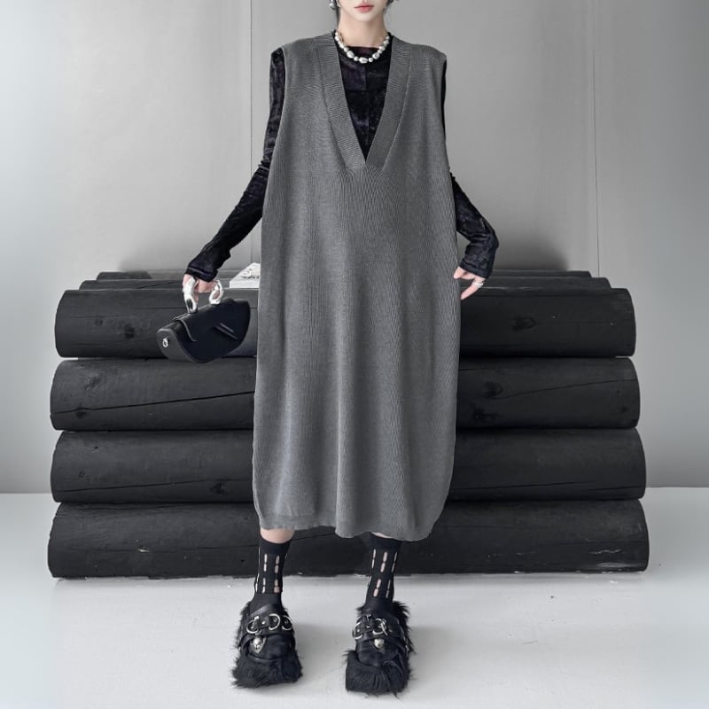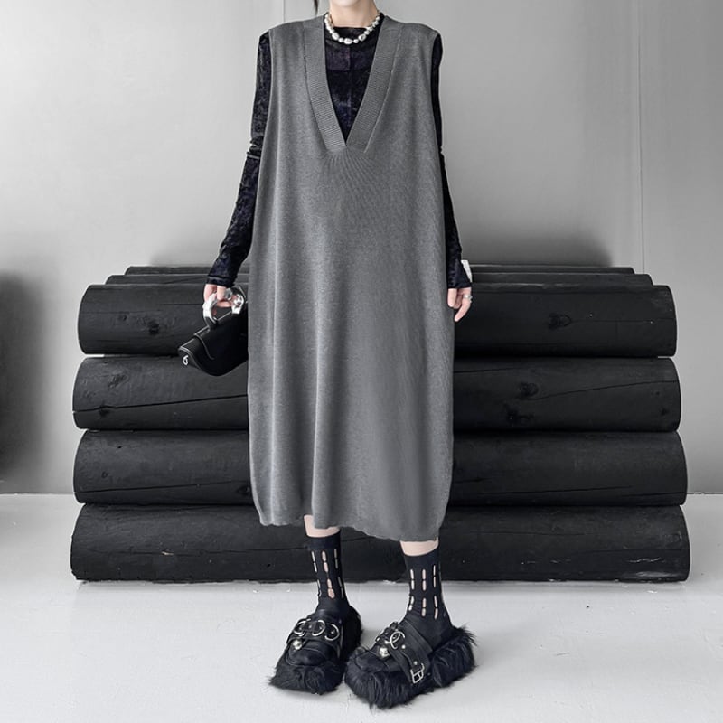 ルーズシルエット ディープVネック ニットベストワンピース
