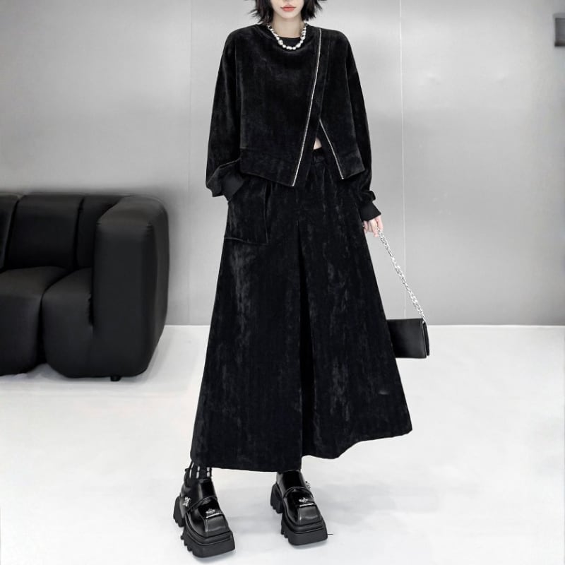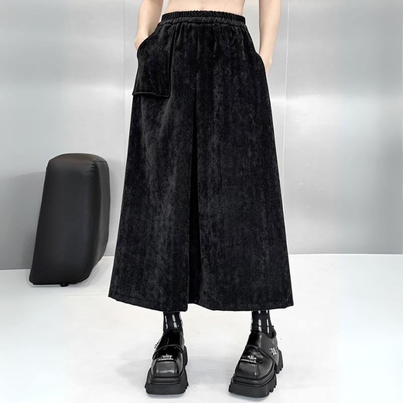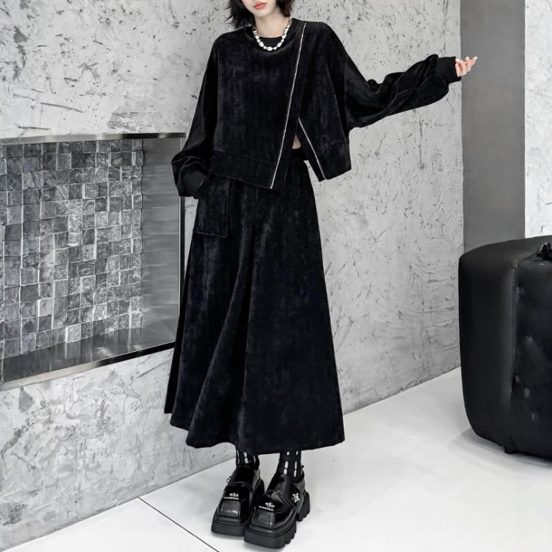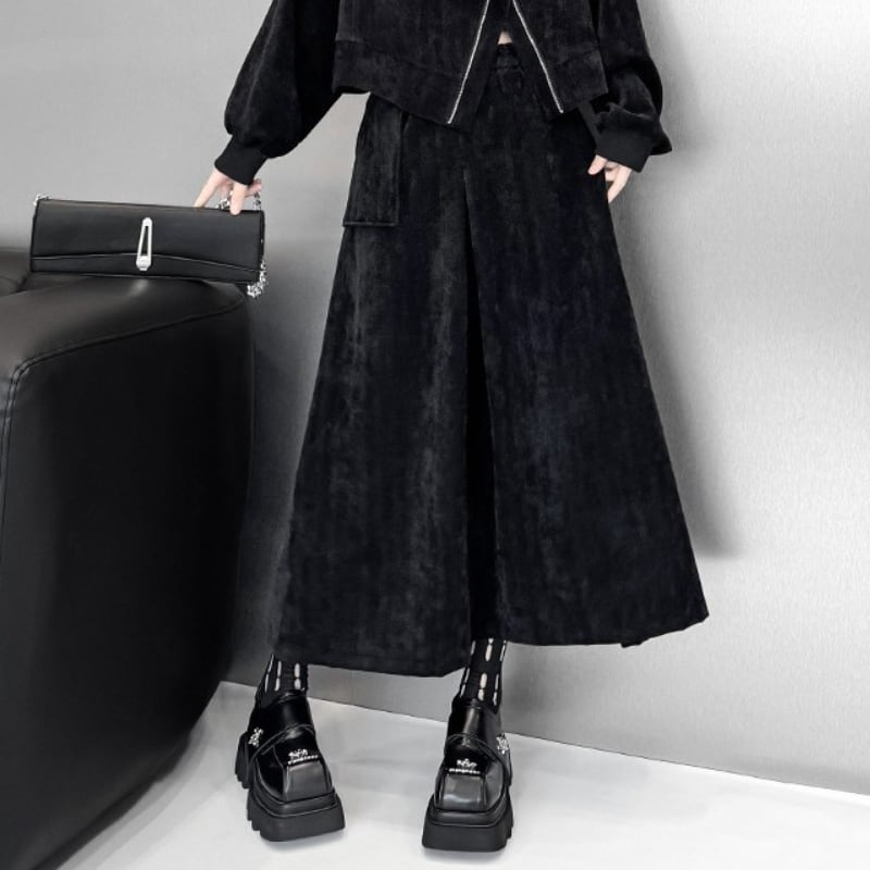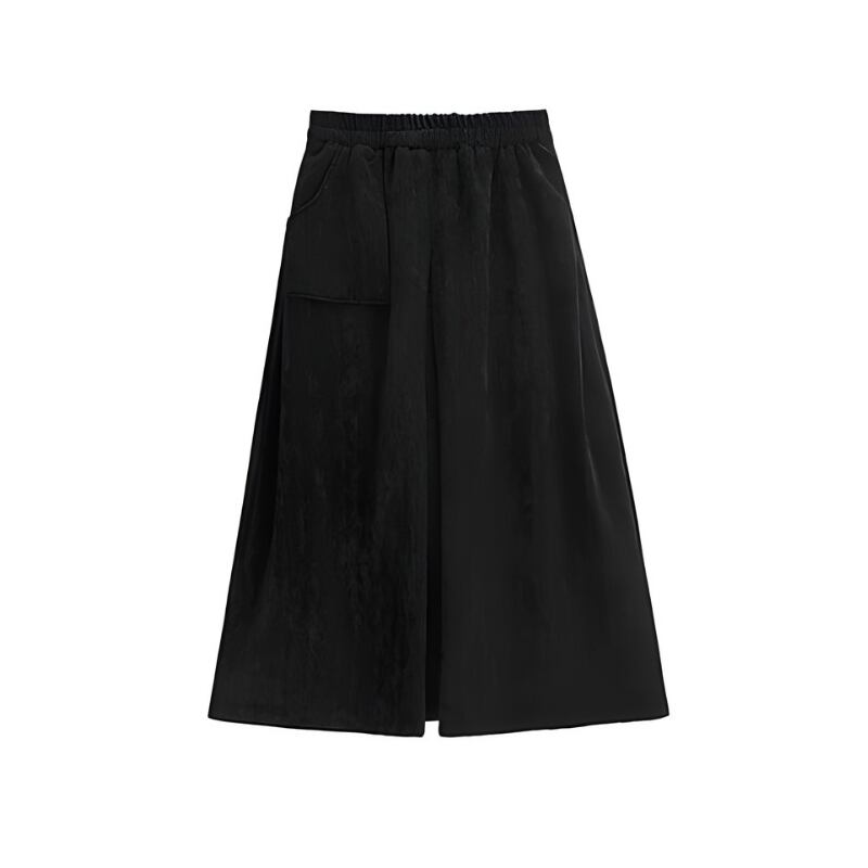 シンプルなロングスカートにクールな立体感を加え、実用性も兼ね備えています。