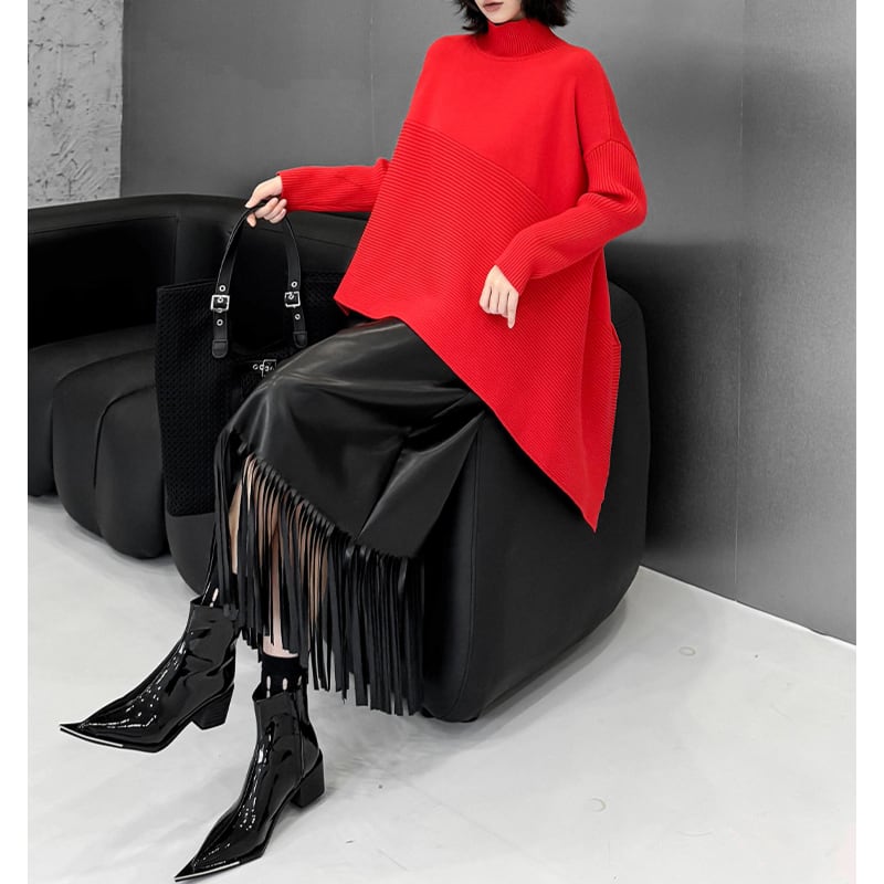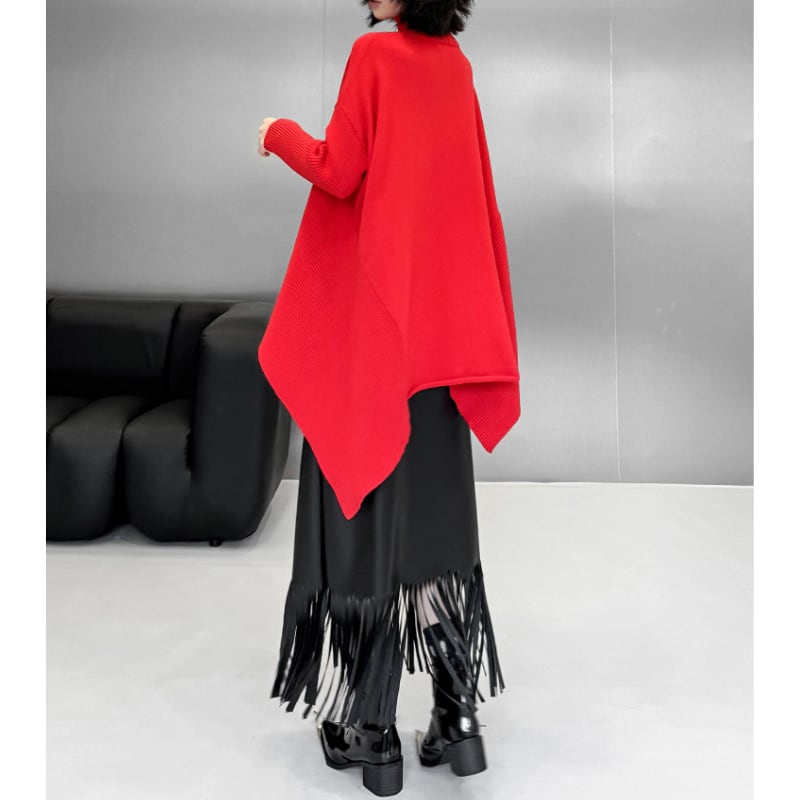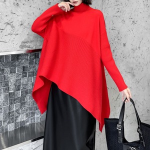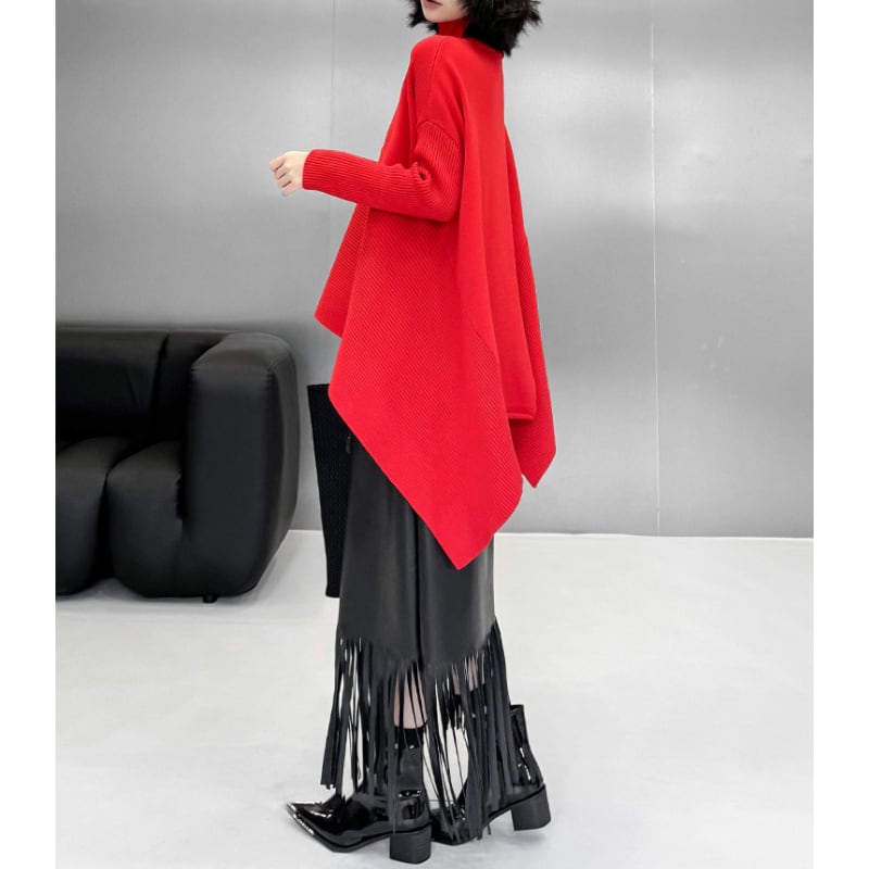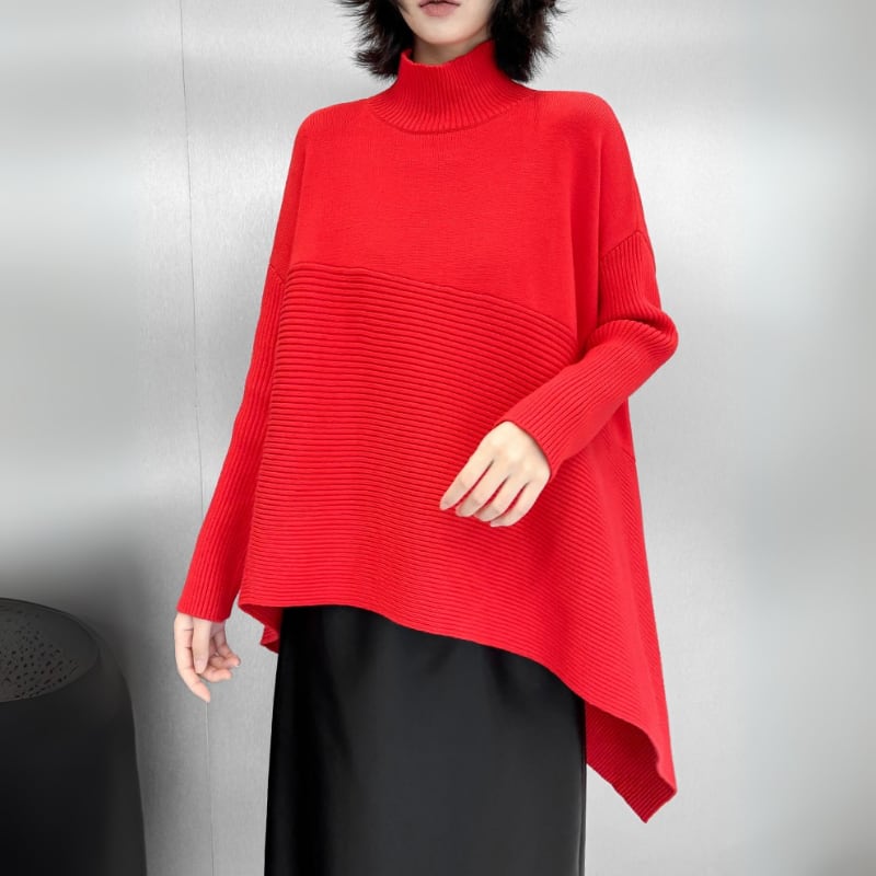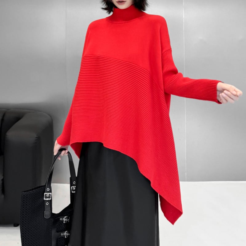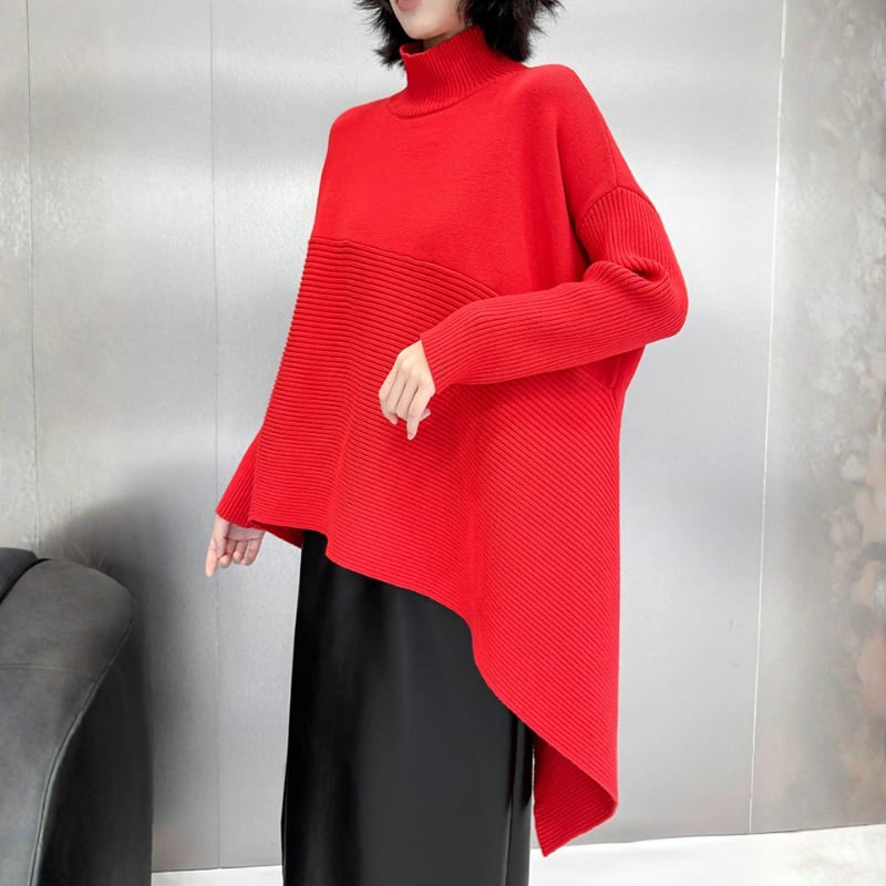 High-Neck Knit Asymmetric Hem Pullove H0280