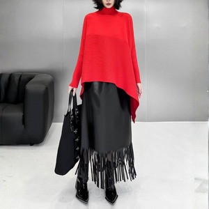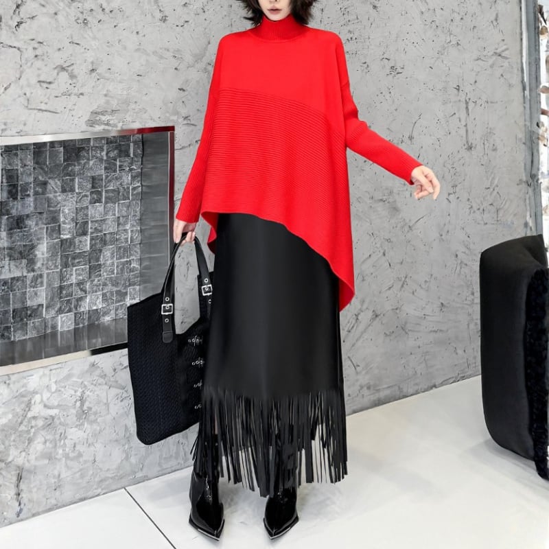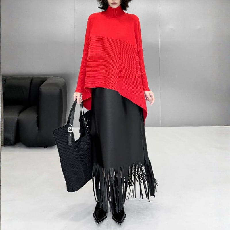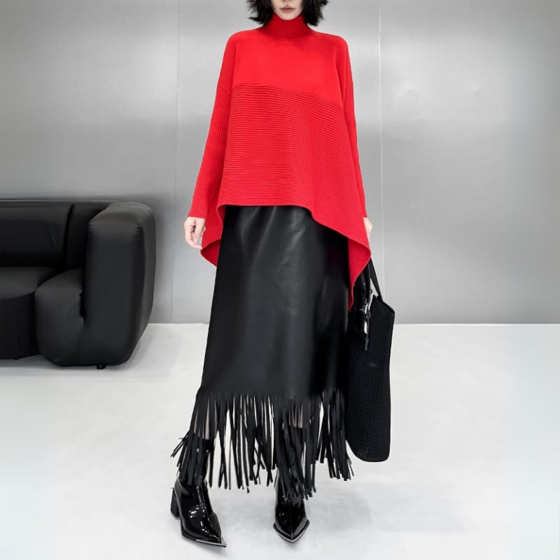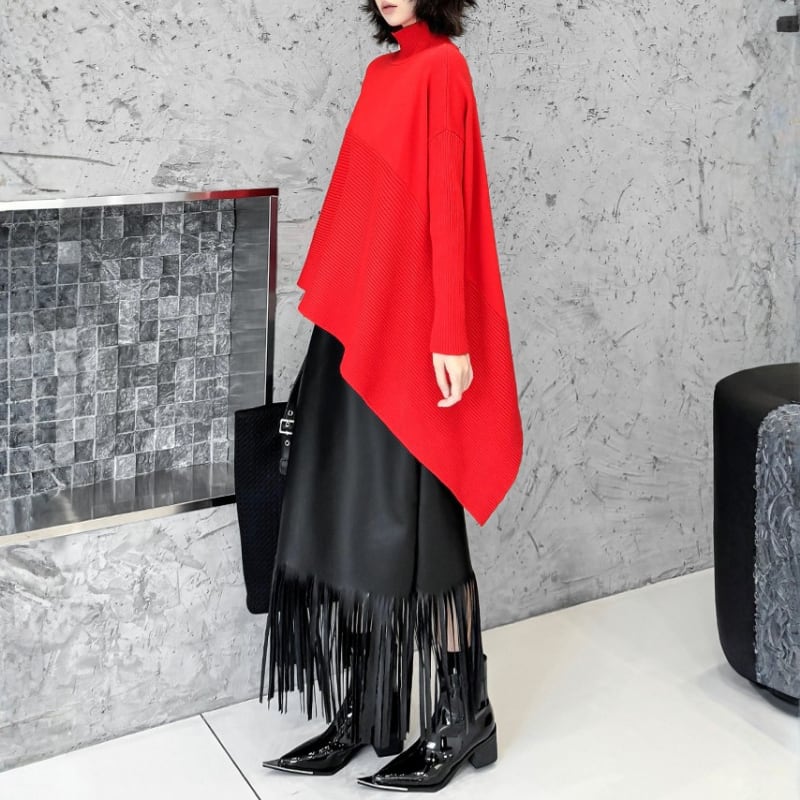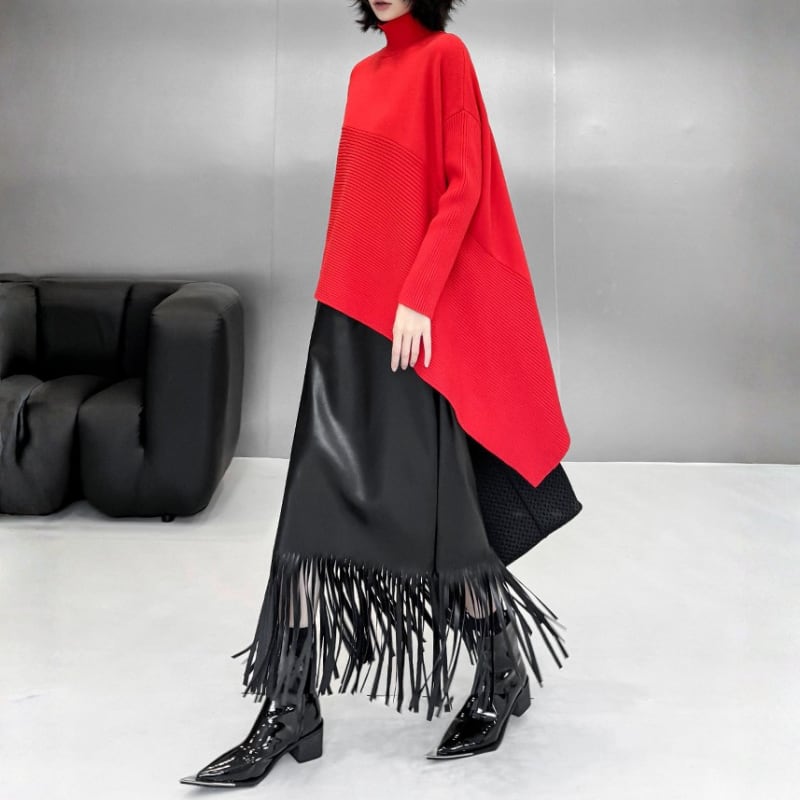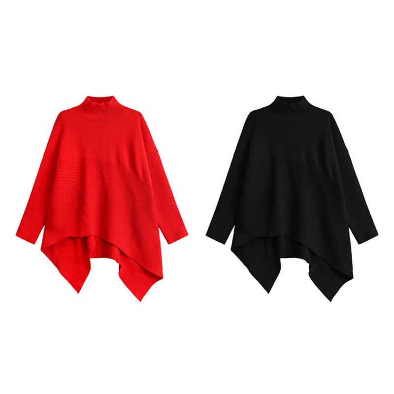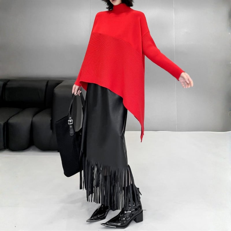High-Neck Knit Asymmetric Hem Pullove H0280