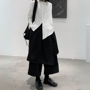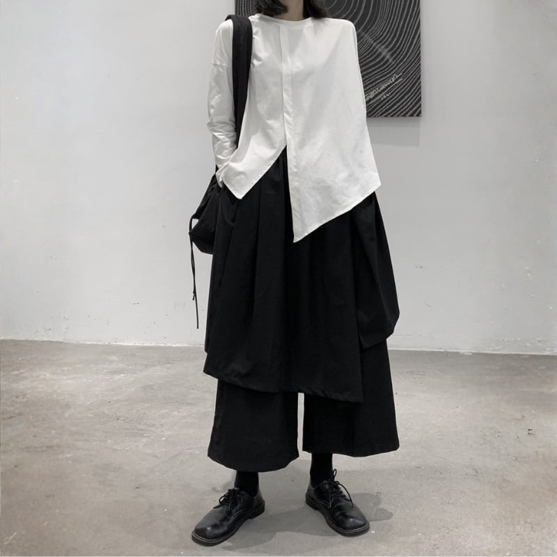 フロントからバックにかけて鋭角に落ちるアシンメトリーなヘムラインが、着こなしに躍動的なコントラストを与えます。