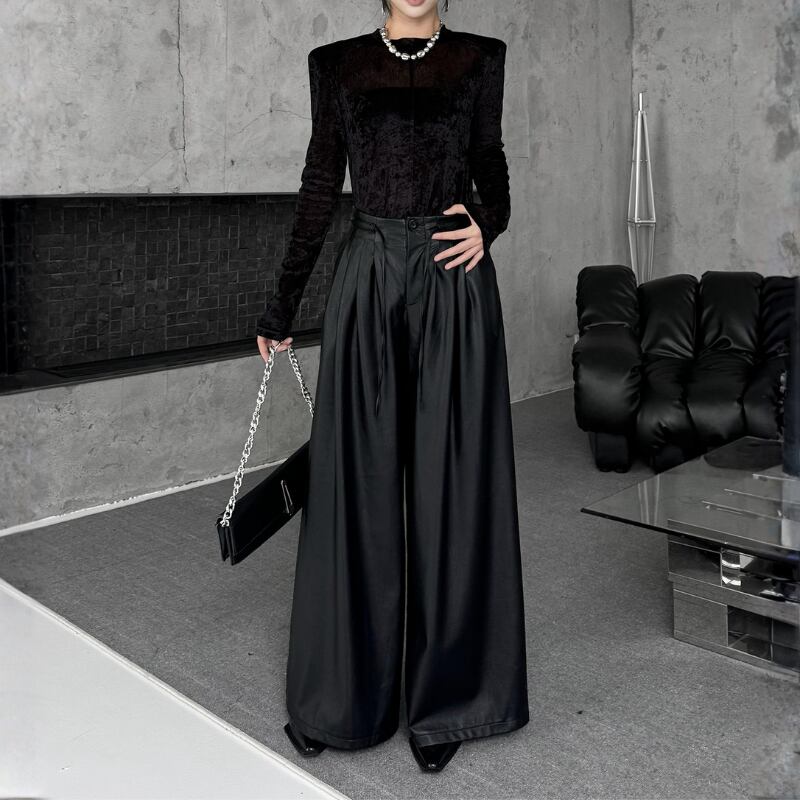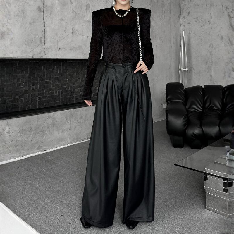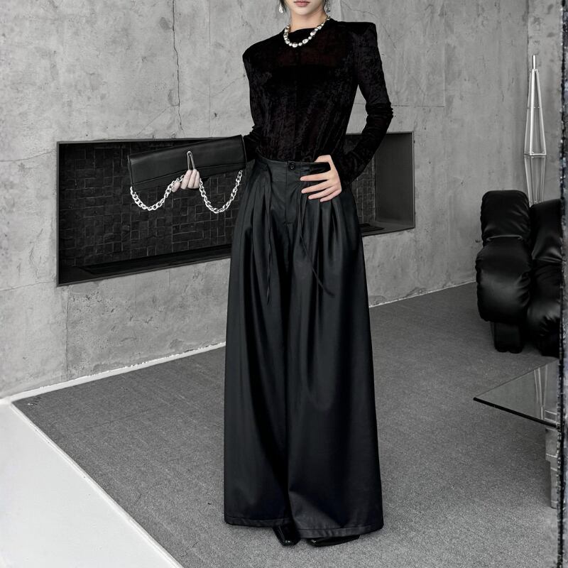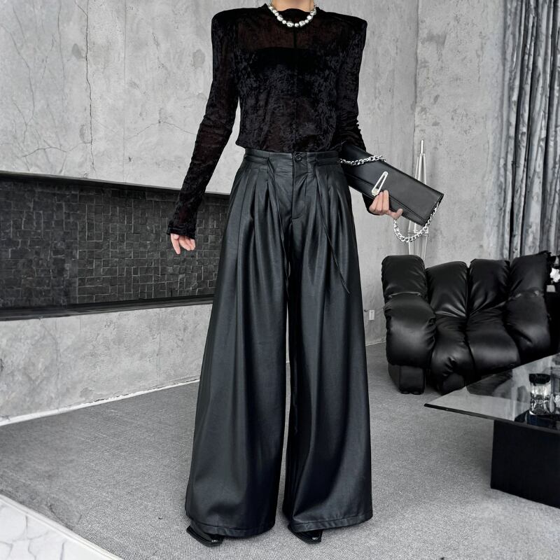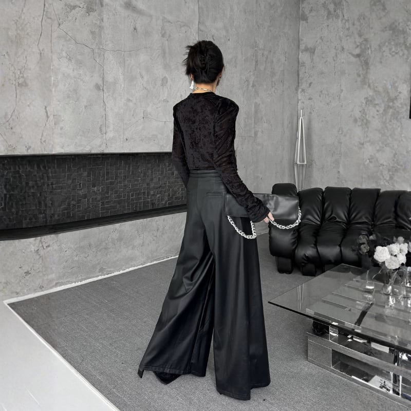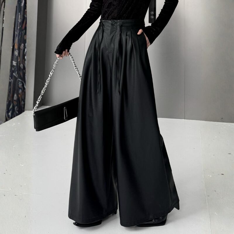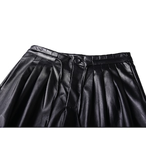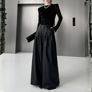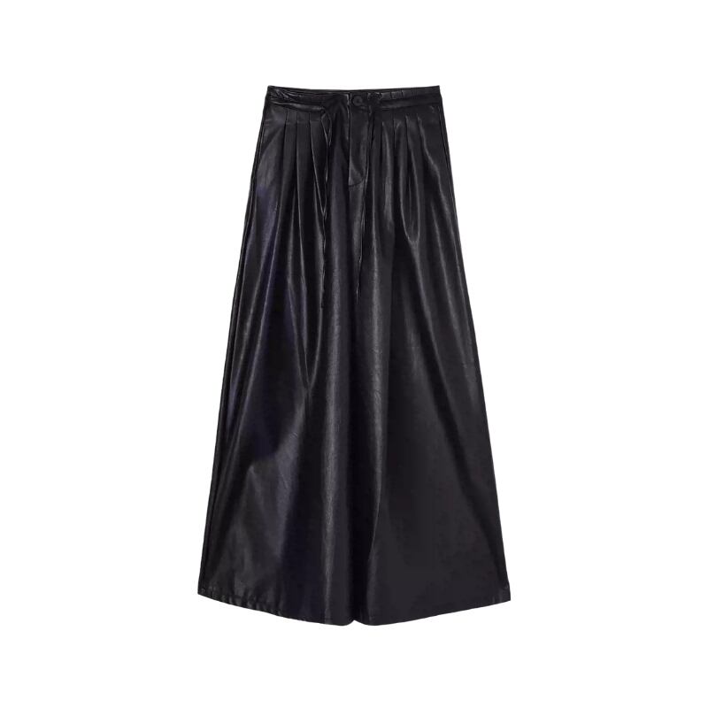 しなやかなフェイクレザーの質感が、歩くたびに優雅で鋭利なドレープを生み出します。