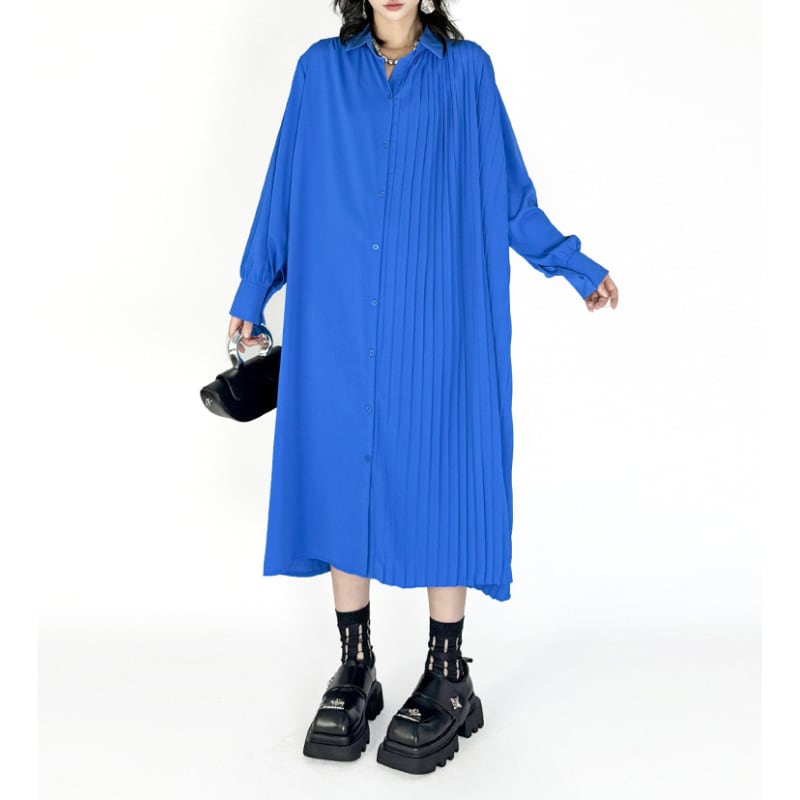 アシンメトリー プリーツ ロングシャツワンピース