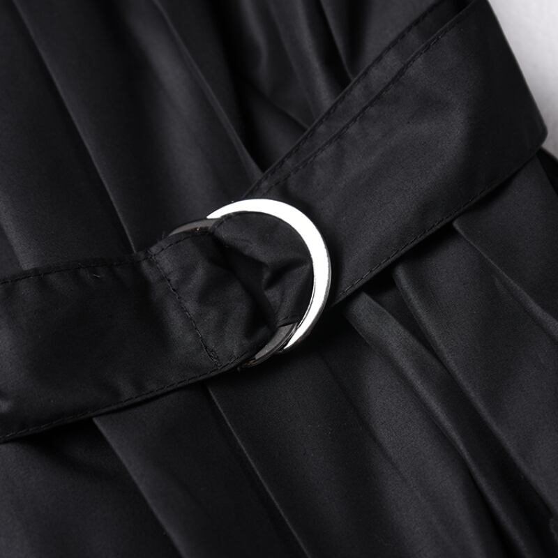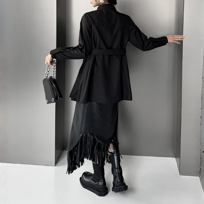 Dリング付きのベルトが配され、メリハリのあるシルエットを強調すると同時に、シャープなアクセントを加えます。