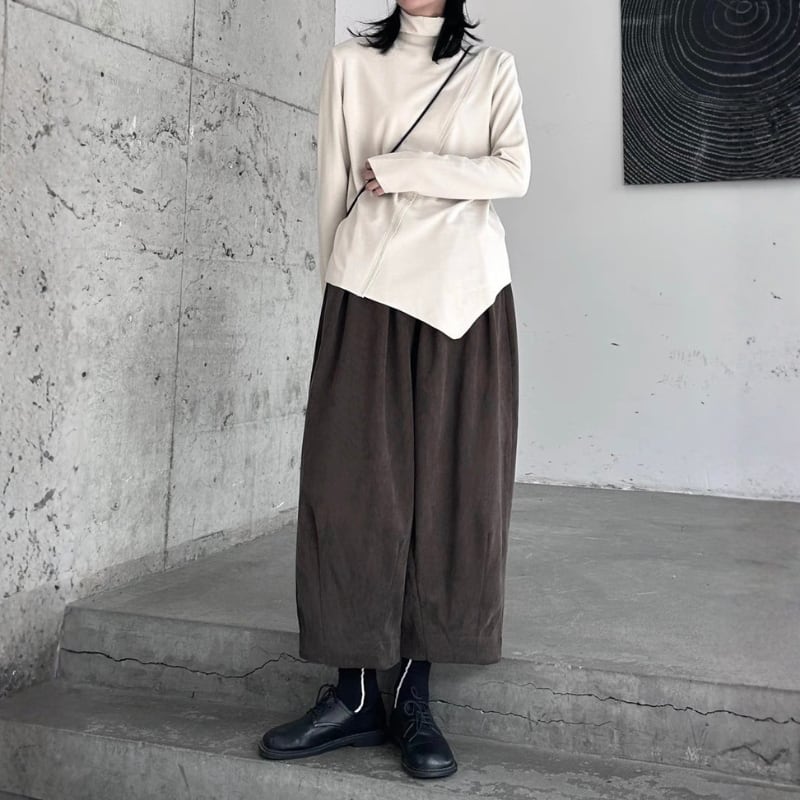 ハイネックと、同様に斜めにカットされた変形ヘムが、全体のムードをクールに統一。