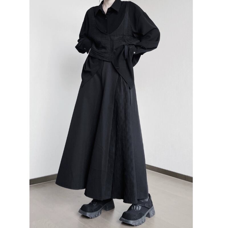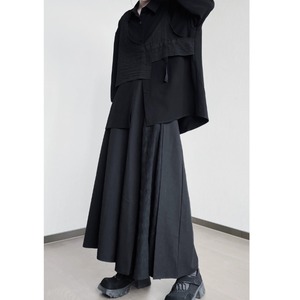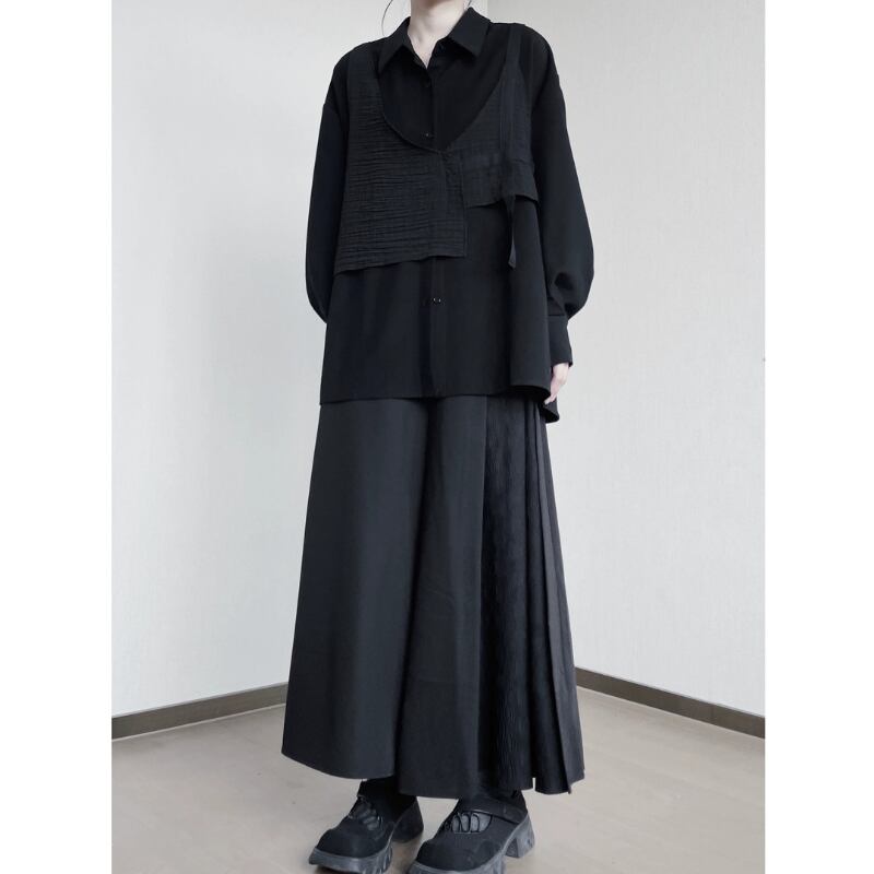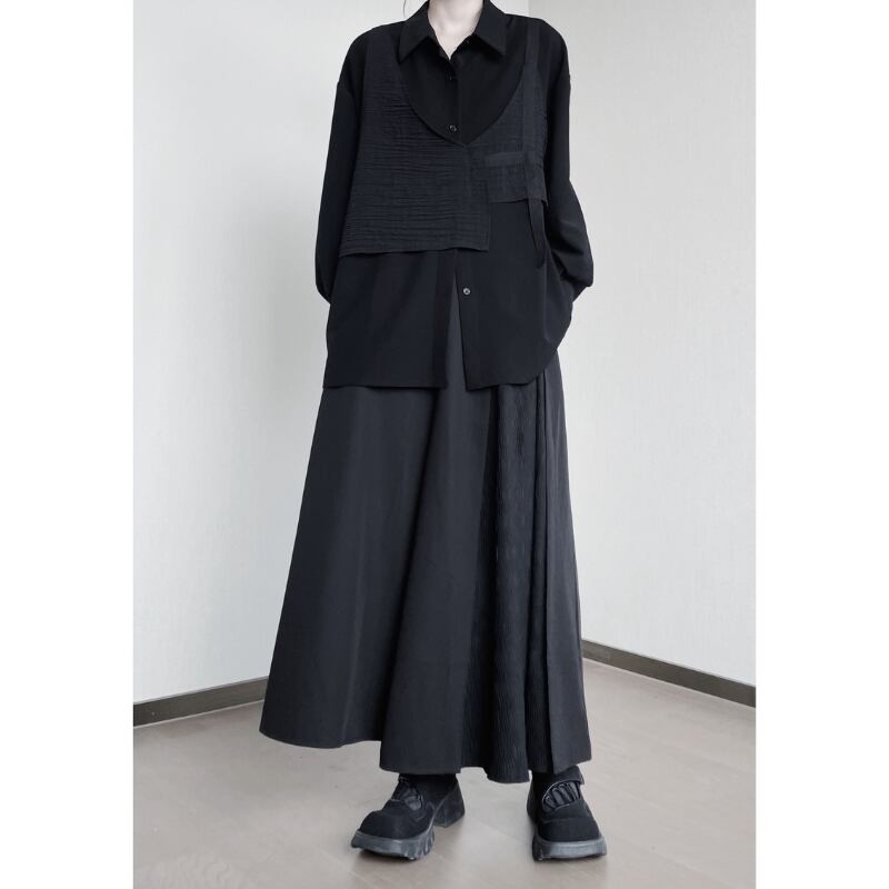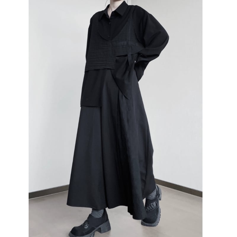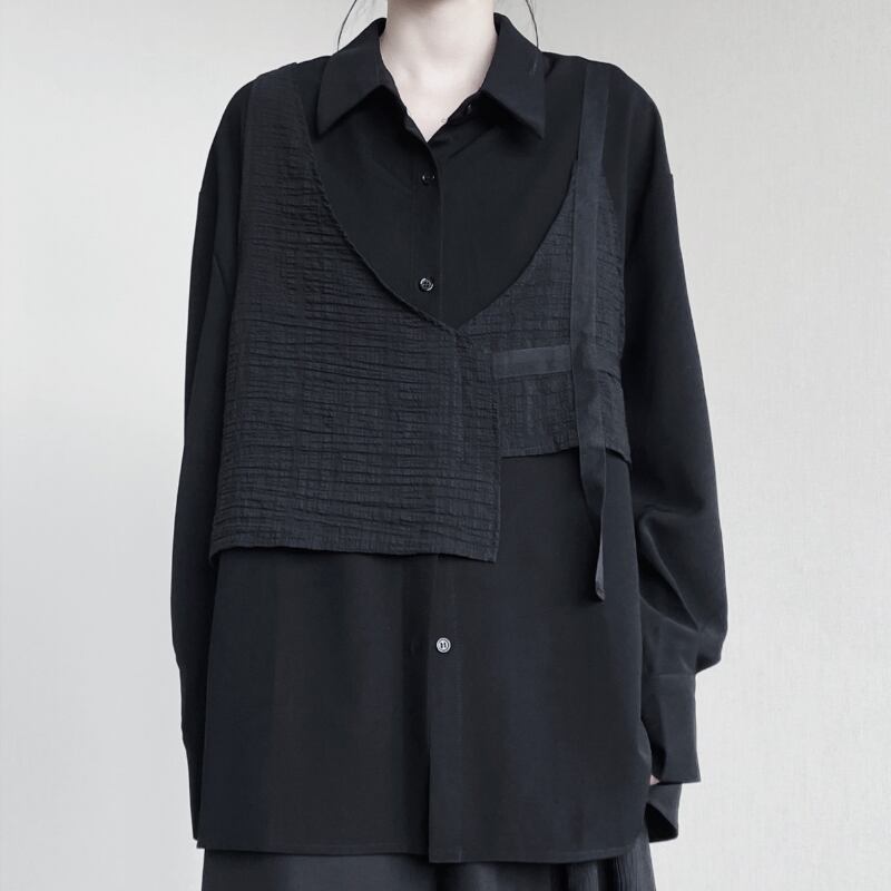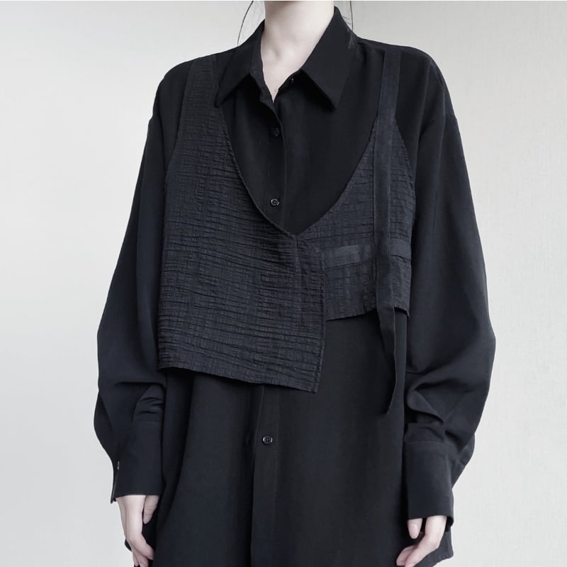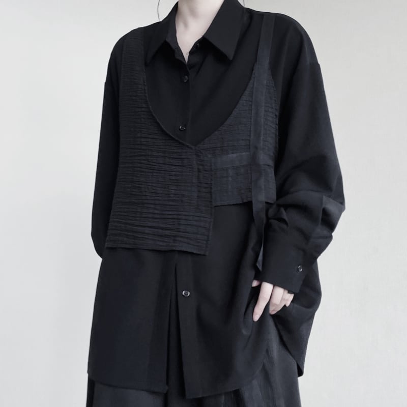ベーシックなオーバーサイズシャツに、ショート丈のベストパーツをフロントにドッキング。