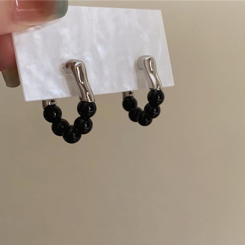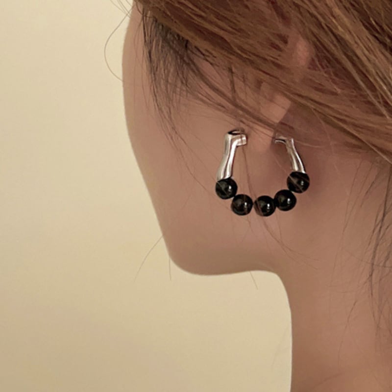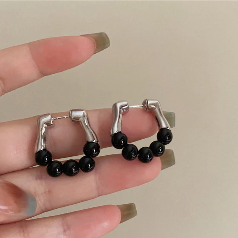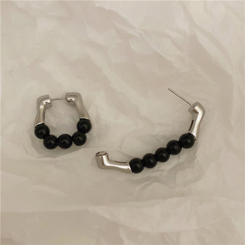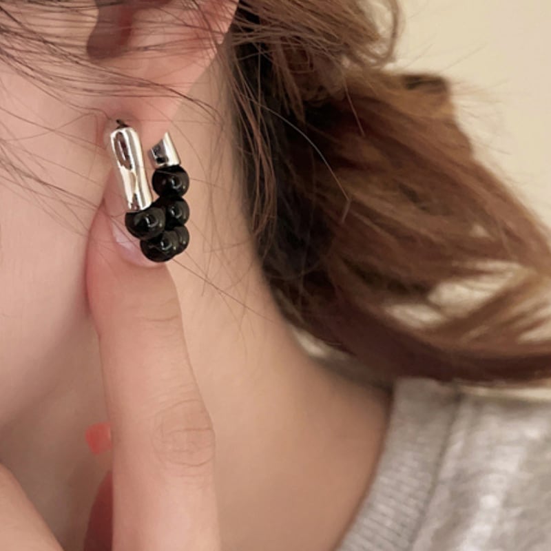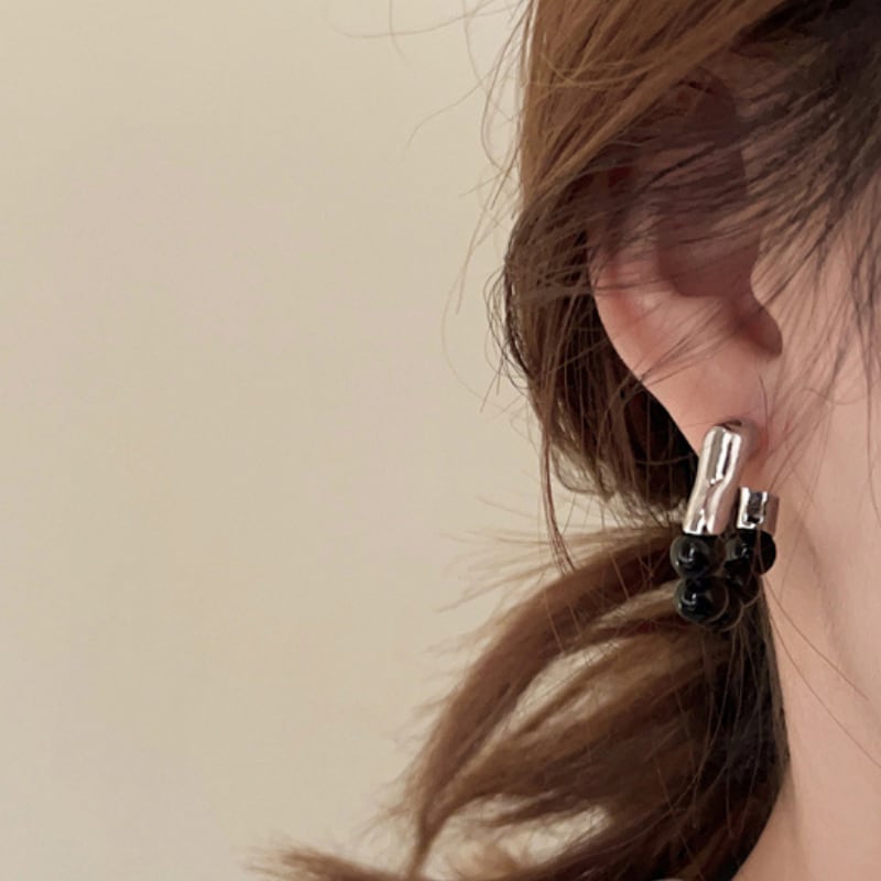 モダンなメタルバーと、艶やかなブラックビーズを組み合わせた、構築的なフープピアス。