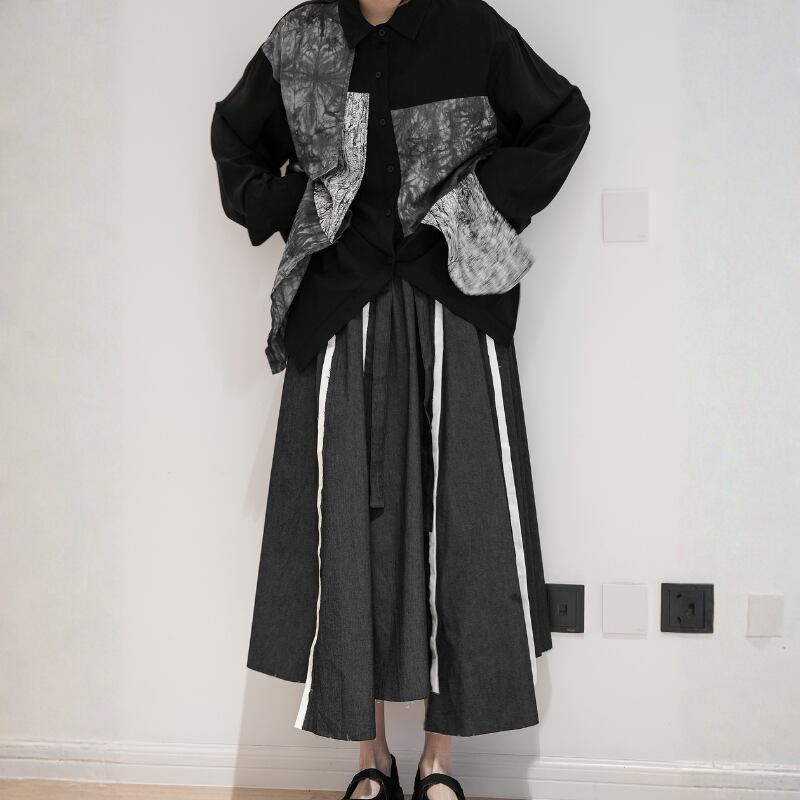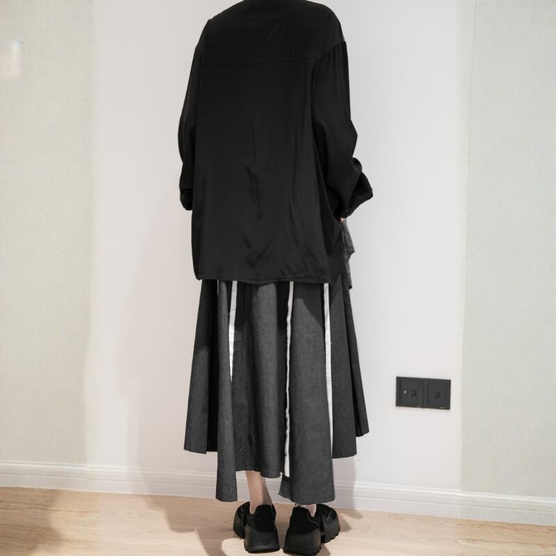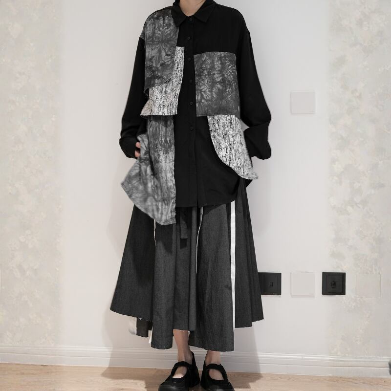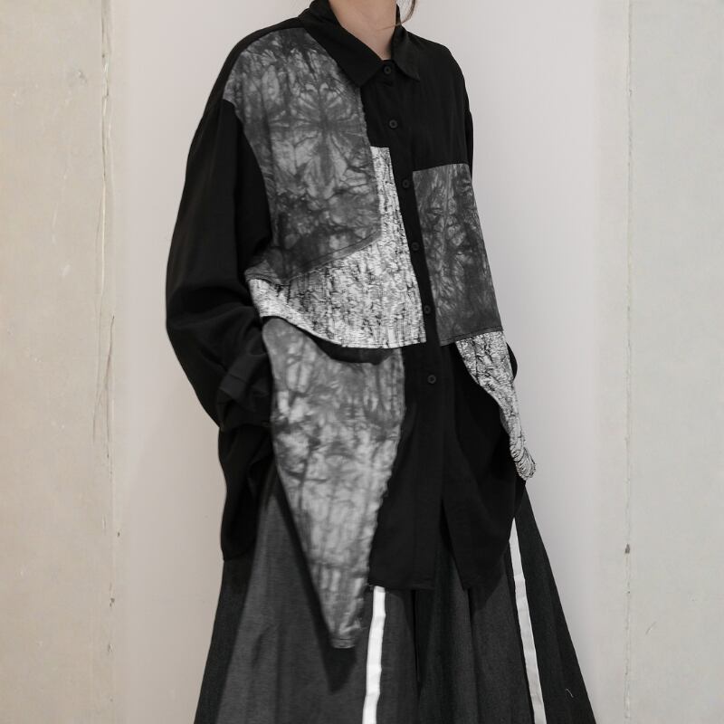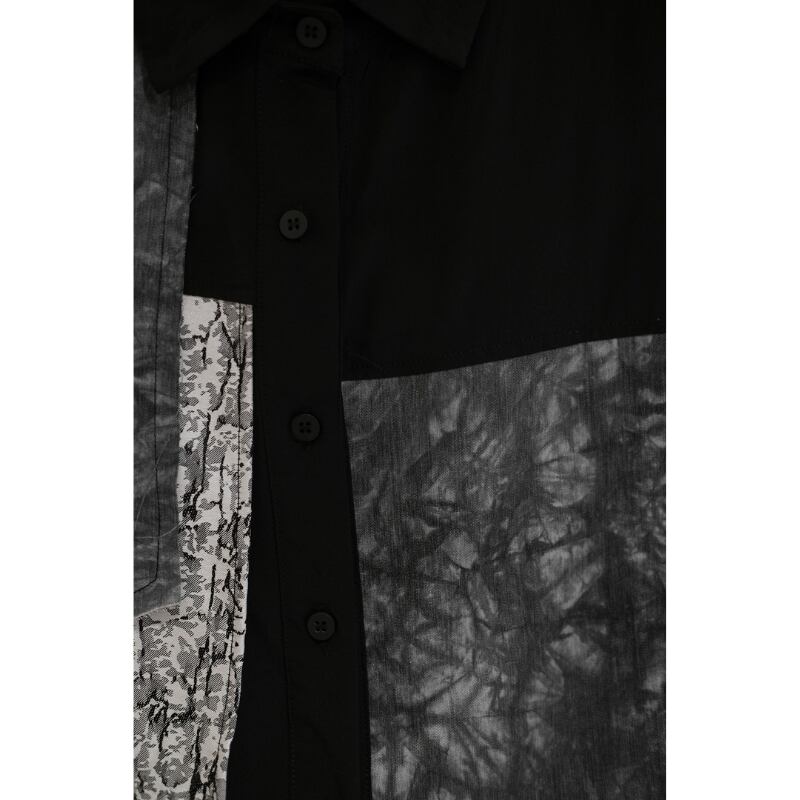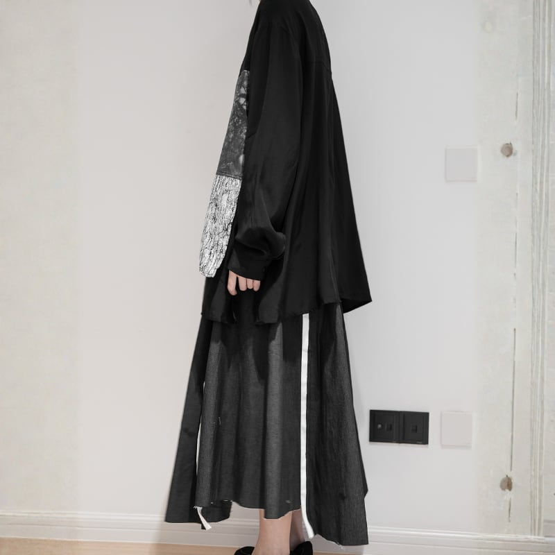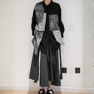 ベーシックなブラックシャツに、モードな崩しを加えたデザインピース。