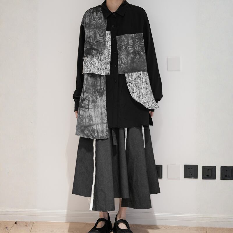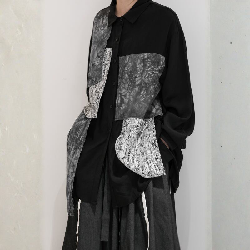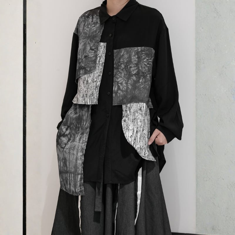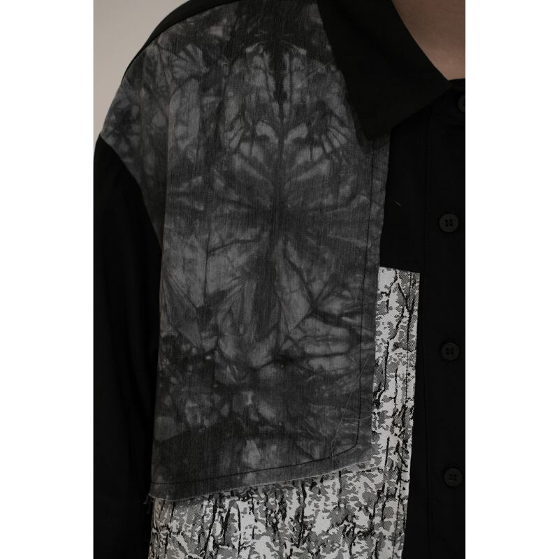 不規則に配置されたアブストラクト柄のパッチワークが、ソリッドな装いに奥行きを与えます。