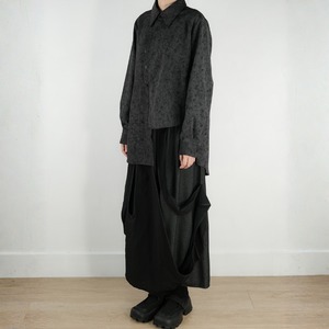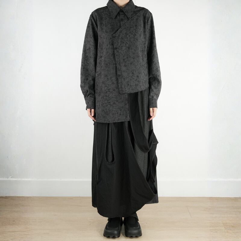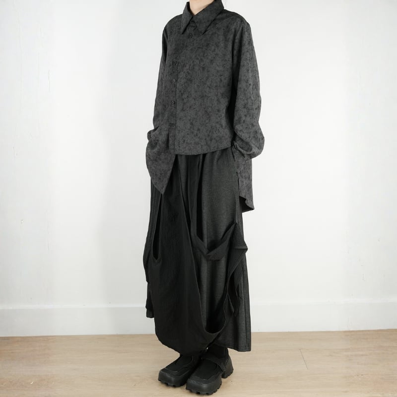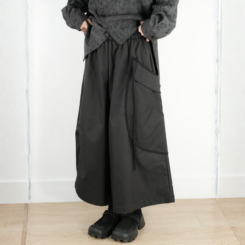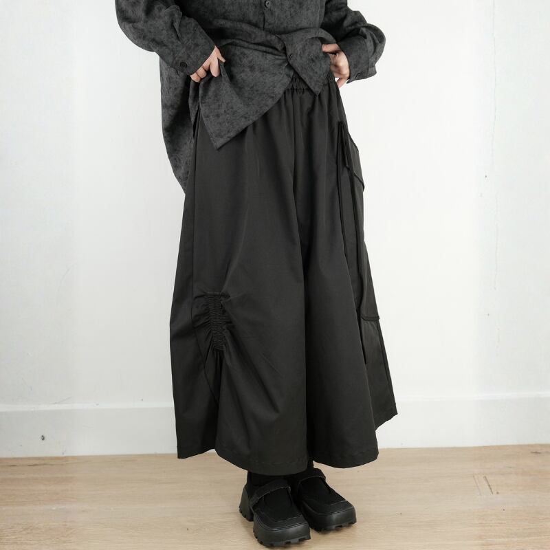 大きなカーゴポケットやギャザーが、ソリッドなブラックに遊び心をプラス。